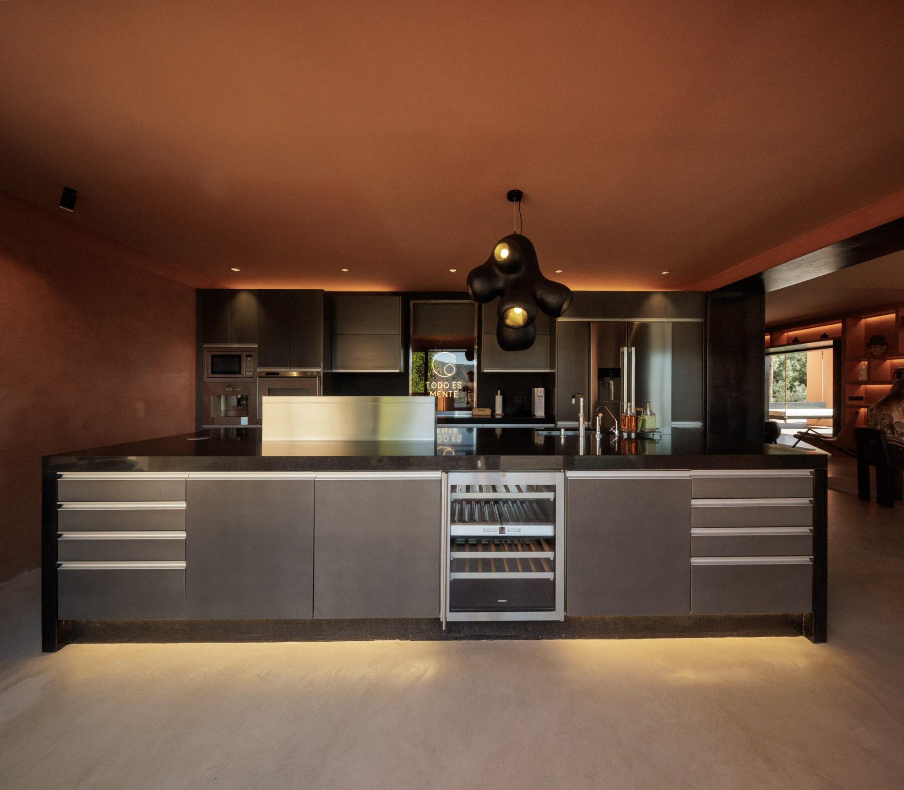Villa Kalani’s contemporary kitchen sits adjacent to the main dining area in an open-plan layout designed for relaxed entertaining. A central black ceramic island anchors the space beneath statement pendant lighting, with sliding glass doors opening directly onto the terrace and outdoor kitchen.