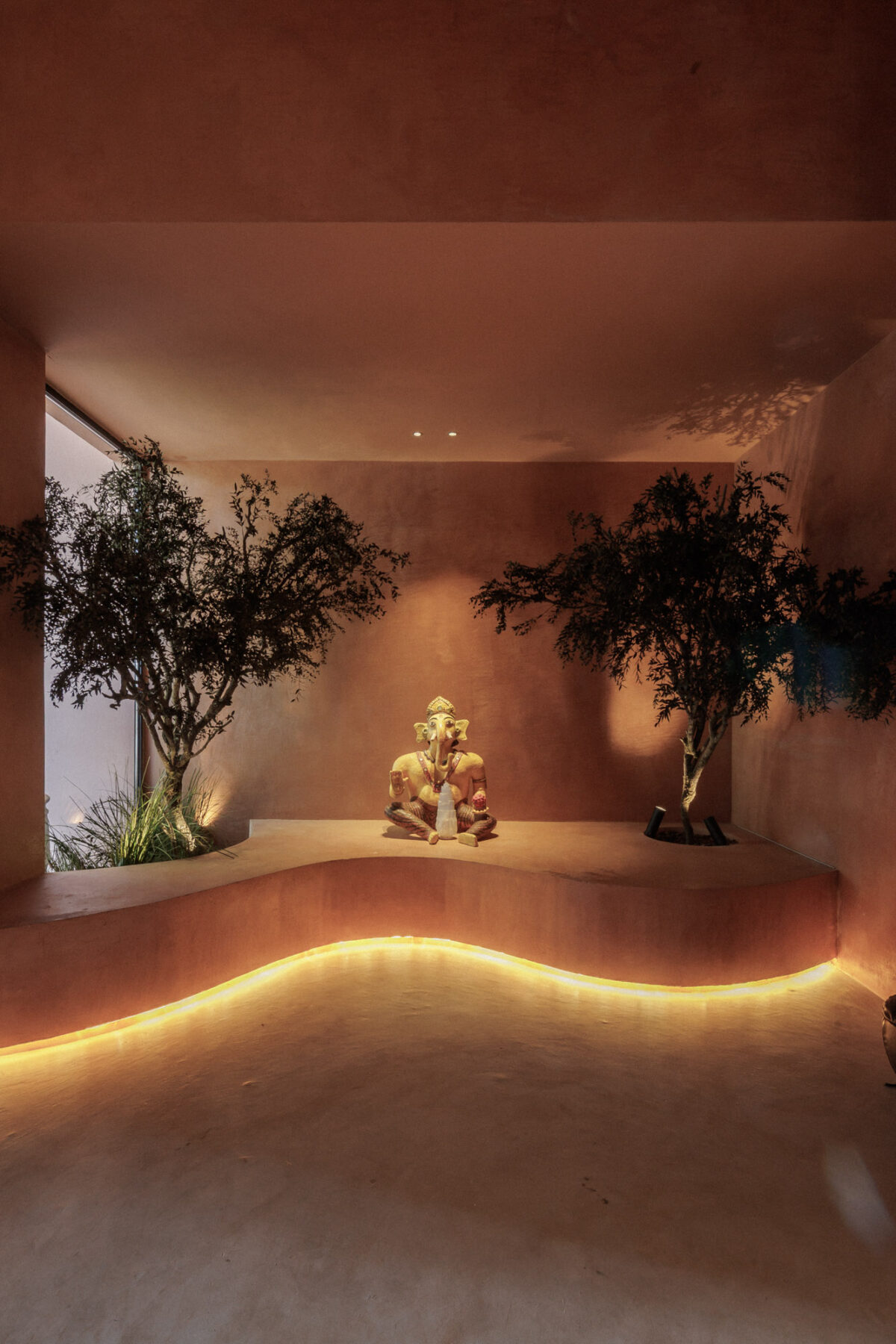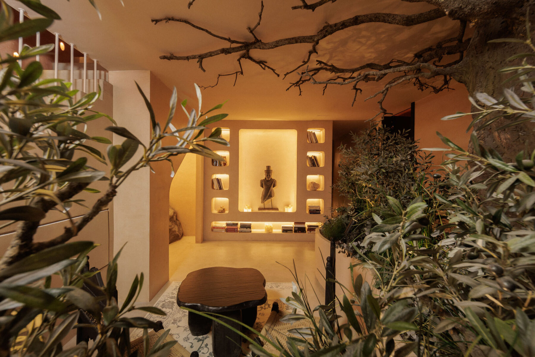 On the lower ground floor, a striking lounge space features sculptural planting and bespoke olive trees that create the feeling of an enchanted indoor forest.