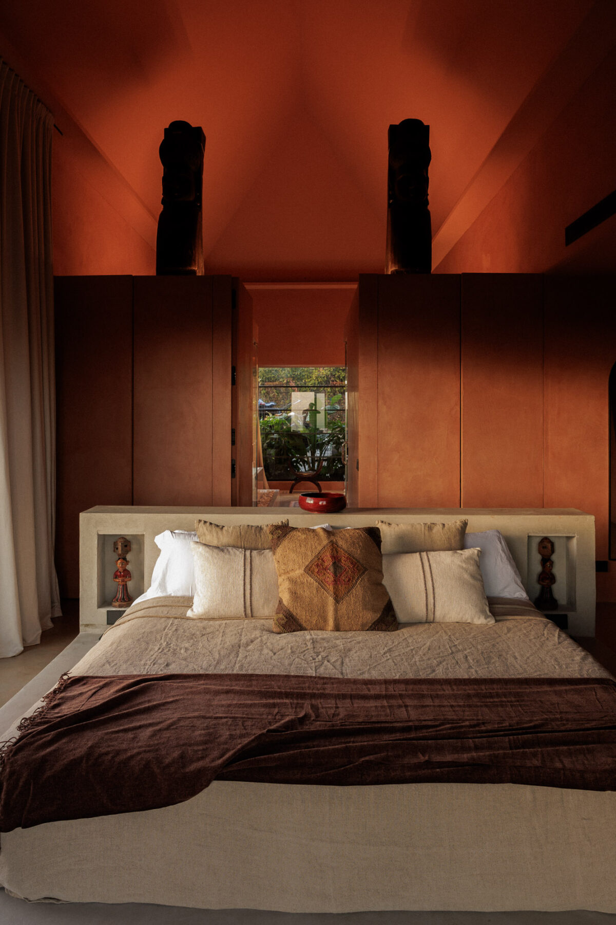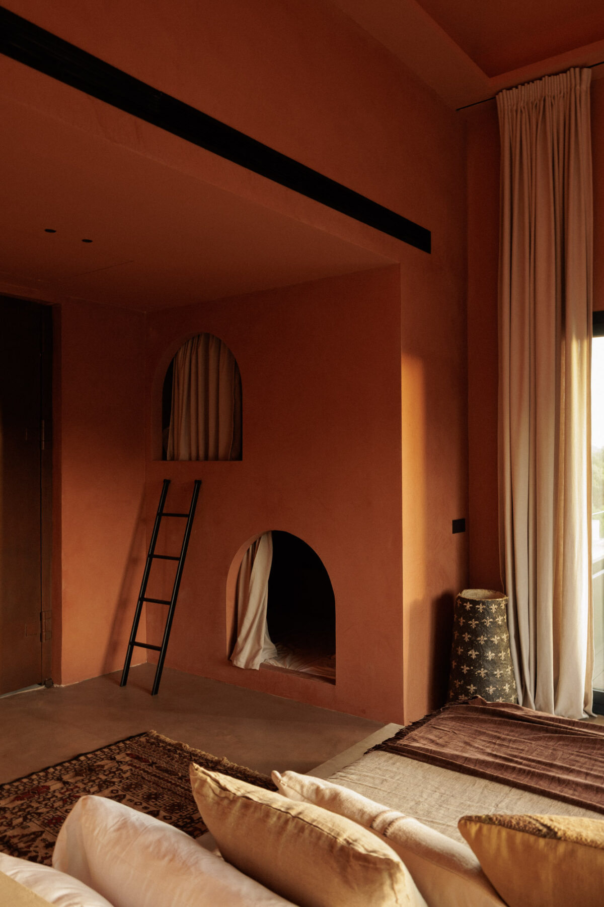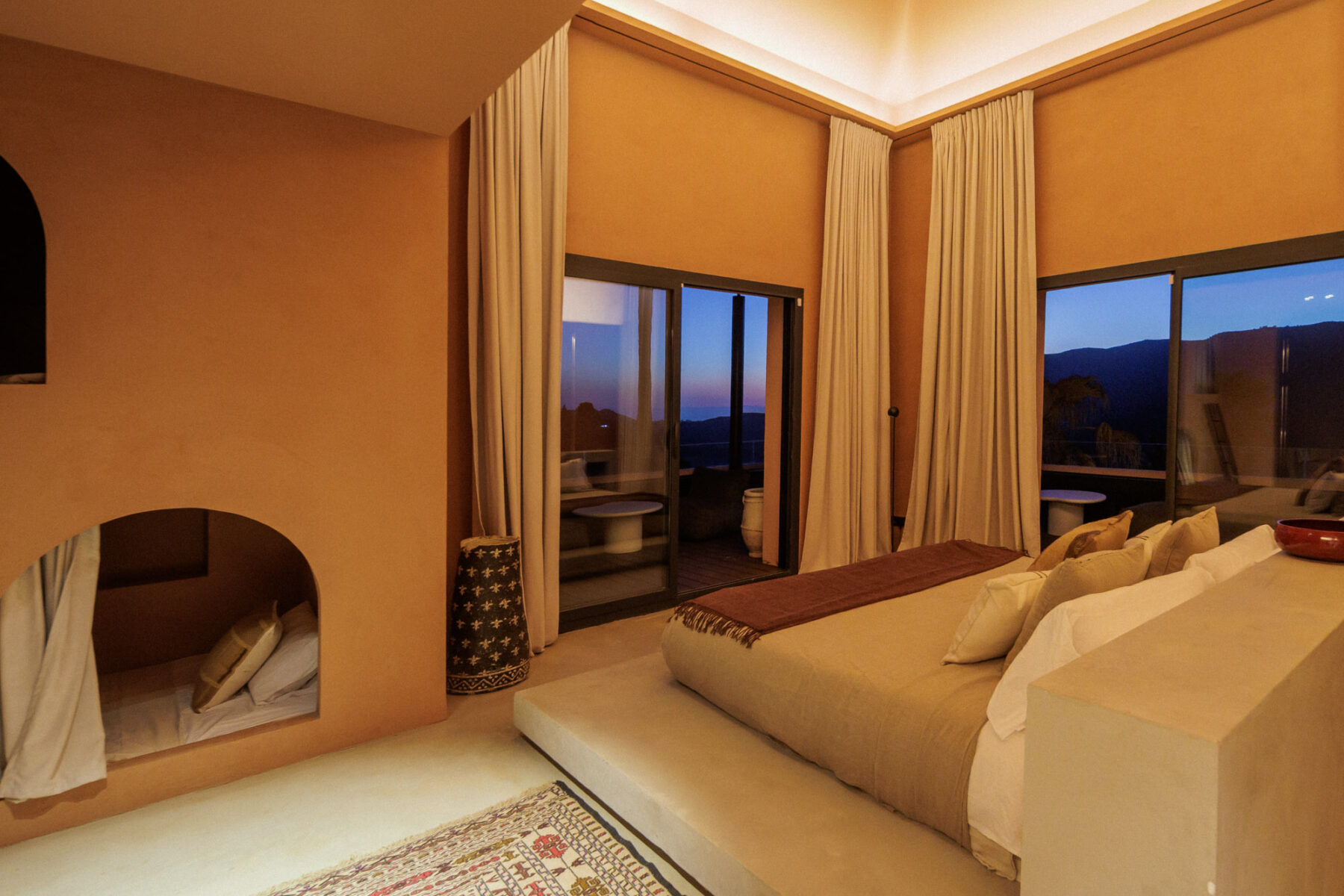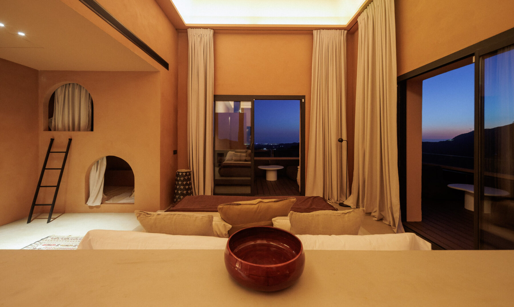 Principal Bedroom 1: Located on the entrance level. Spacious suite with king-sized bed (180cm x 200cm, can be split into twins) positioned centrally within the room. Includes built-in wardrobes and distinctive cave-style bunk beds integrated into the wall. Sliding glass doors open onto a private terrace. Double-height ceiling and warm-toned interior palette.