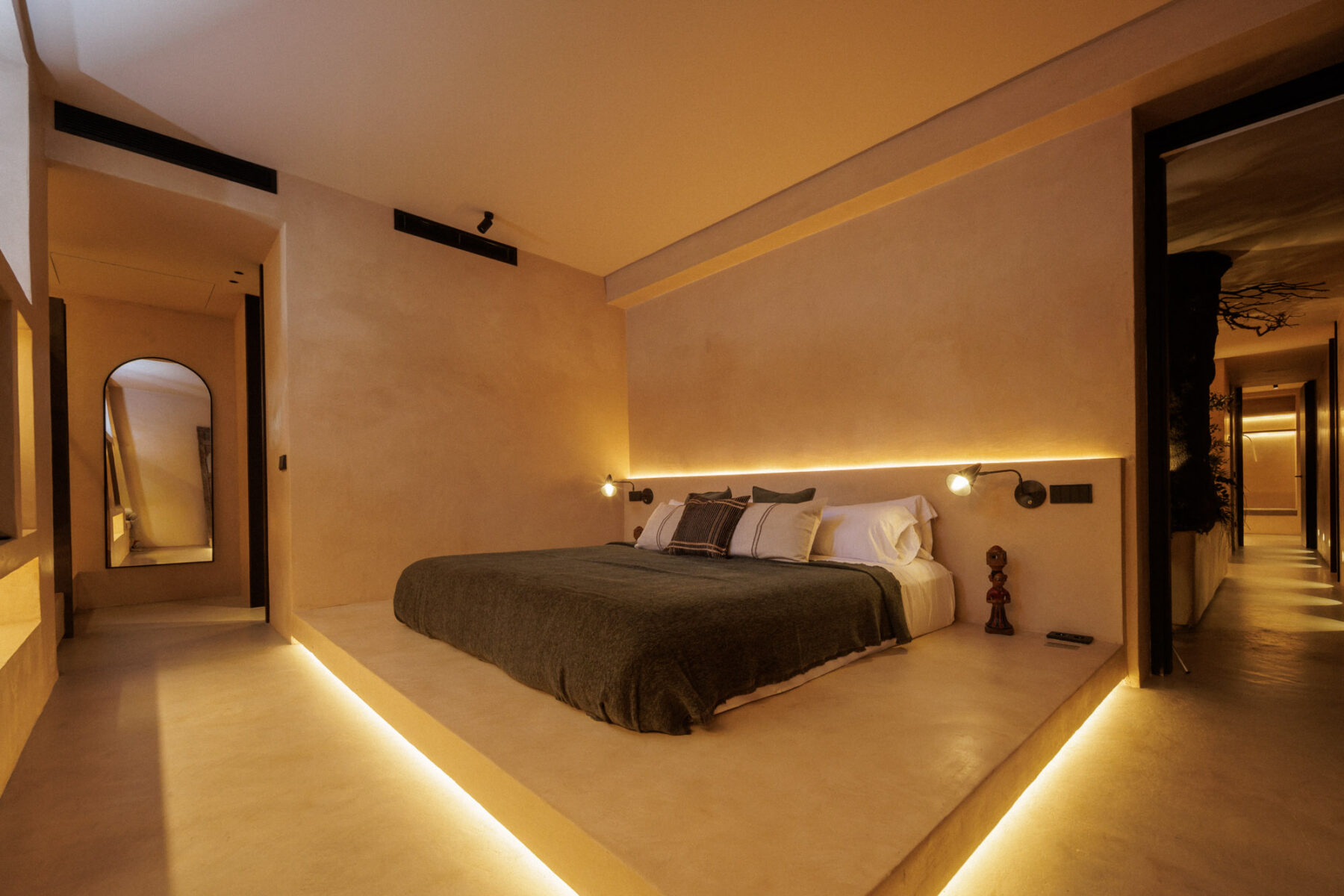 Guest Bedroom 4: Located on the lower ground floor near the cinema room. King-sized bed (180cm x 200cm, can be split into twins) on an elevated platform. Stone shelving unit with widescreen television and freestanding Moroccan-style arched mirror. Walk-in wardrobe.