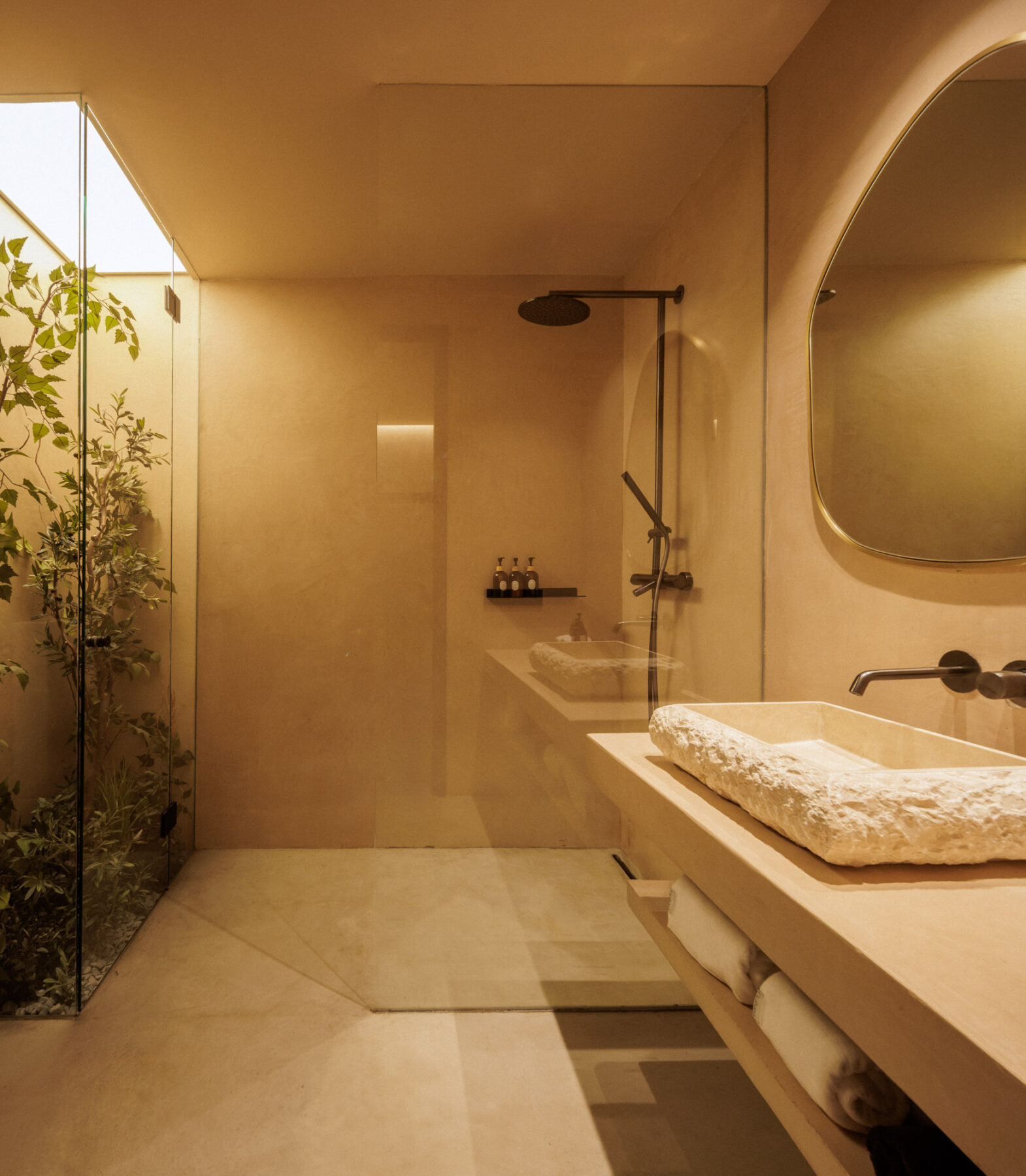 En-suite bathroom with walk-in rain shower and planting feature behind a glass wall.
