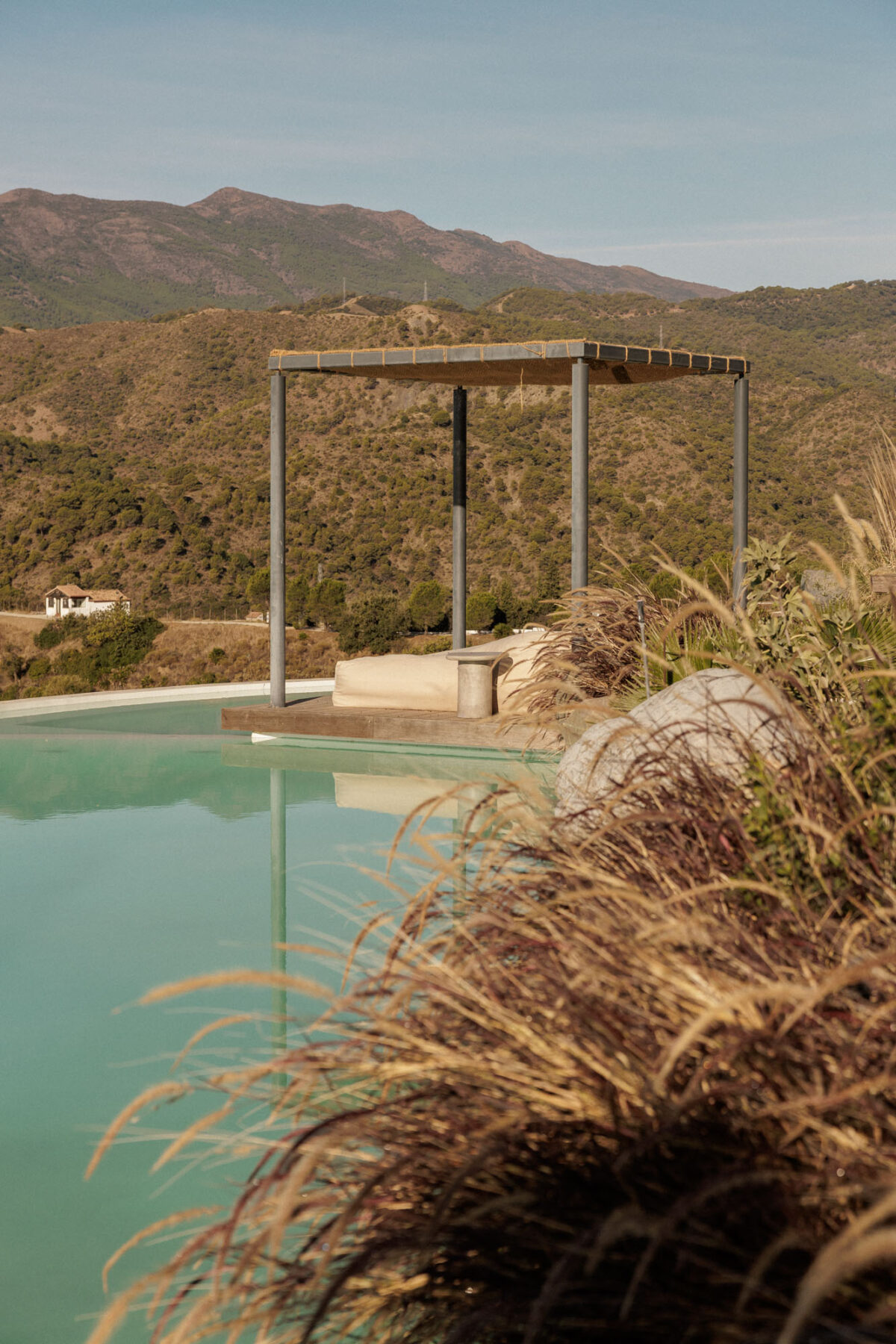 At the bottom of the garden sits the infinity pool, where a deck extends across the water to a generous daybed. It’s an idyllic spot for long afternoons with a book, slipping between sun and shade with something chilled in hand, lulled by the soft birdsong of the surrounding valley.