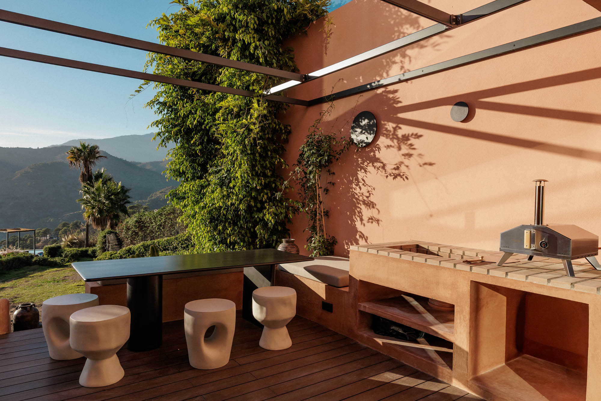 Guests can also dine outdoors on the terraces, where multiple seating areas allow for relaxed breakfasts, long lunches and sunset dinners beside the outdoor kitchen and pizza oven.