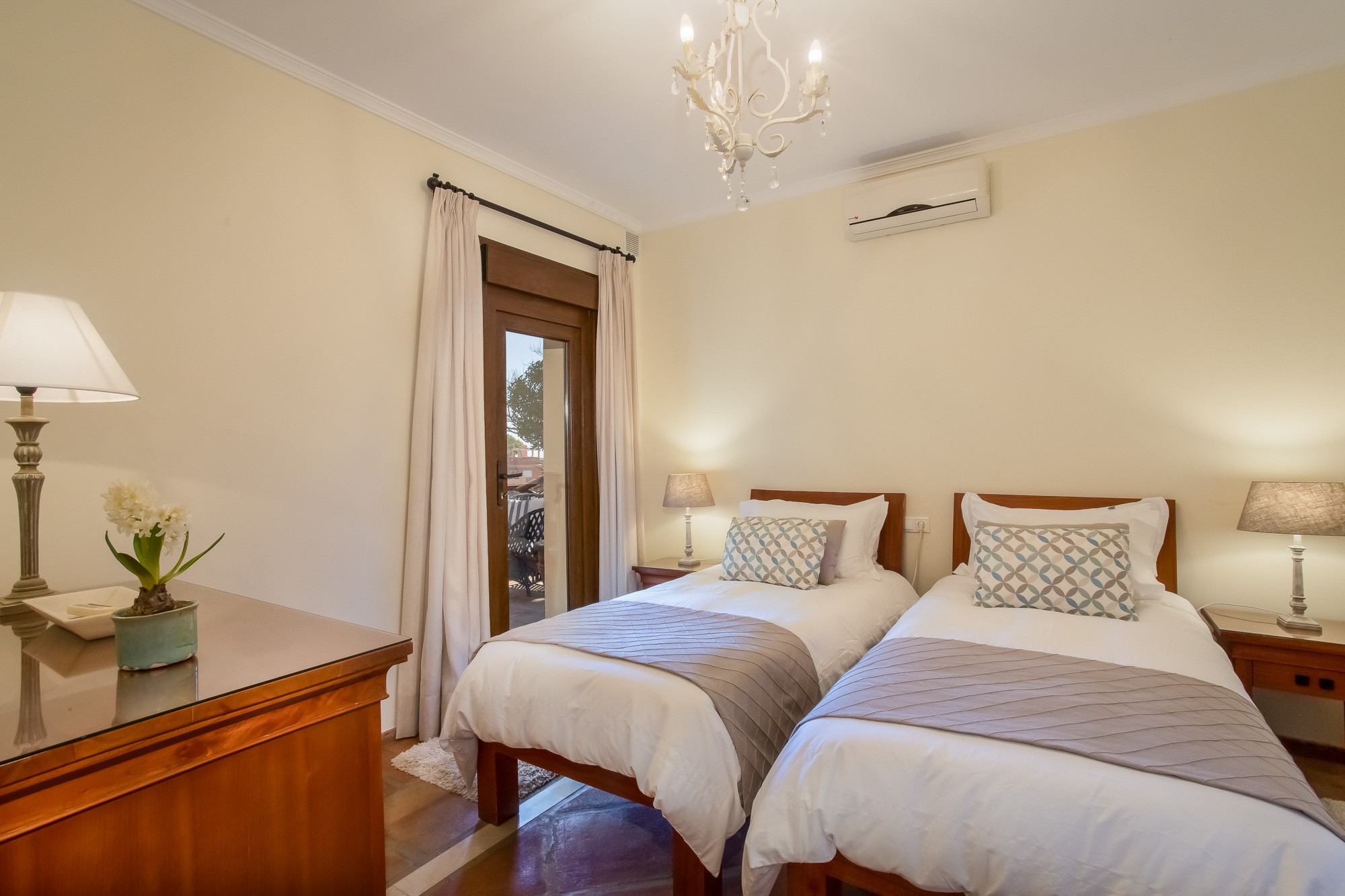 Bedroom 3: Ground floor guest bedroom with twin, en-suite full bathroom with bath and shower area. Leads out to the same furnished patio as bedroom 2 and gardens.