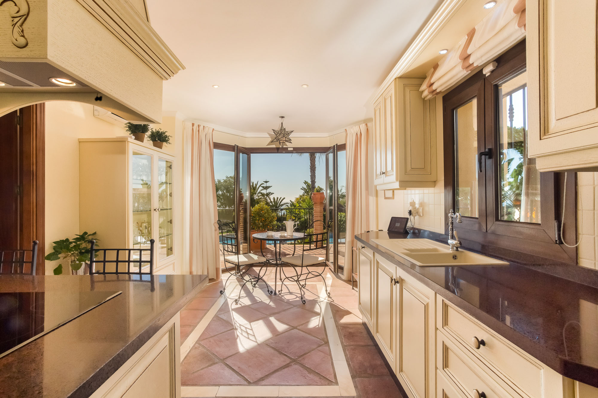 The cottage-style kitchen offers black granite worktops, a well sized refrigerator, an induction hob, and everyday conveniences including a Nespresso and wine rack. The kitchen offers a small breakfast table that overlooks the pool and sea, and opens onto the main terrace with further outdoor dining for 10 overlooking the pool.