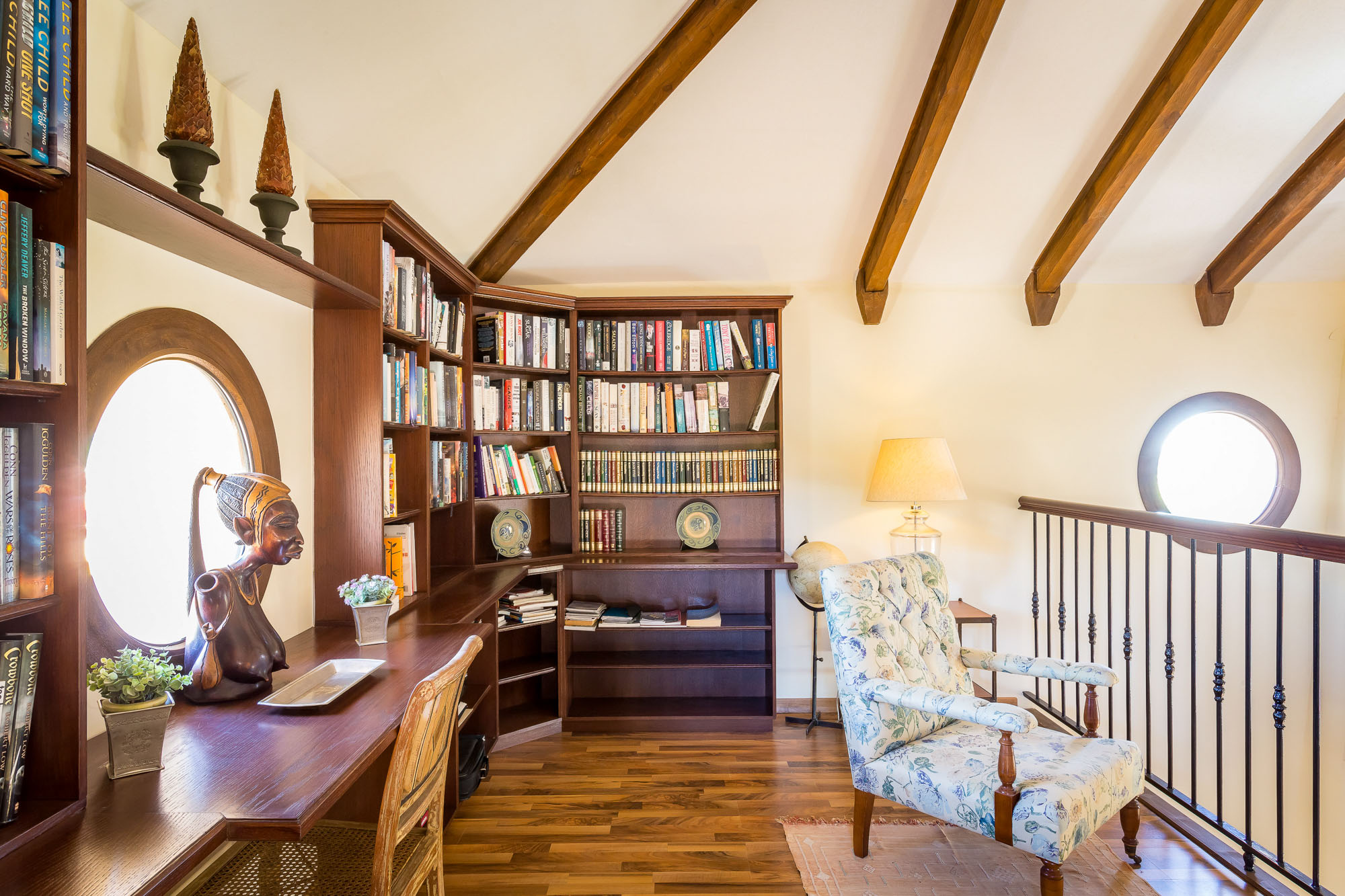 A mezzanine overlooks the living area and reading library. A corner of the living room houses an electric piano. An office nook is carved out of a well-loved bureau. A classical sofa and elegant chairs flank an open fireplace.
