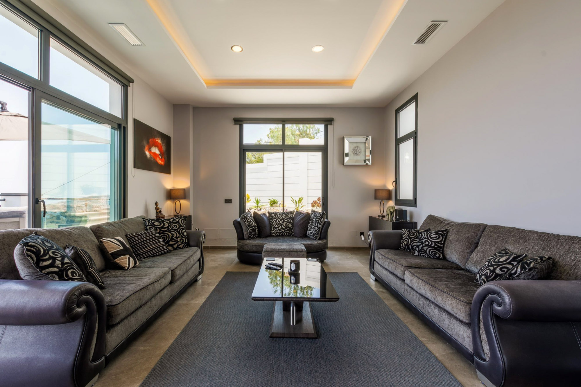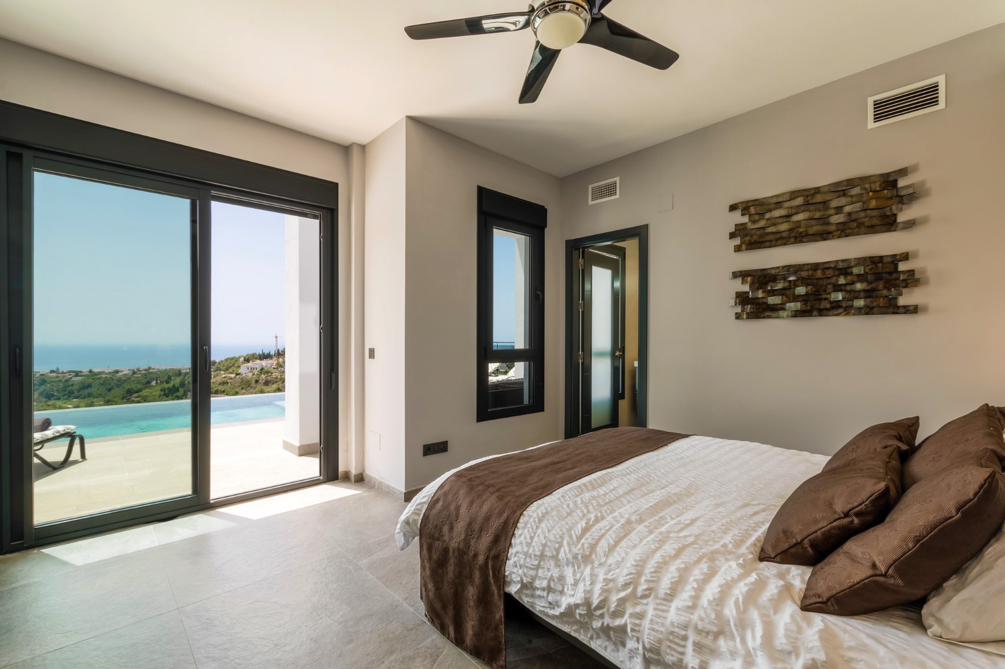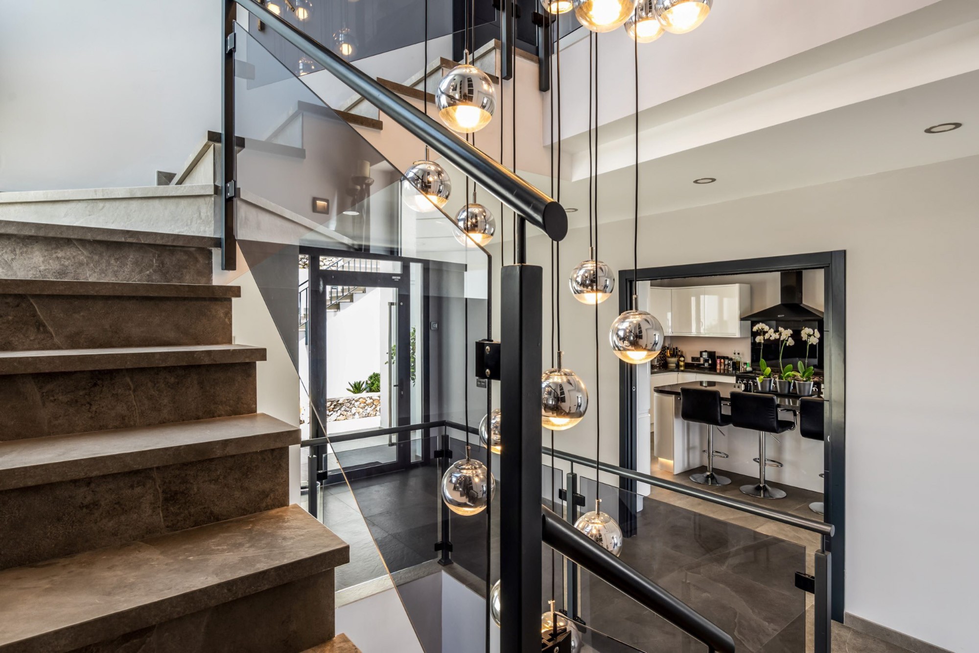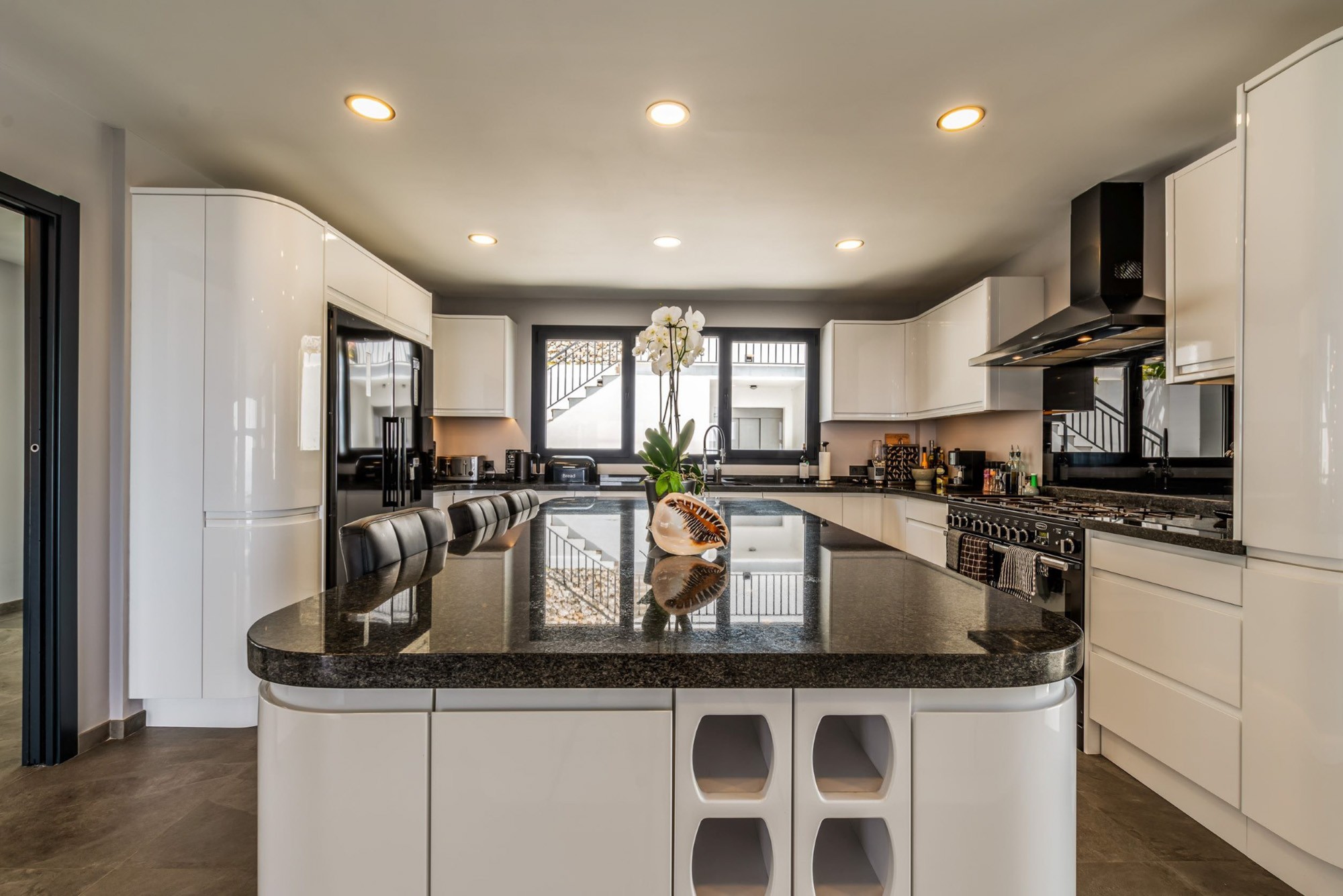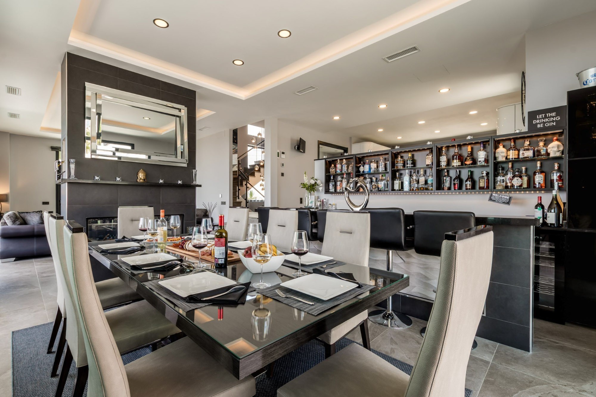 The ground floor contains a large contemporary kitchen, expertly stocked with every modern amenity one could wish for. A series of steps lead down into an open-plan living room-diner with a stylish black-granite bar, eight-seater table, and comfortable sitting room. Wall-to-wall windows display dazzling views of the surrounding countryside: olive groves, vineyards, shadowy mountains and a stretch of Mediterranean sea.