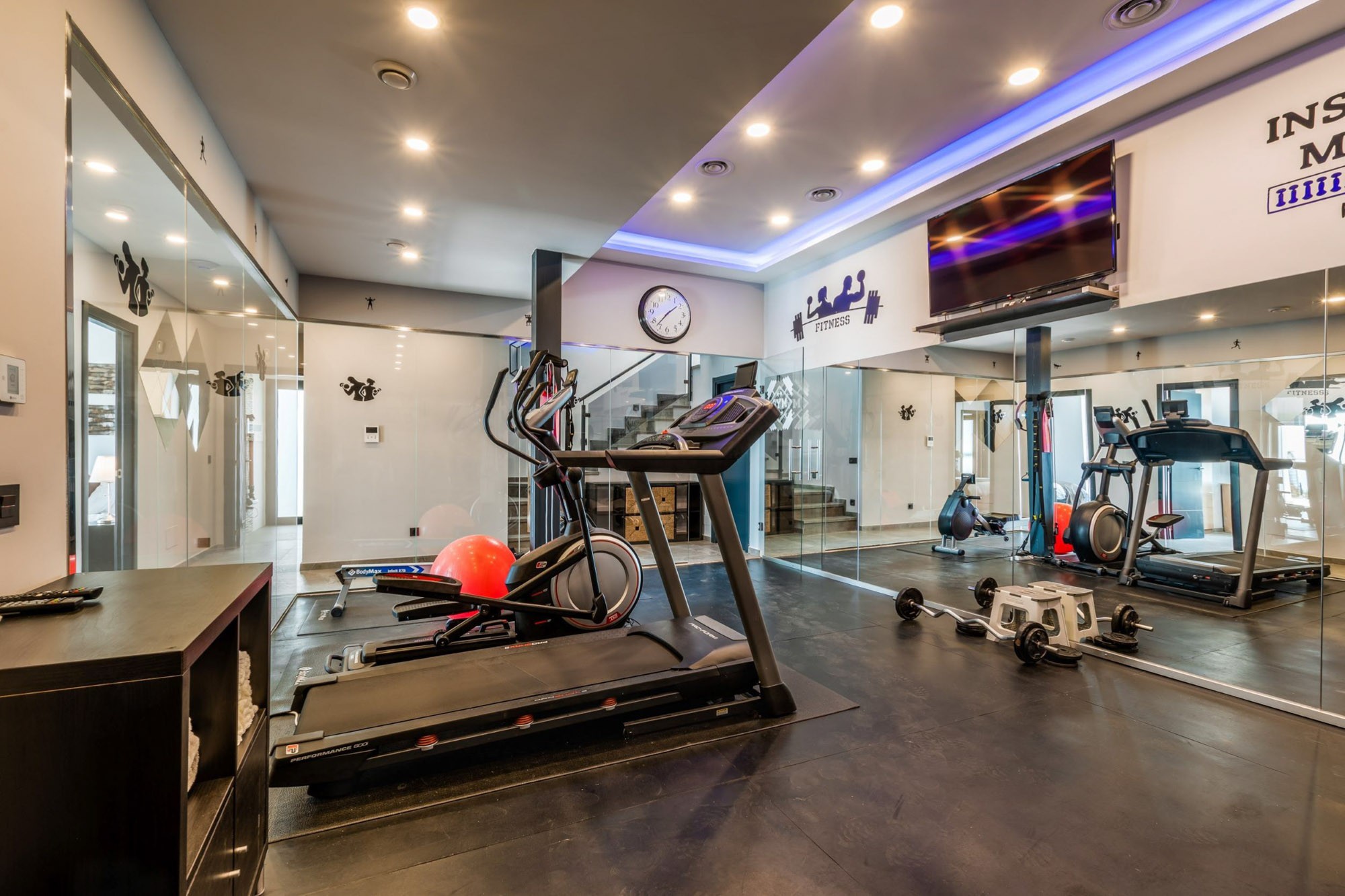 The lower ground floor of Villa Keshiki is dedicated to rest and relaxation. A large and well-equipped gym is enclosed behind glass walls, featuring a cross trainer, treadmill, rowing machine and free weights. Next door, the home spa can be found – with its sauna, steam room, shower and Jacuzzi. The two double bedrooms on the lower-ground floor open directly out onto the pool area via sliding glass doors, meaning guests can roll straight out of bed and onto a sun lounger and spend the day basking under blue skies.
