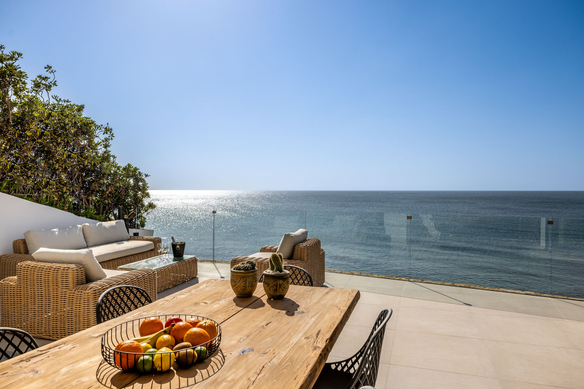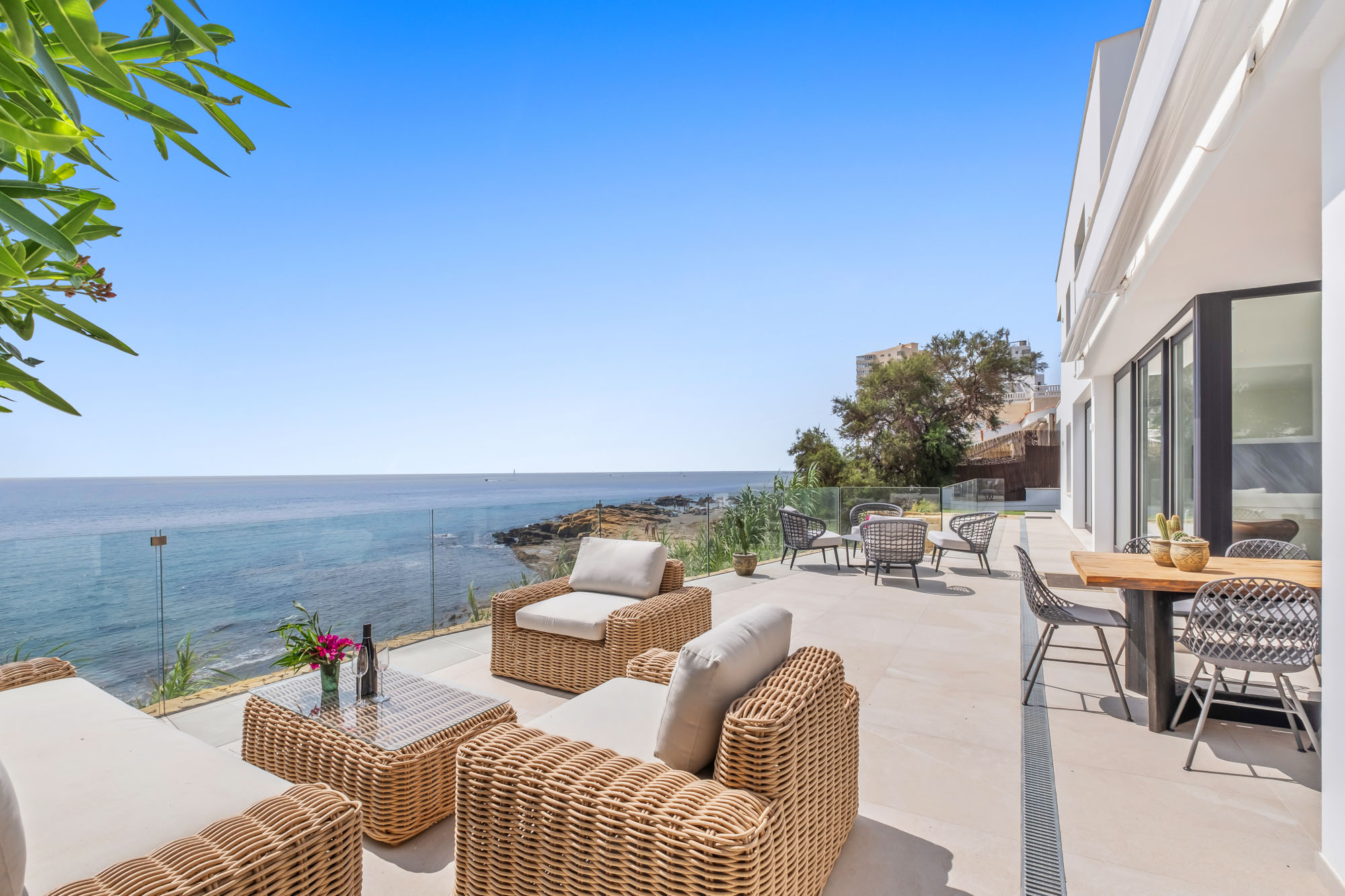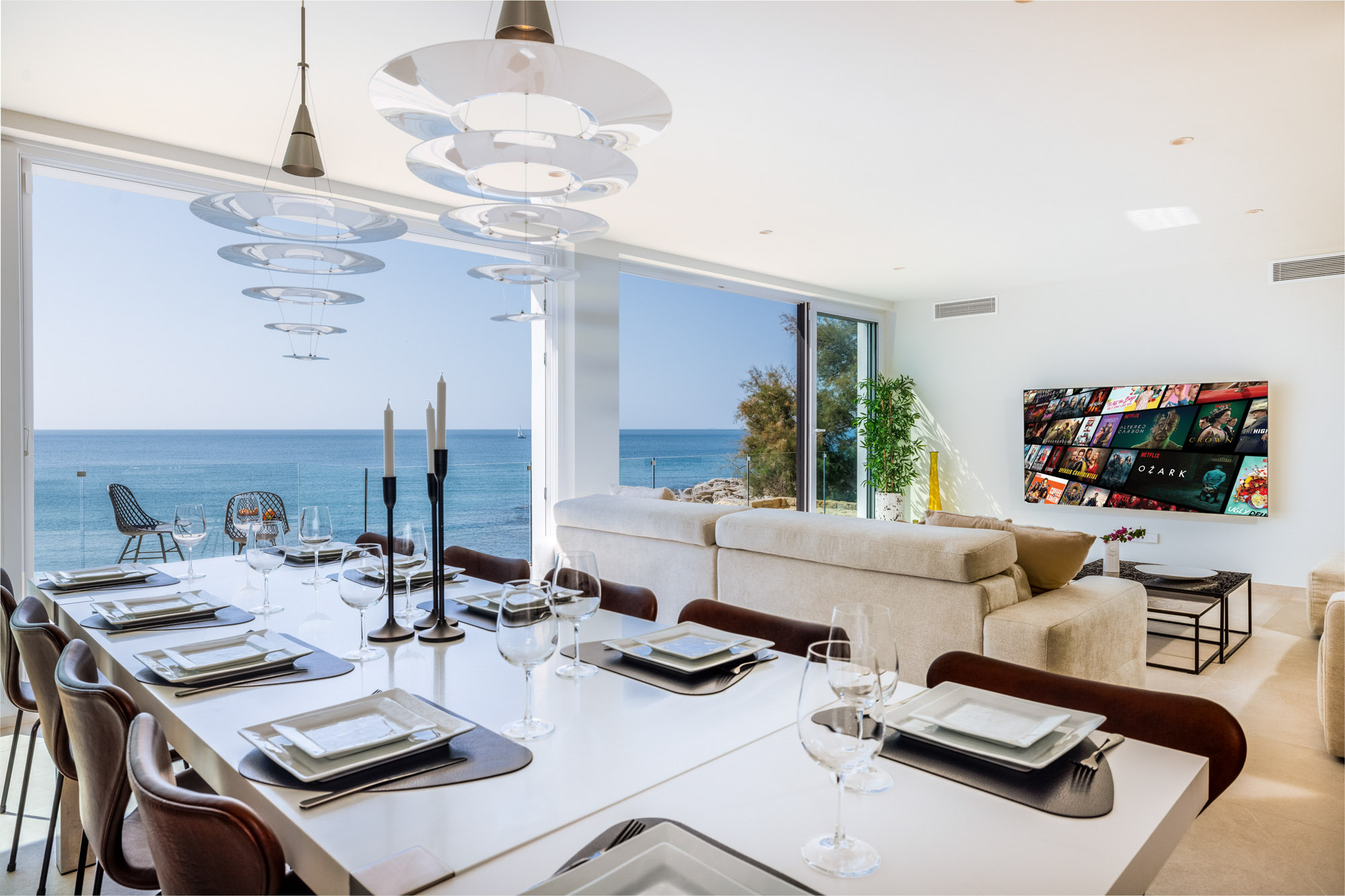 Meals can be enjoyed either at the 8-seater table in the open plan living room or outside on the terrace with its panoramic sea views.