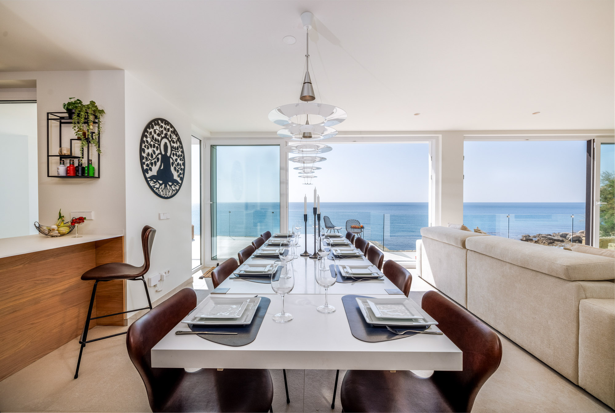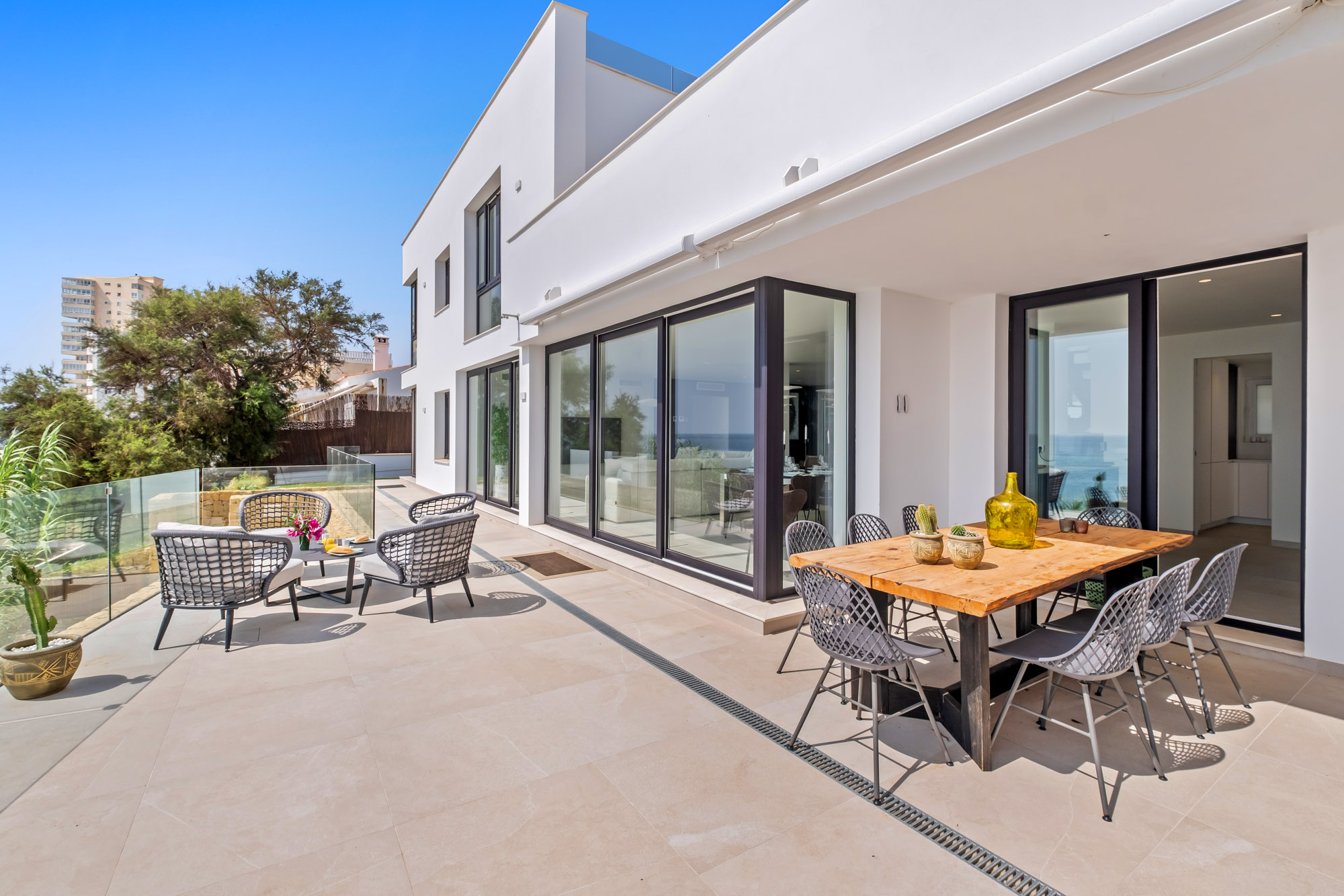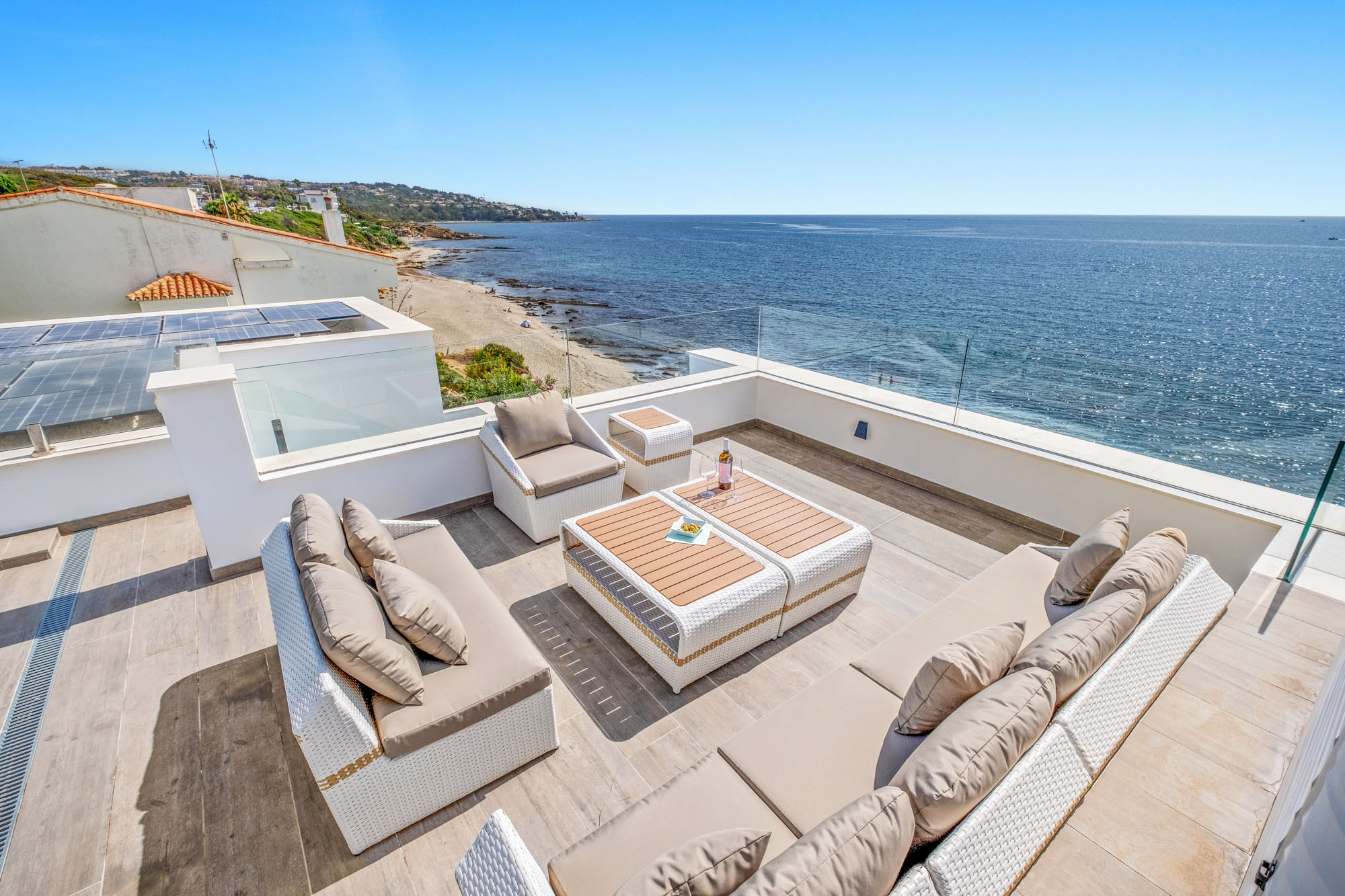Meals can be enjoyed either at the 8-seater table in the open plan living room or outside on the terrace with its panoramic sea views.