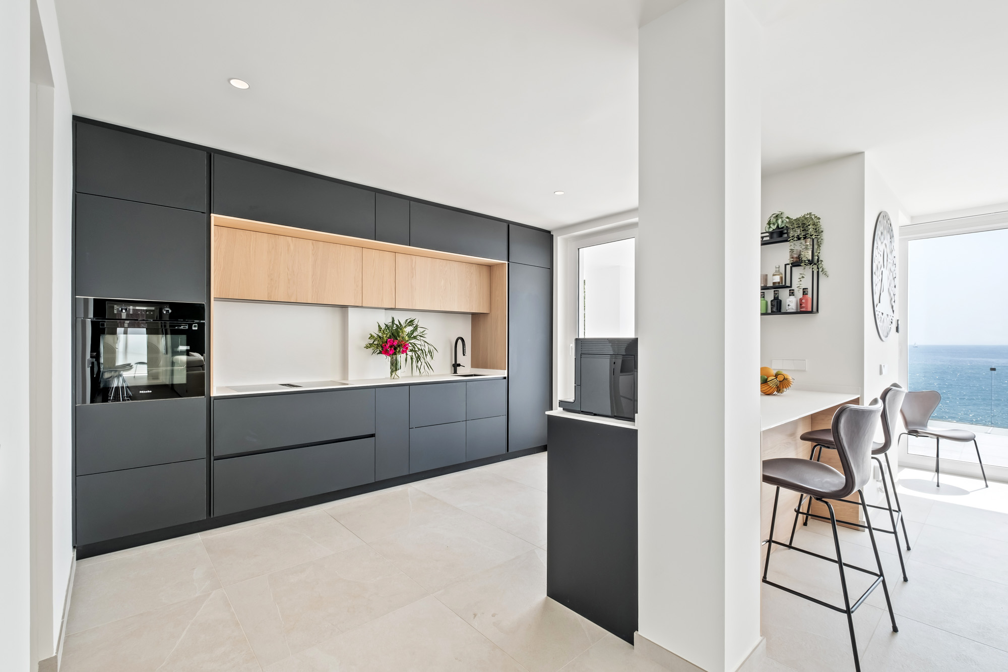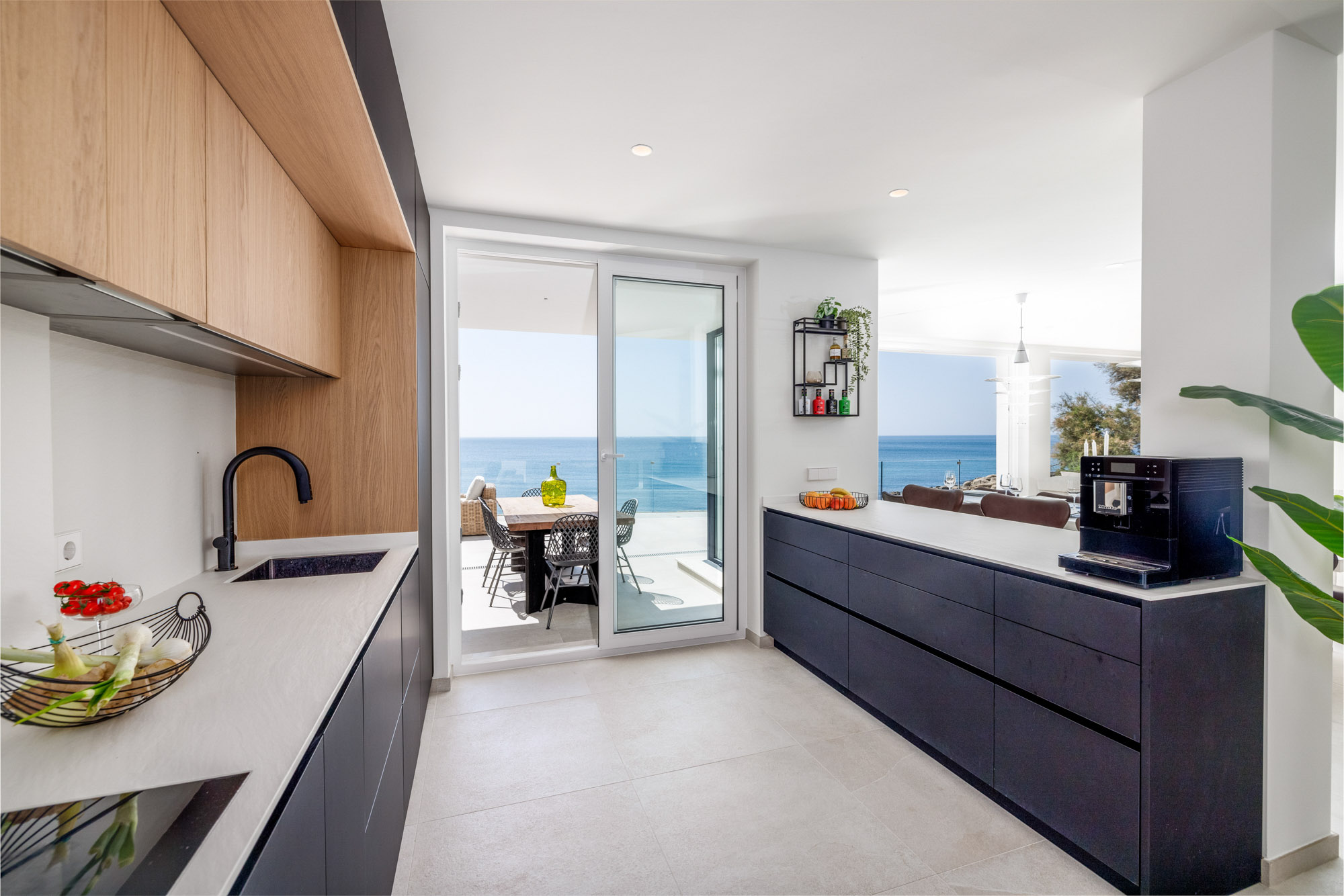 Villa Kyssa features a sleek modern kitchen equipped with a range of Miele appliances such as oven, electric hotplate with integrated extractor fan and coffee machine.