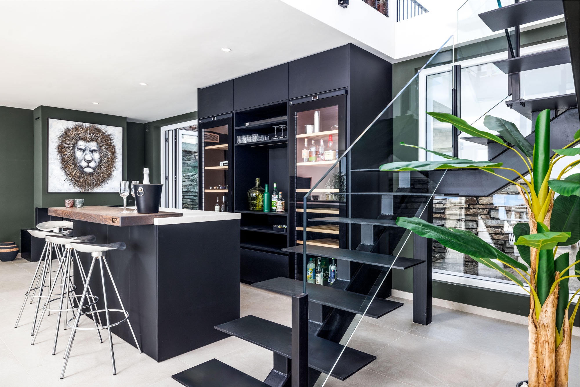 The fully equipped kitchen, fitted with Miele appliances, is perfect for preparing gourmet meals, while the downstairs bar is the ideal place to mix an evening cocktail after a day spent lounging around the pool.
