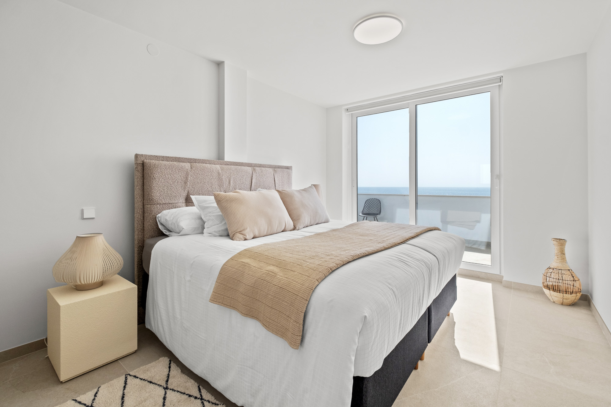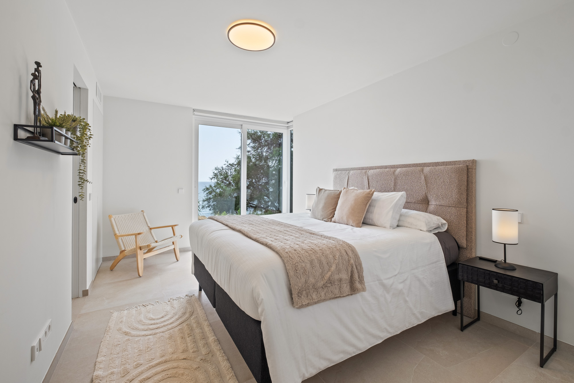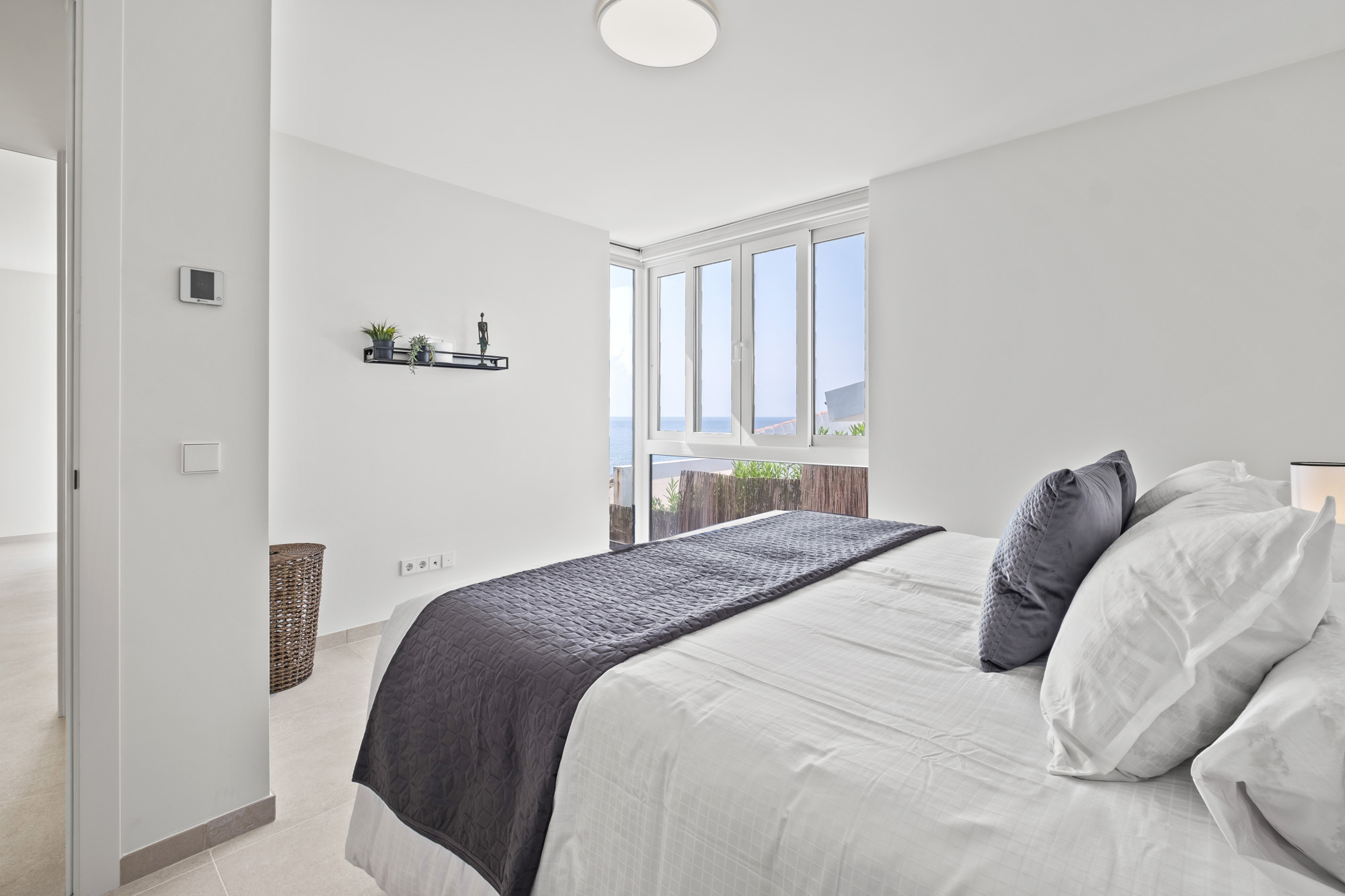 Principal Bedroom 1: Located on the lower ground floor, on same level as kitchen and living room. Large double with king-sized bed (180x200cm) and sliding glass doors displaying sea views, with access to lower terrace. Features