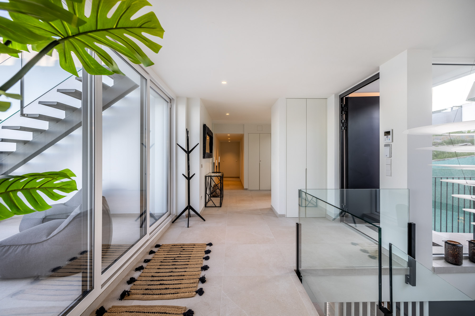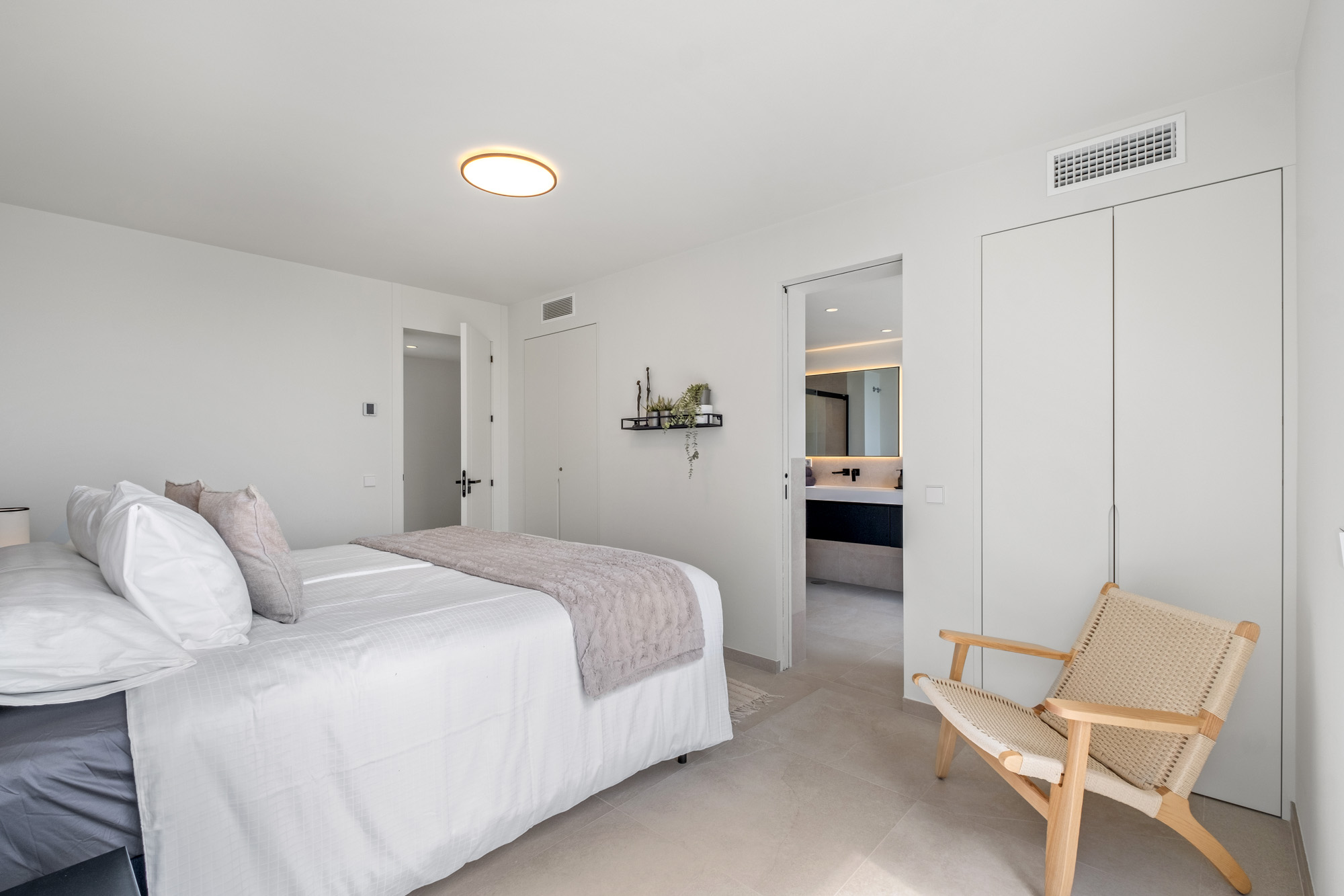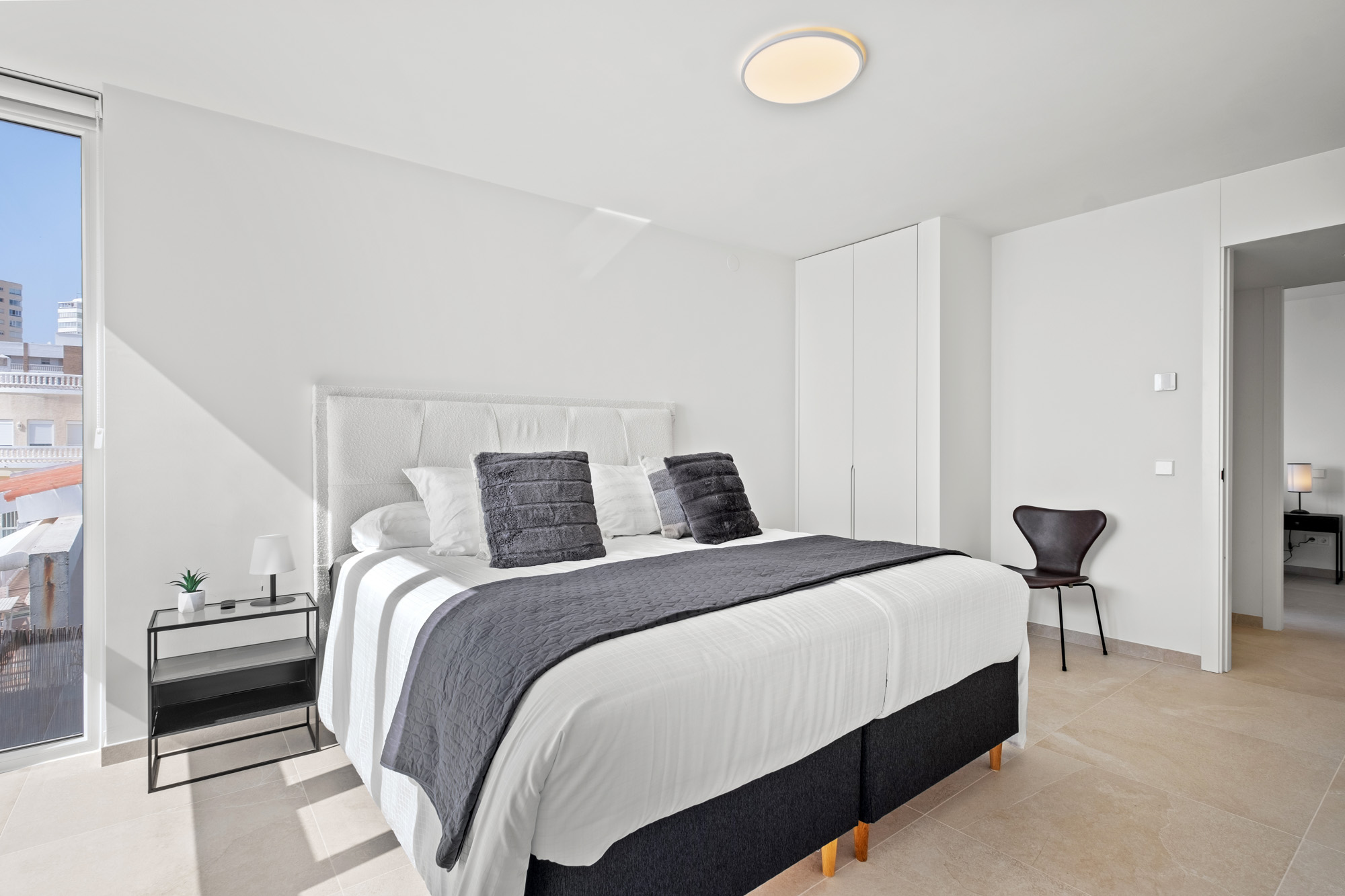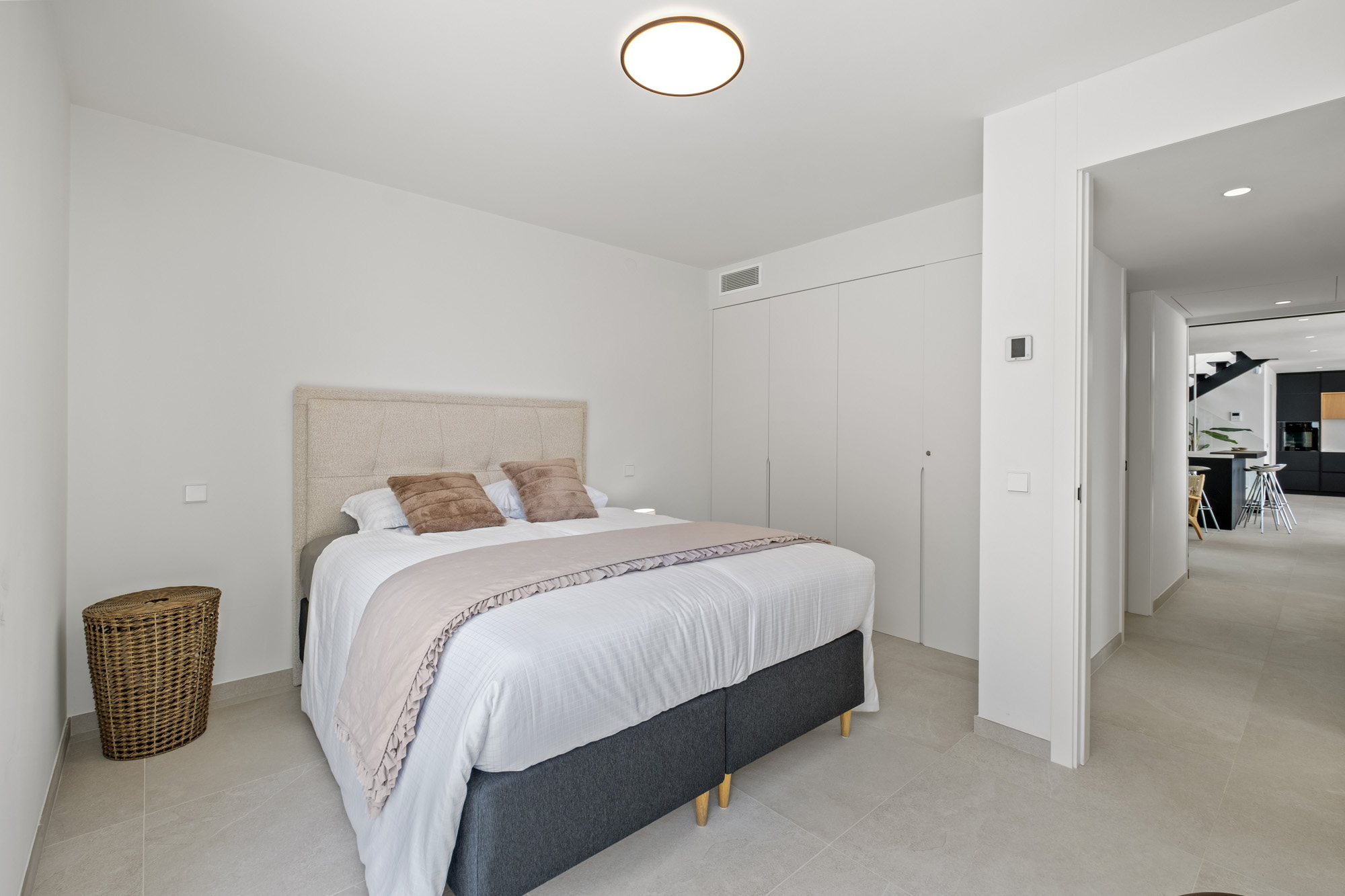 Principal Bedroom 1: Located on the lower ground floor, on same level as kitchen and living room. Large double with king-sized bed (180x200cm) and sliding glass doors displaying sea views, with access to lower terrace. Features