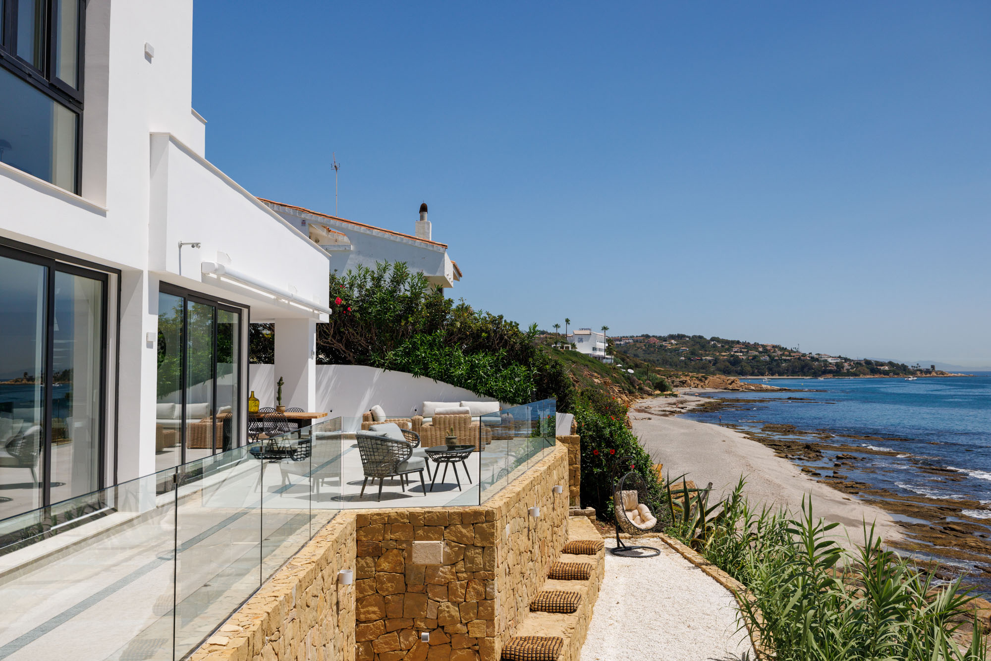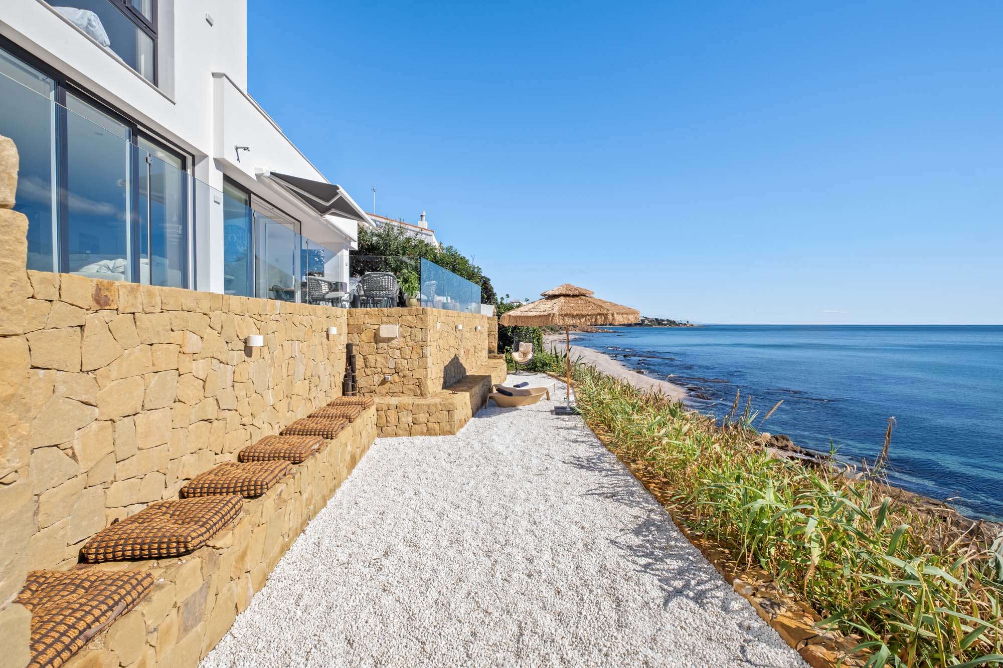 Situated by the sea near Sotogrande Marina, Villa Kyssa is a newly modernised 6-bedroom beachside retreat with stylish interiors and show-stopping sea-side terraces.