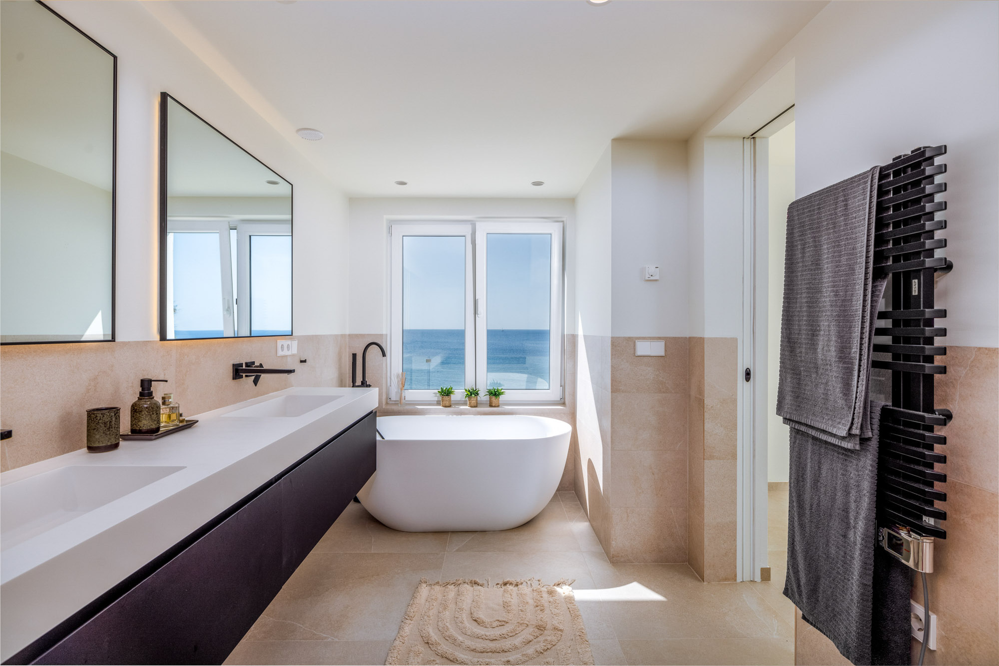 Modern en-suite bathroom with free-standing tub with hand-held shower in front of window with sea view, plus twin basins and separate rain shower.
