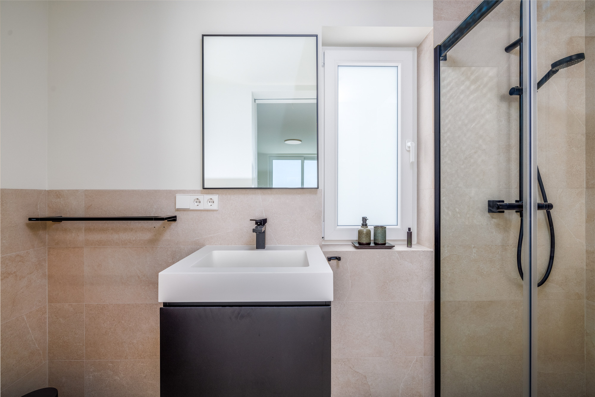 Modern bathroom with separate shower located directly next door in the corridor.