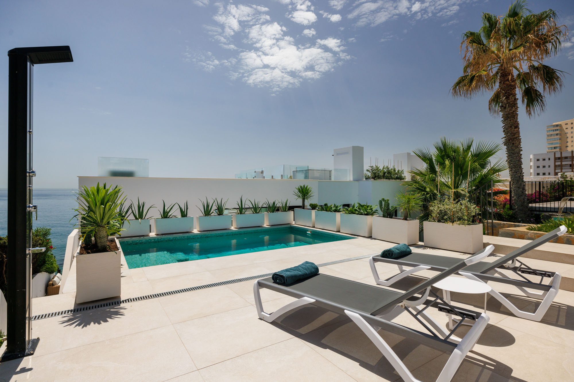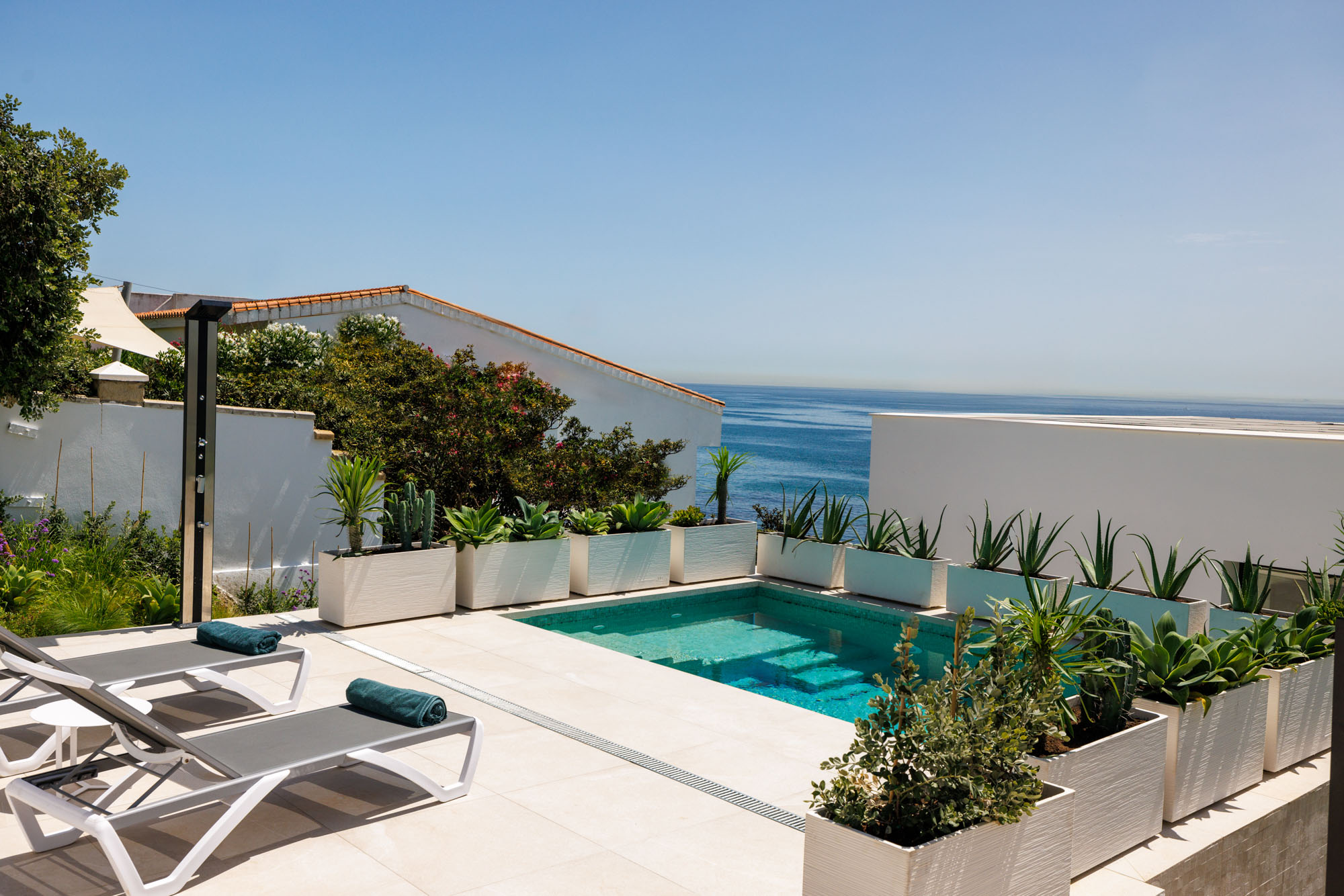 At the entrance of the villa, a tiered garden planted with succulents is also home to the heated private pool, situated on an elevated terrace and furnished with sun beds.