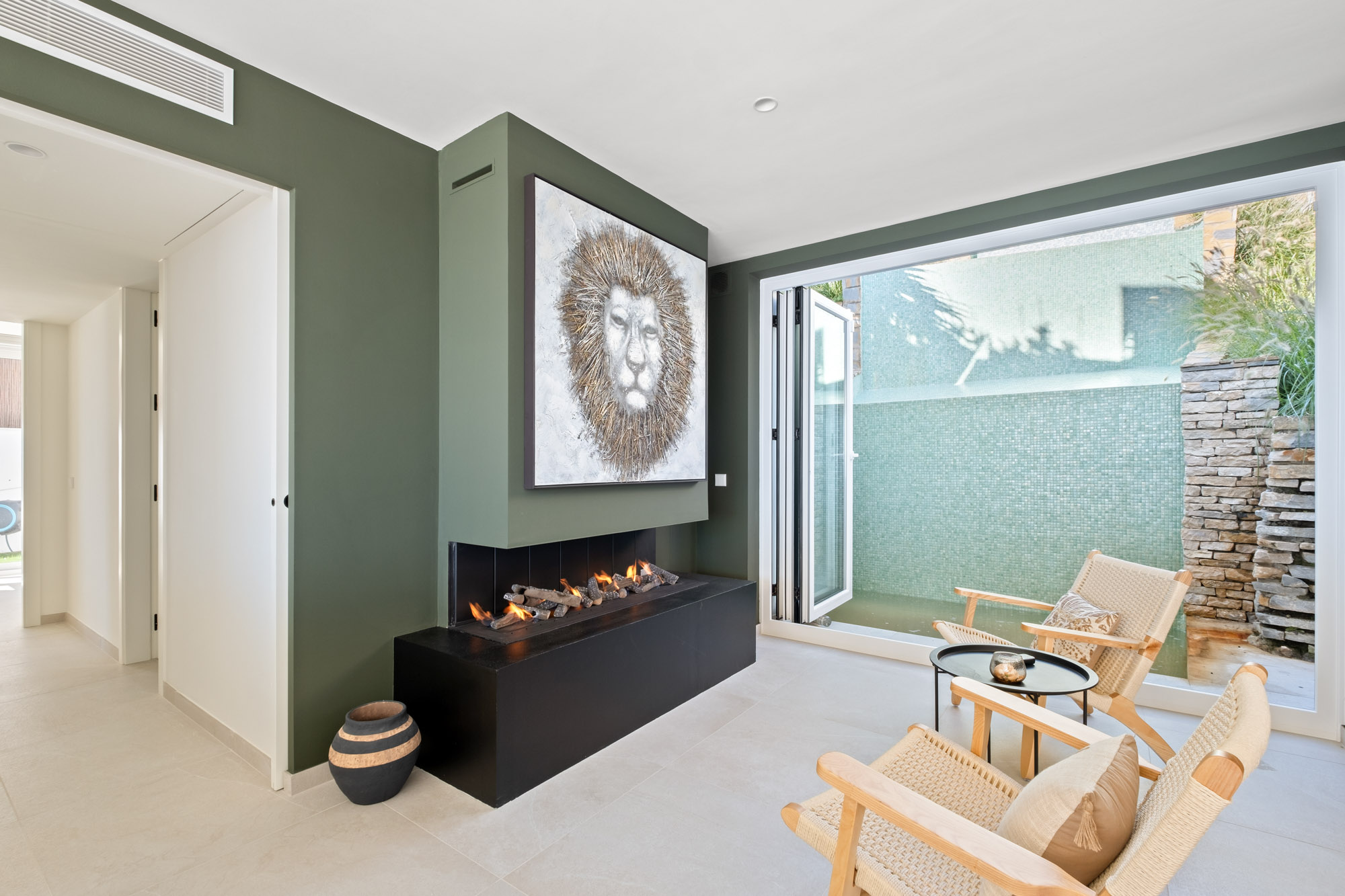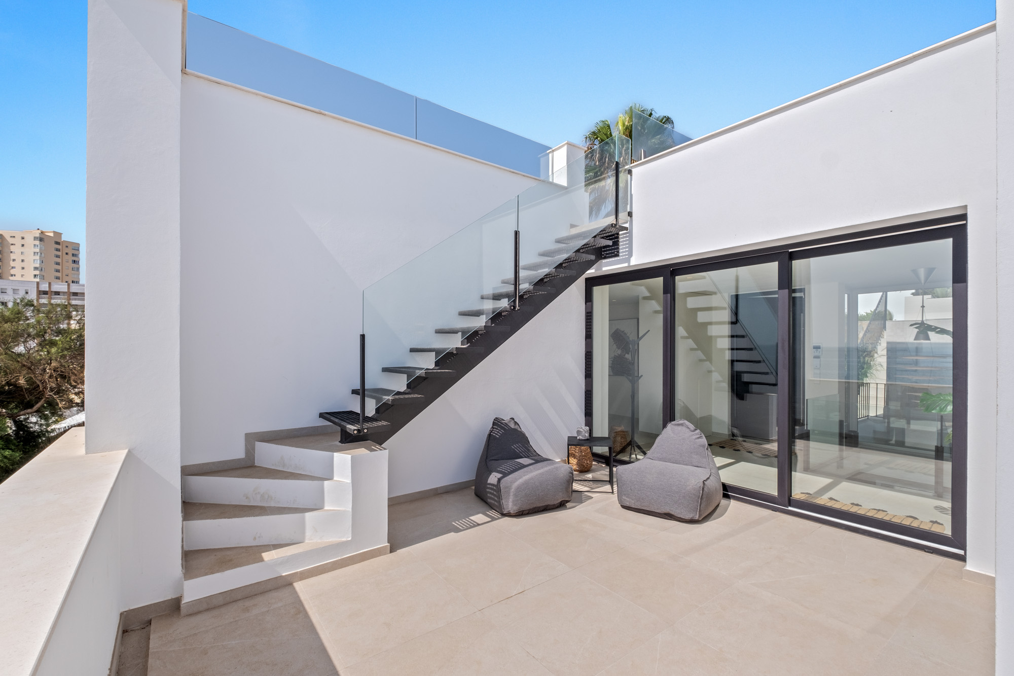 The room’s glass doors can be rolled back to provide access to large sun terrace, creating a seamless indoor/outdoor flow.