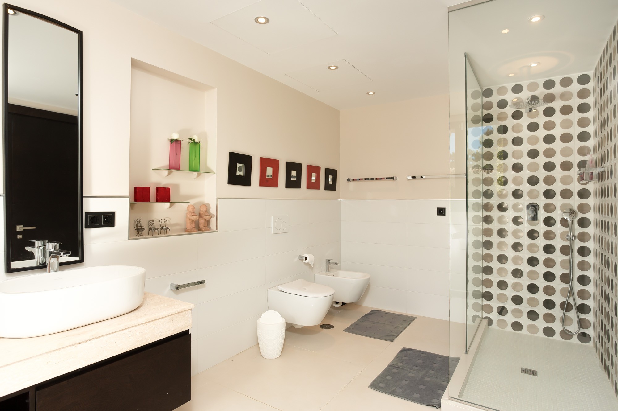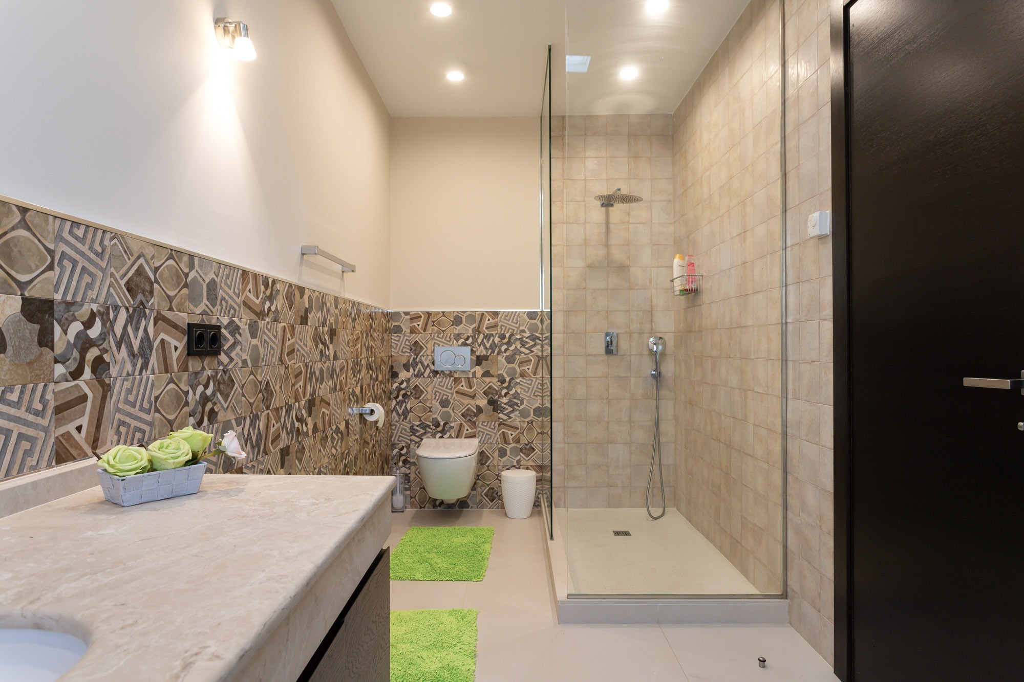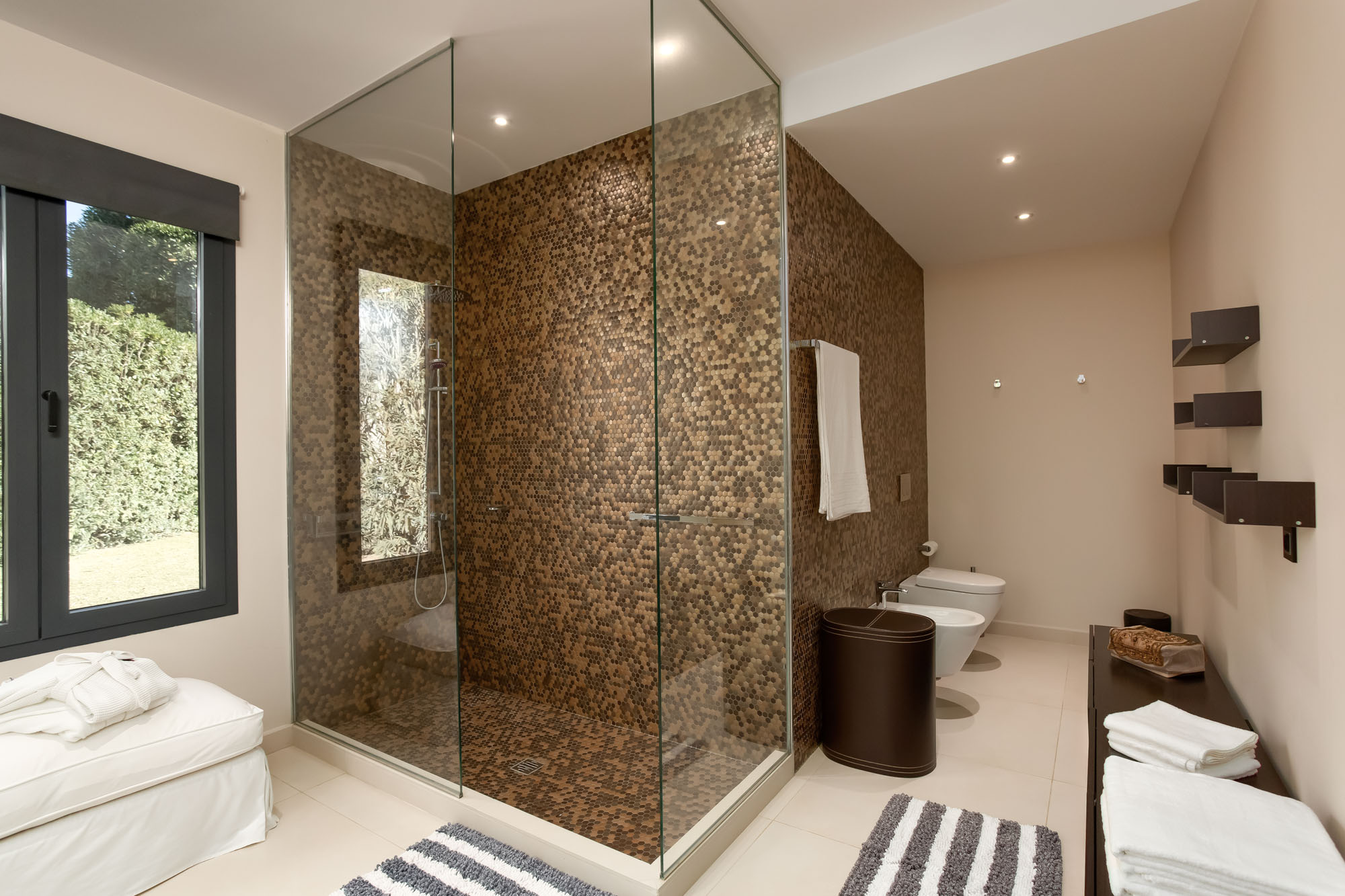 Modern ensuite shower room with walk-in shower, pebbled tiles, single basin, bidet and toilet.