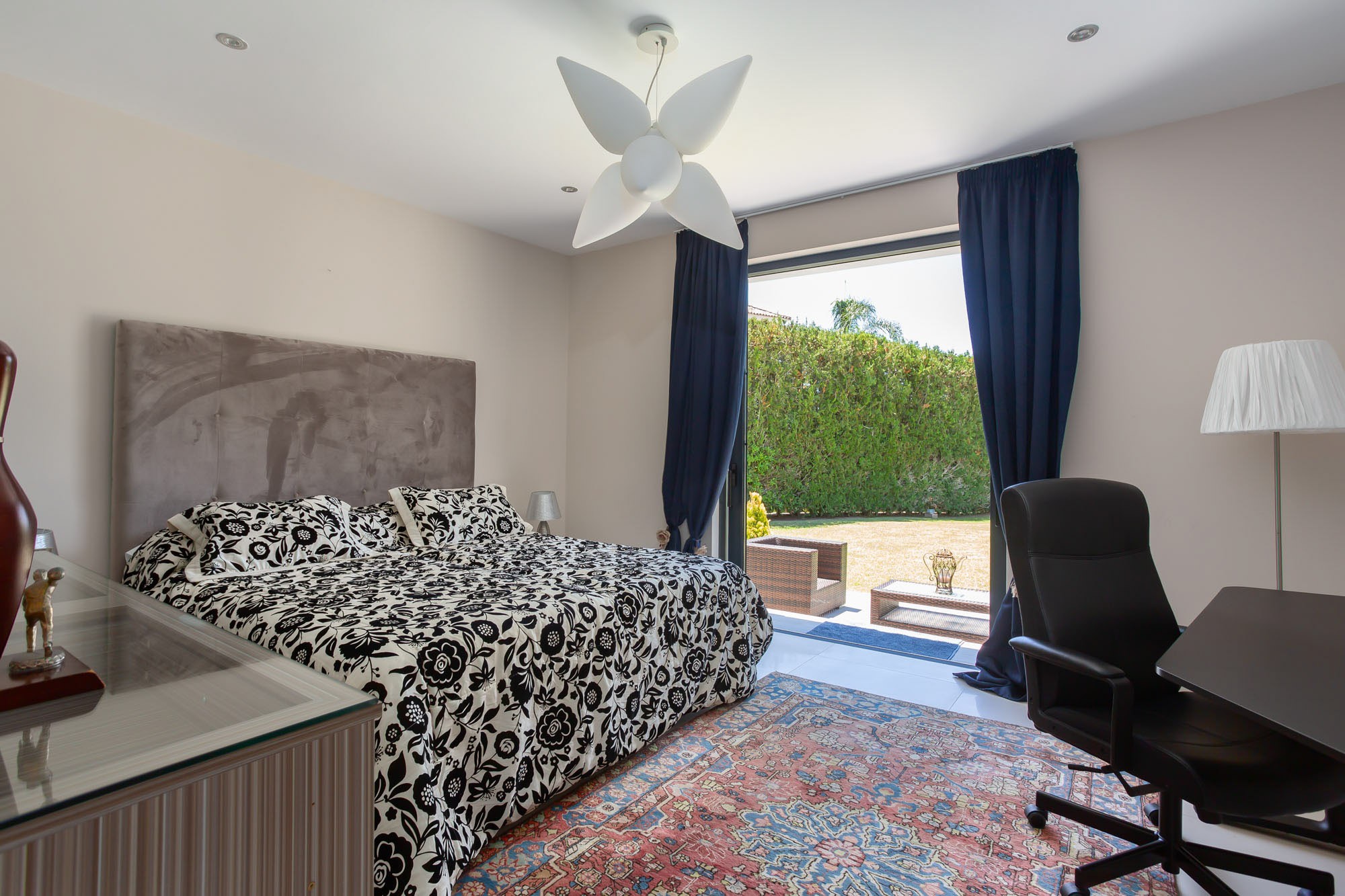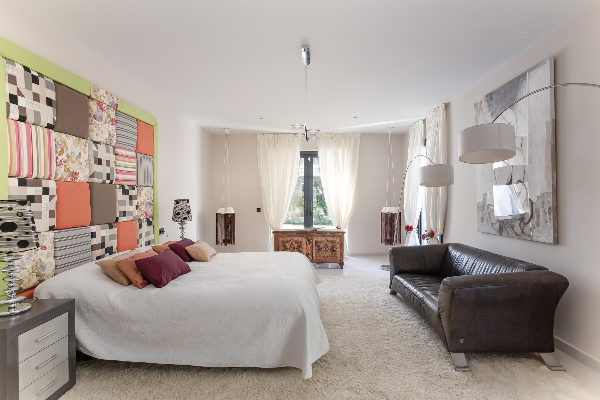Bedroom 1: Very spacious ground-floor master bedroom with king-sized bed, colourful patchwork-textile headboard, black sofa, and two contemporary rocking chairs. Dual aspect with patio doors leading to the garden.