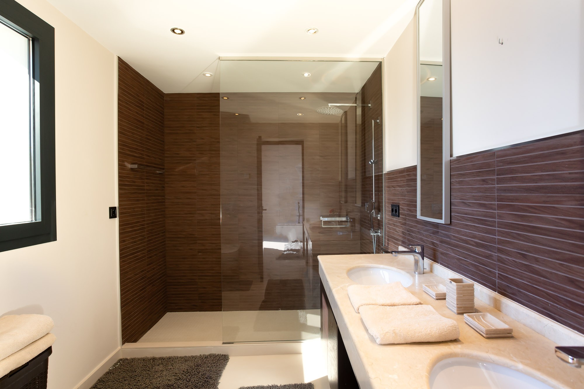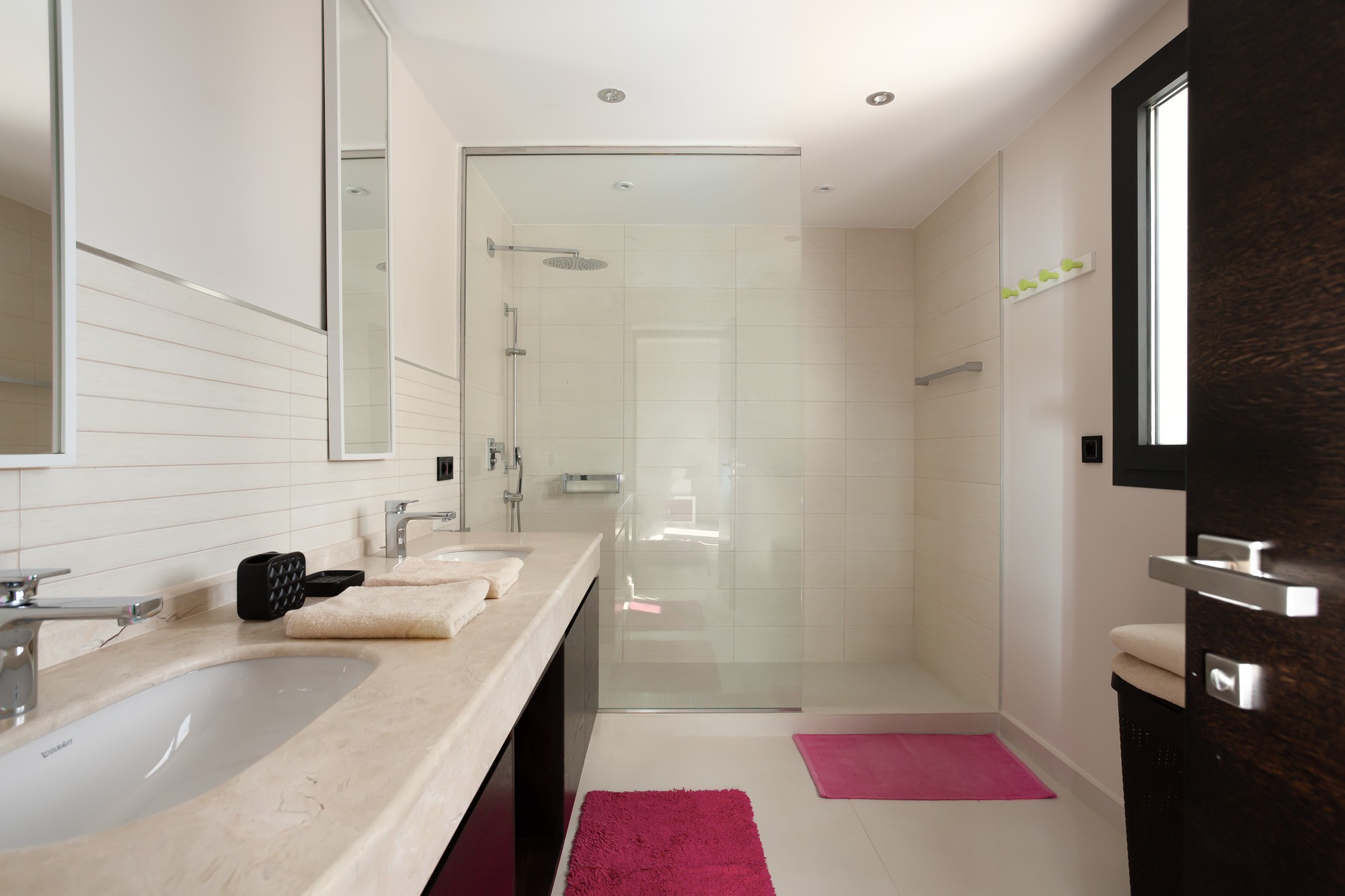 Modern en-suite shower room with twin basins and toilet.
