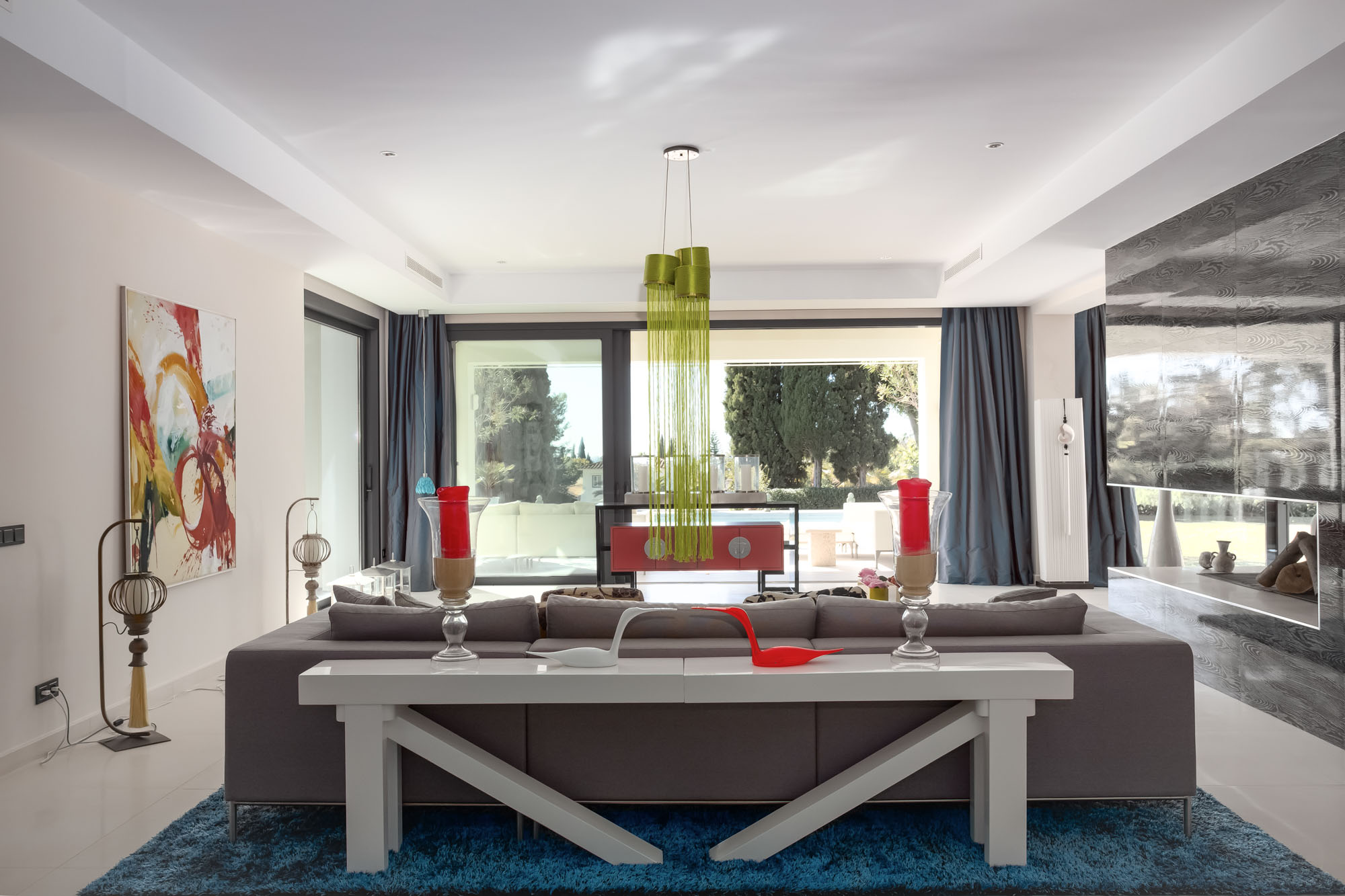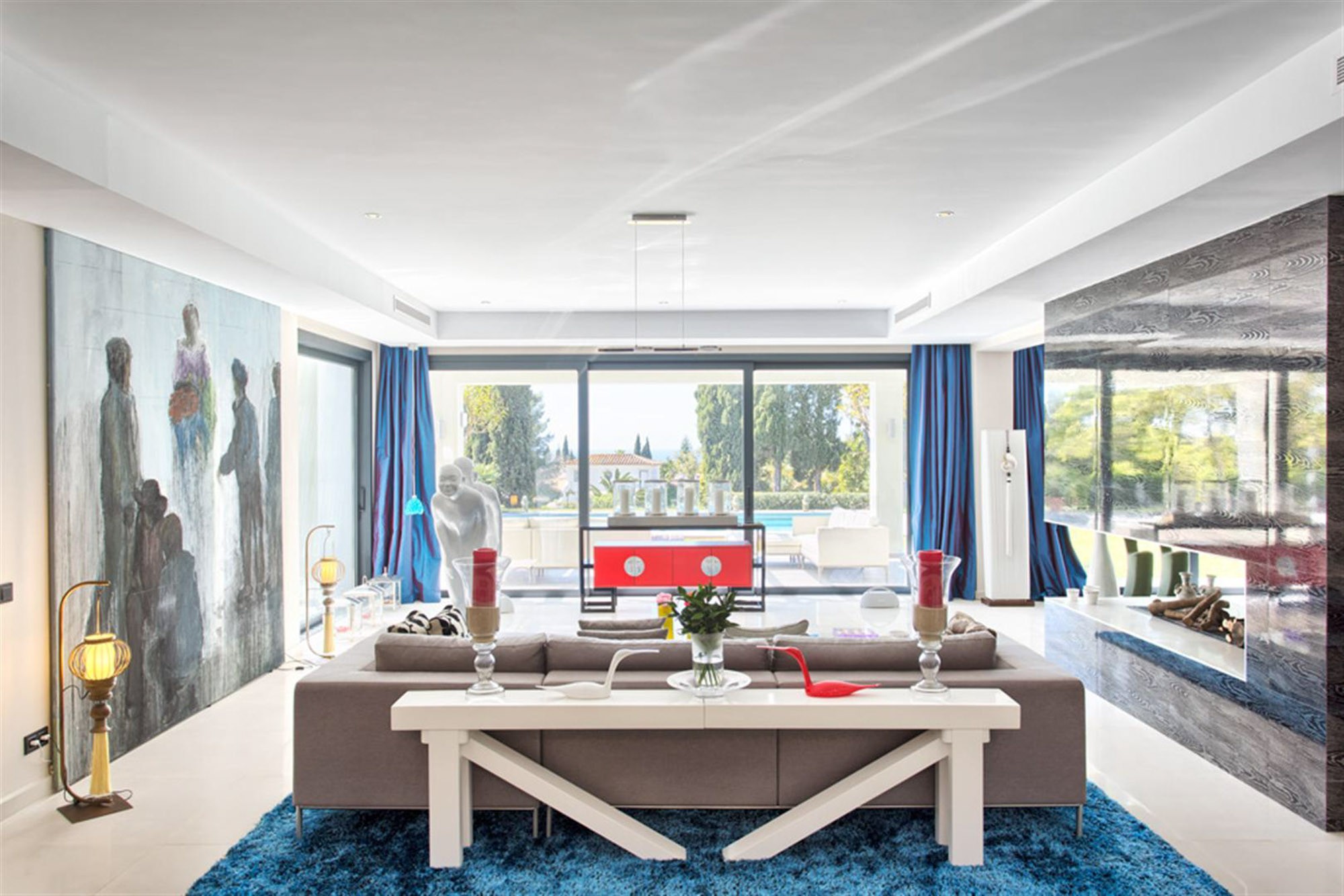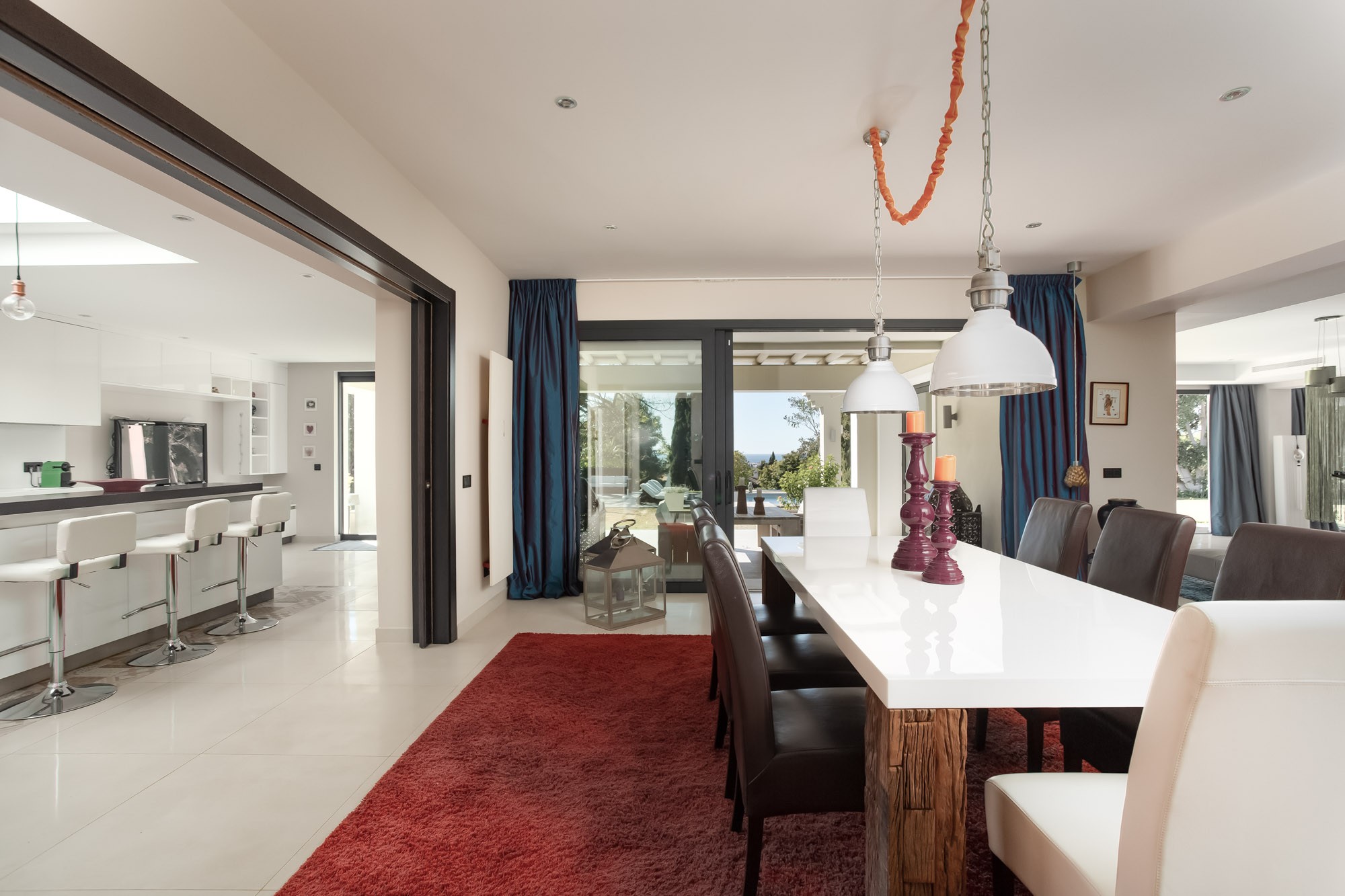 Walk a little deeper into the experience, and the pièce de résistance reveals itself: massive glass doors and windows that frame views of a sparkling pool and snapshots of the Mediterranean. And, inside and everywhere you look, a whitewashed palette alive with brilliant jewel tones – a home both true to Marbella tradition and resplendent with colour, at once expansively elegant and joyfully quirky.