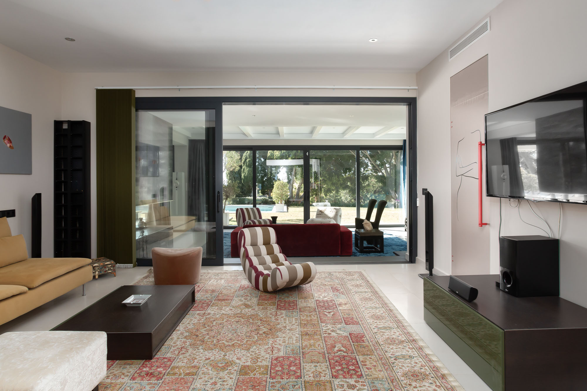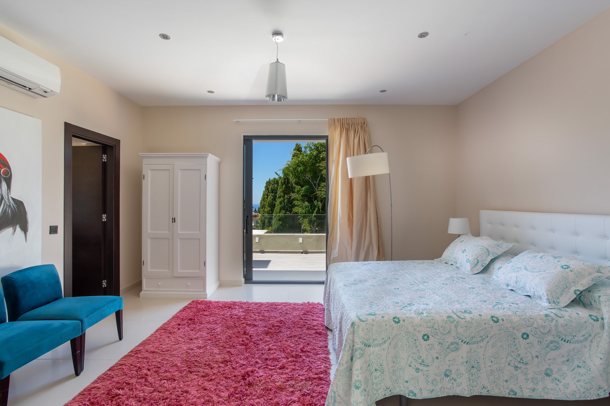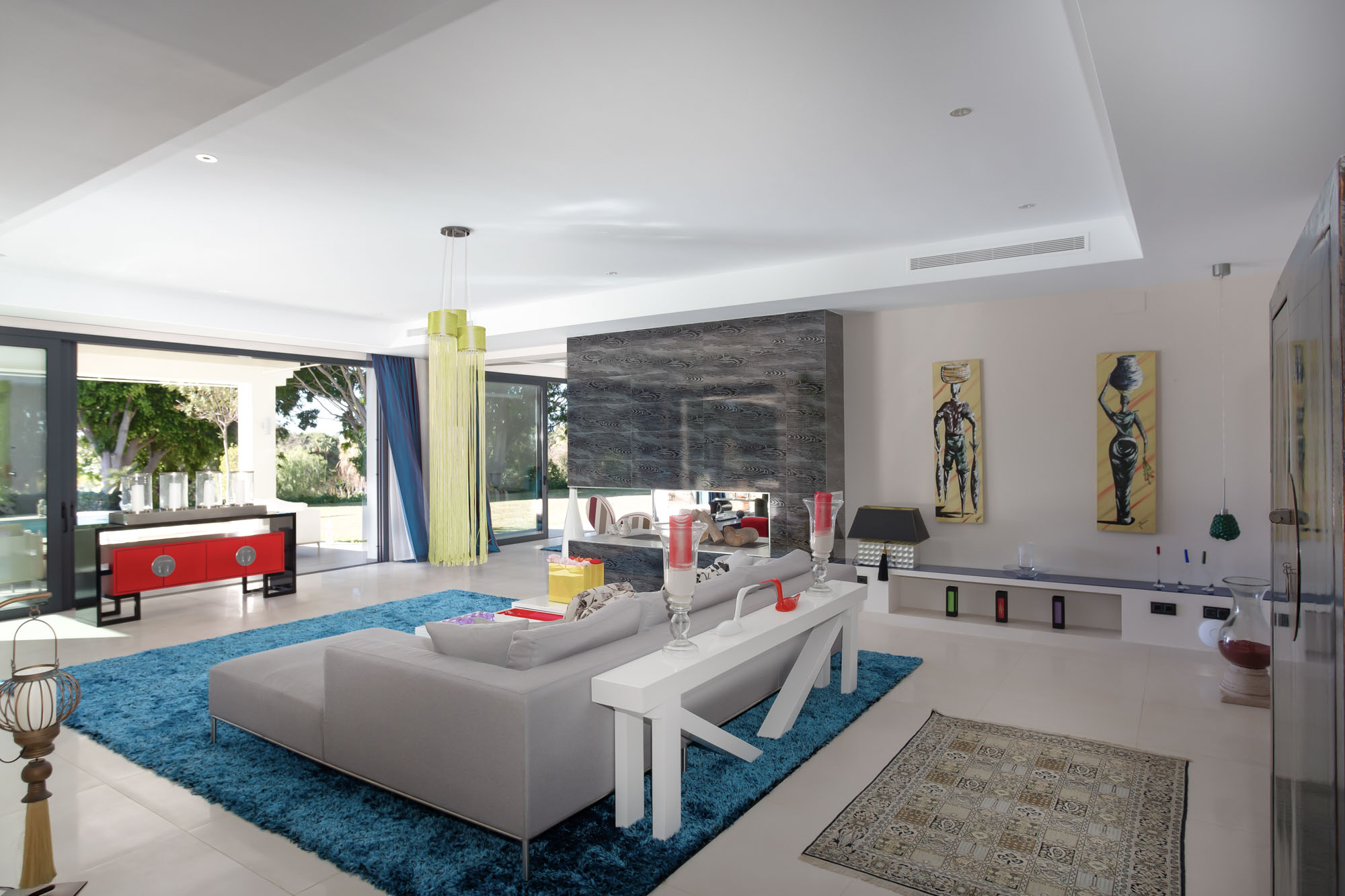 Walk a little deeper into the experience, and the pièce de résistance reveals itself: massive glass doors and windows that frame views of a sparkling pool and snapshots of the Mediterranean. And, inside and everywhere you look, a whitewashed palette alive with brilliant jewel tones – a home both true to Marbella tradition and resplendent with colour, at once expansively elegant and joyfully quirky.