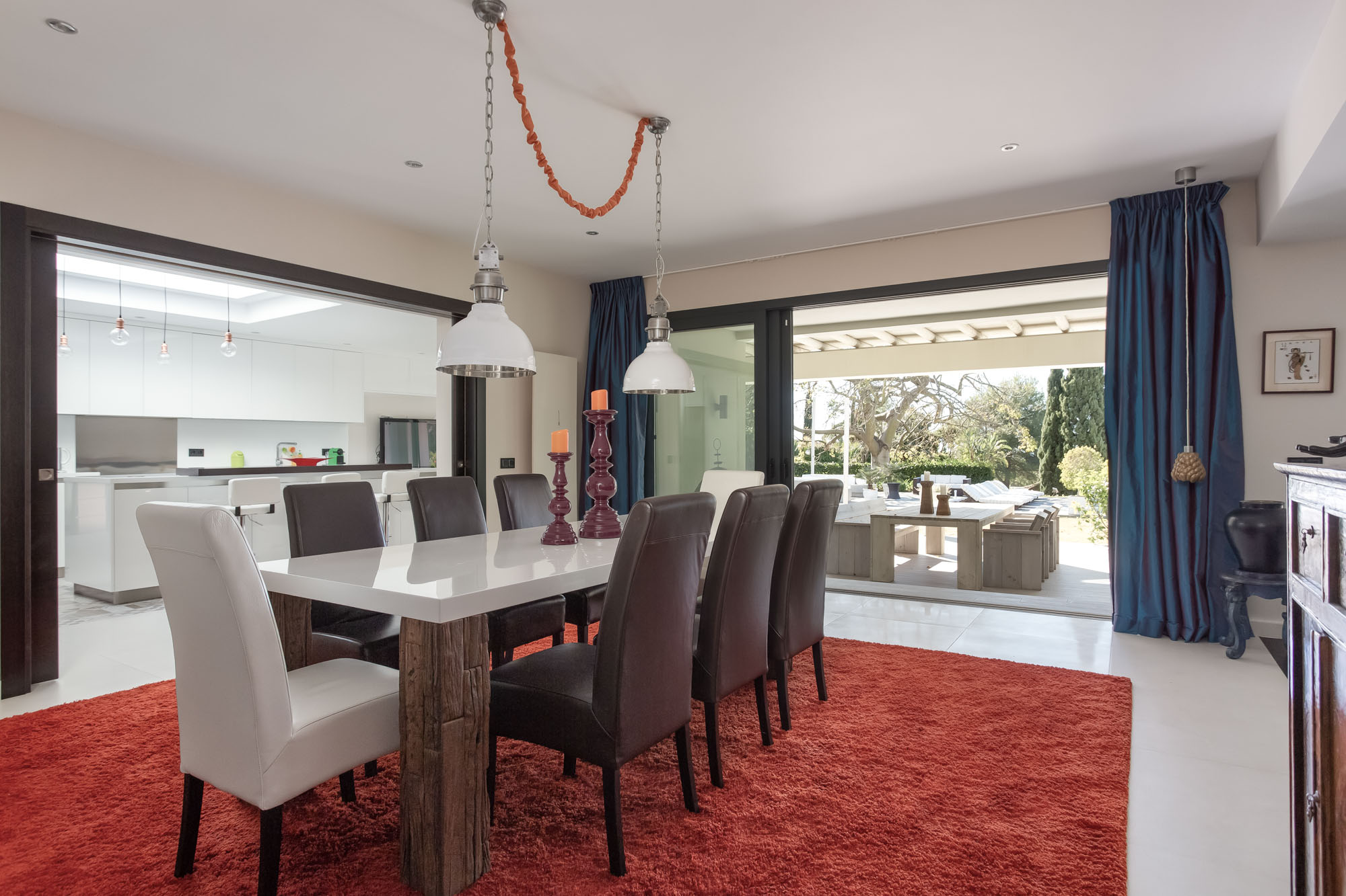 The living room takes up the centre of the house; a modern designer fireplace divides the room into distinct areas – one, a pop of red and the other, more subdued in grey – each with access to the outdoor lounge, gardens, and swimming pool. Both sitting areas are furnished in a contemporary style, mixed with some distinguished original pieces.