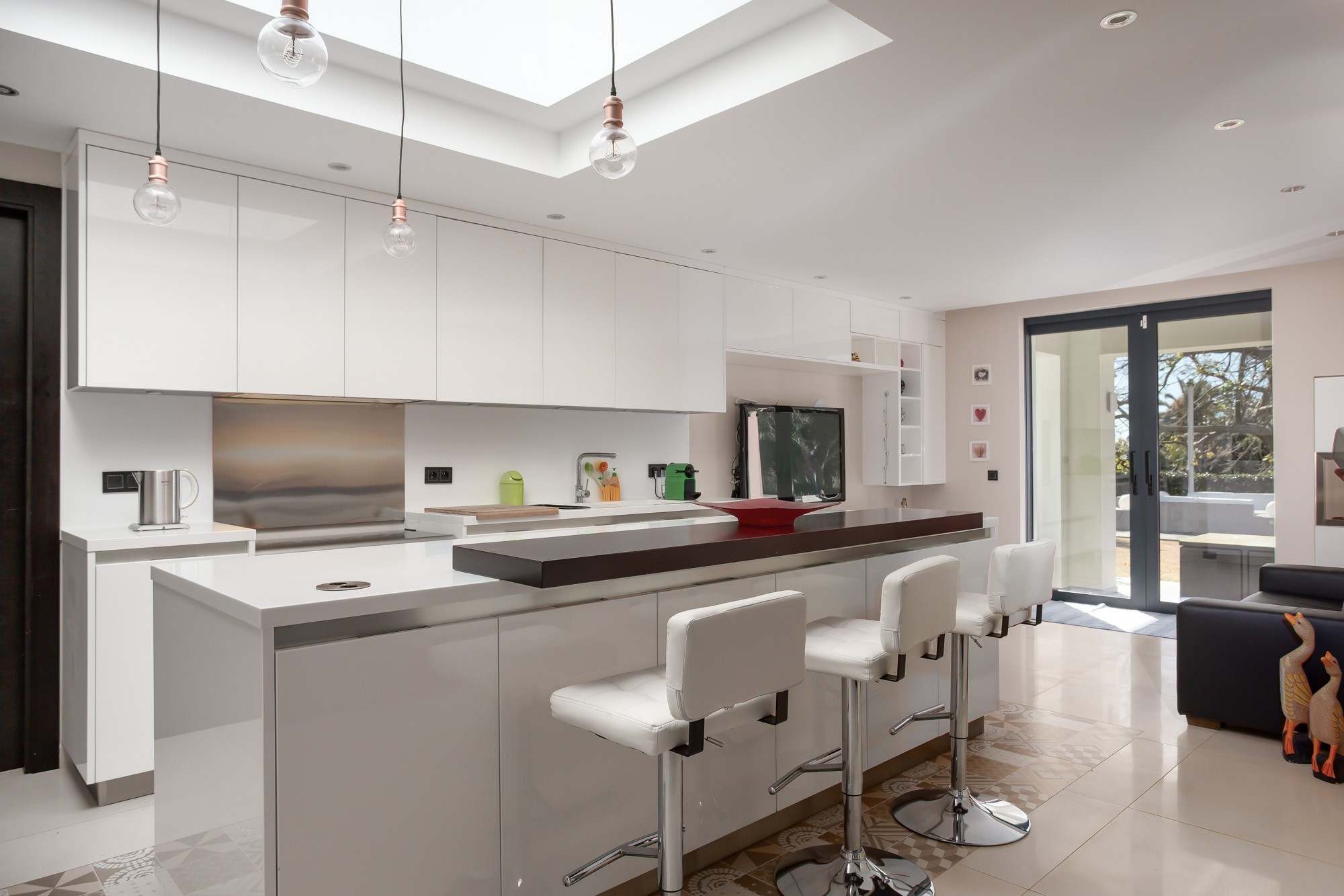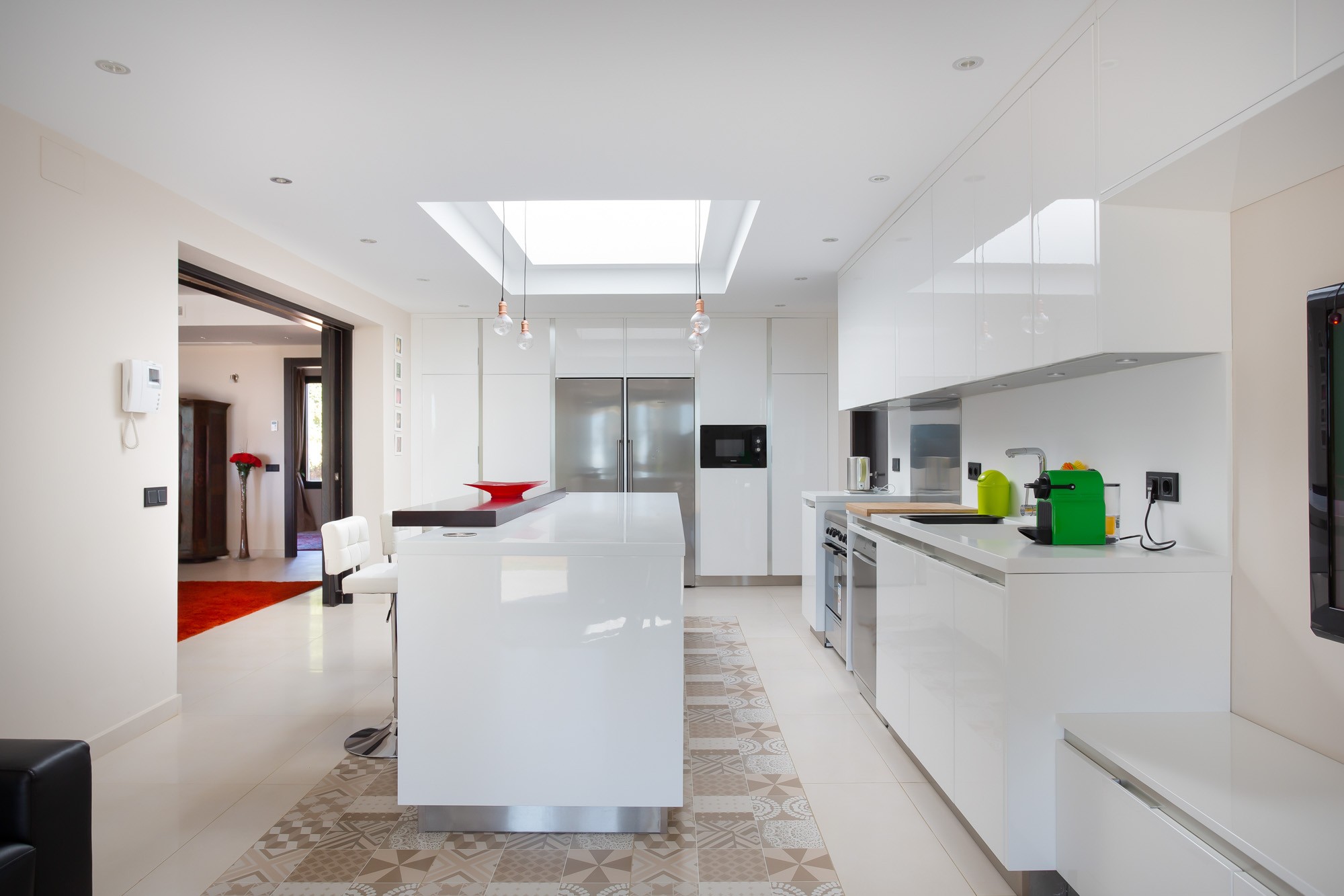 The contemporary white kitchen has a large island with breakfast bar and 3 stools. The bright and airy kitchen is a joy for hobbyist and professional chefs, offering sleek design, a gas 5-ring cooker and double-range oven, Siemans American-style fridge/freezer, dishwasher, Nespresso machine, and other amenities.
