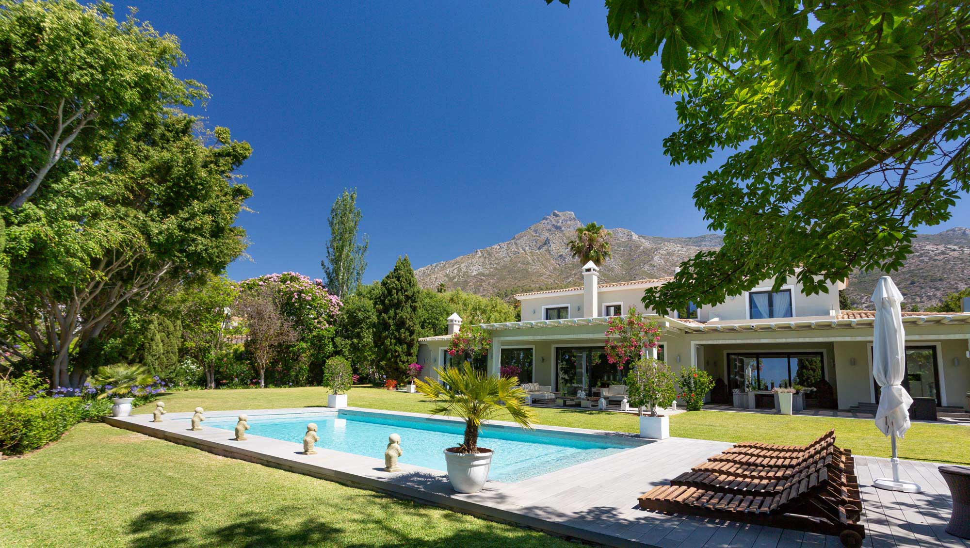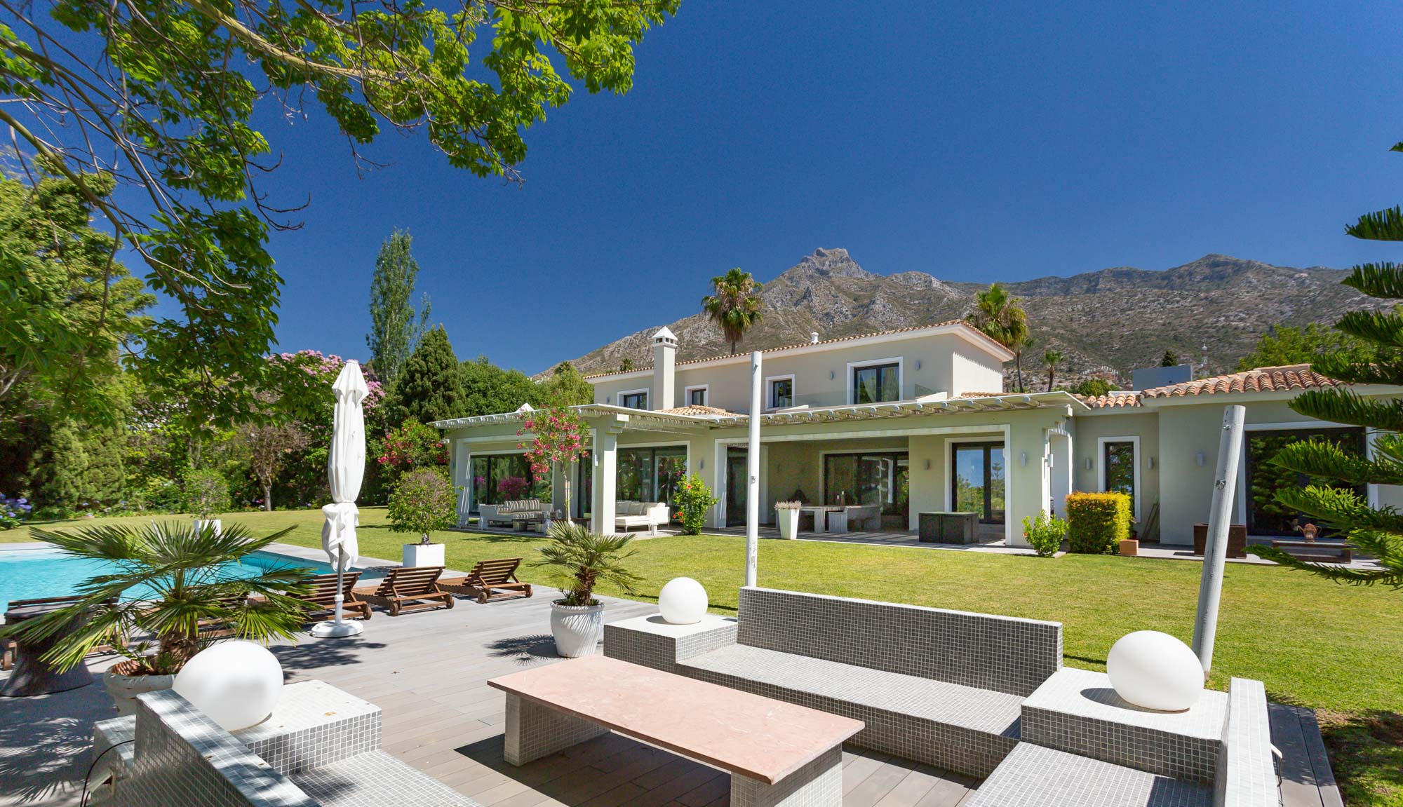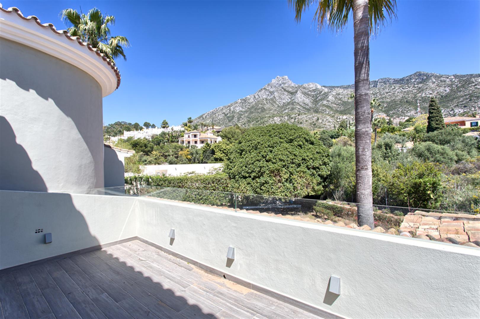 The main living terrace opens onto magnificent sea and La Concha mountain views, as well as an expansive garden which actually occupies two whole plots offering more space than most villas in the neighborhood!