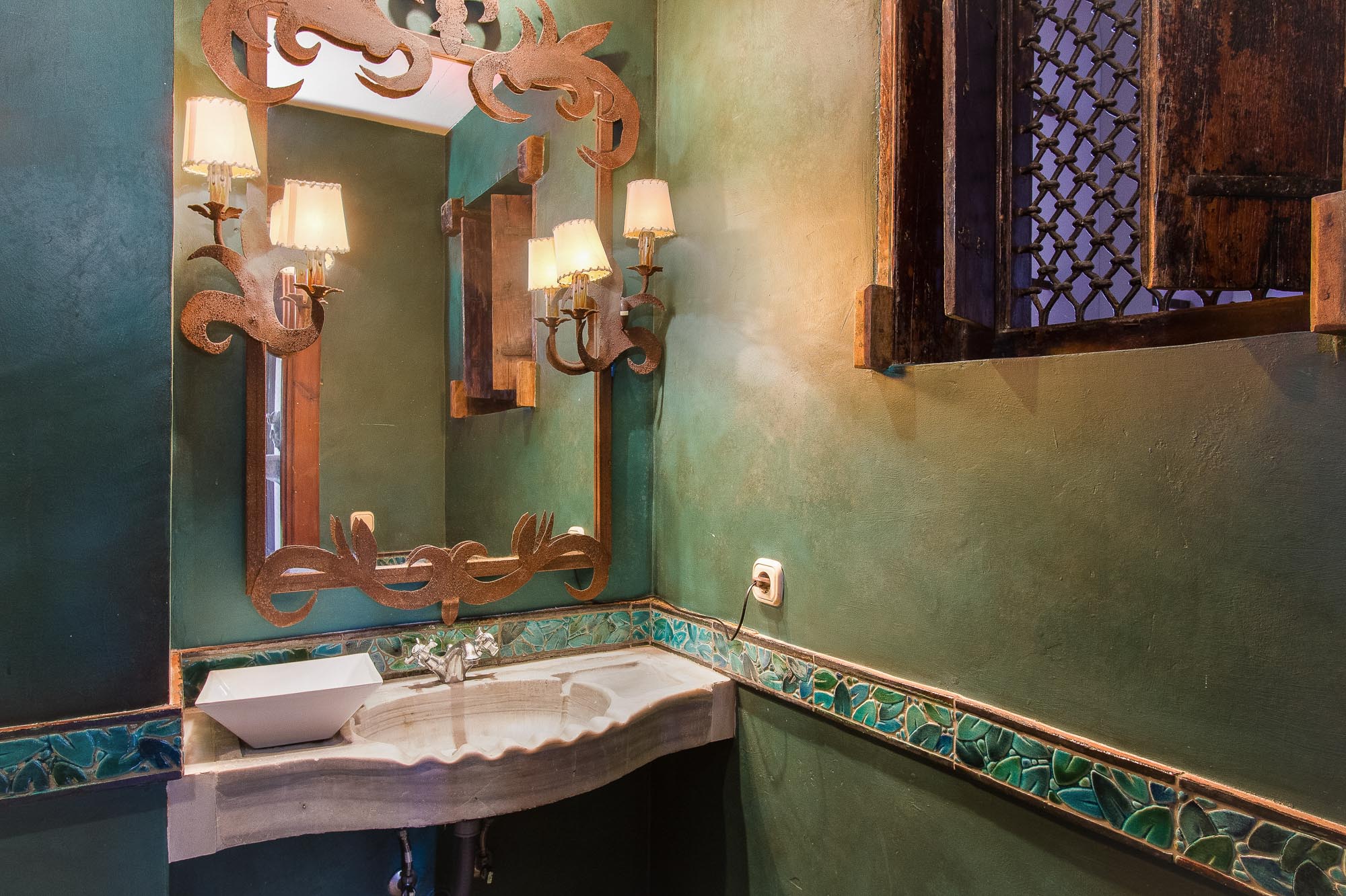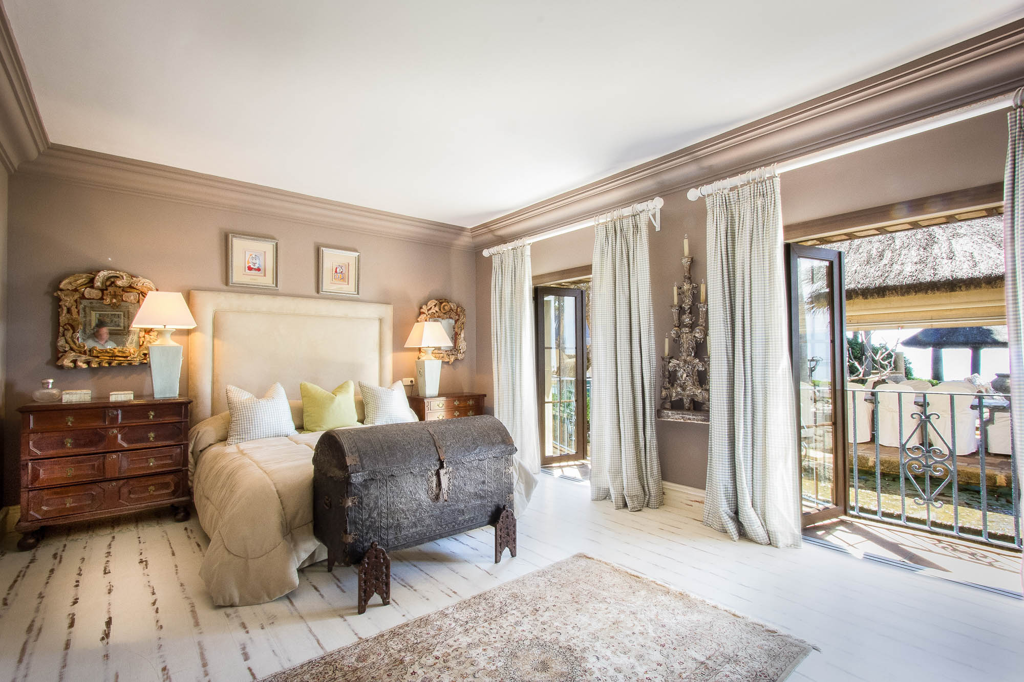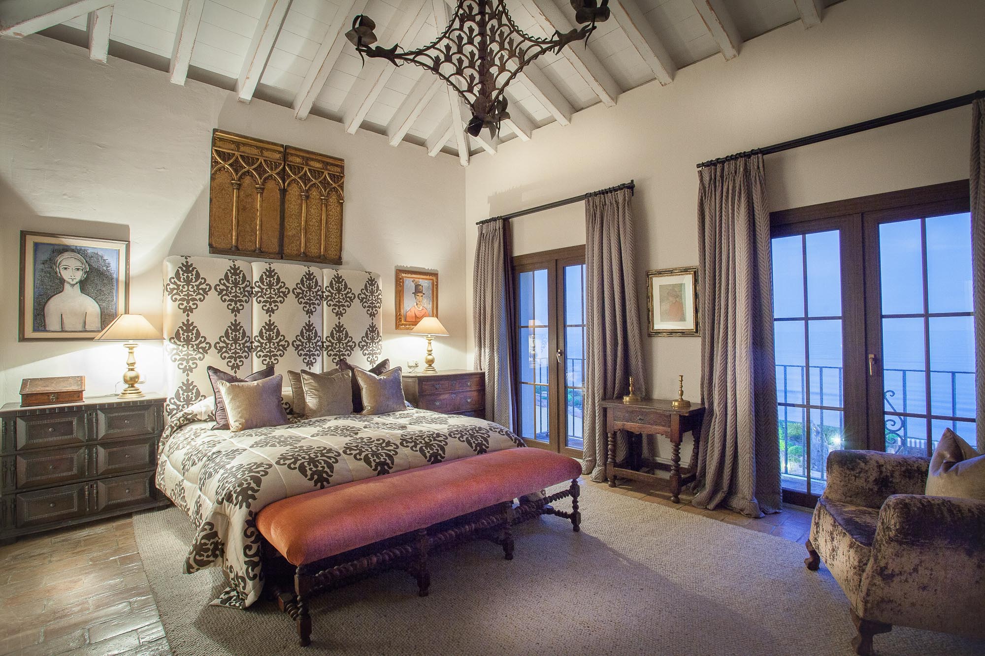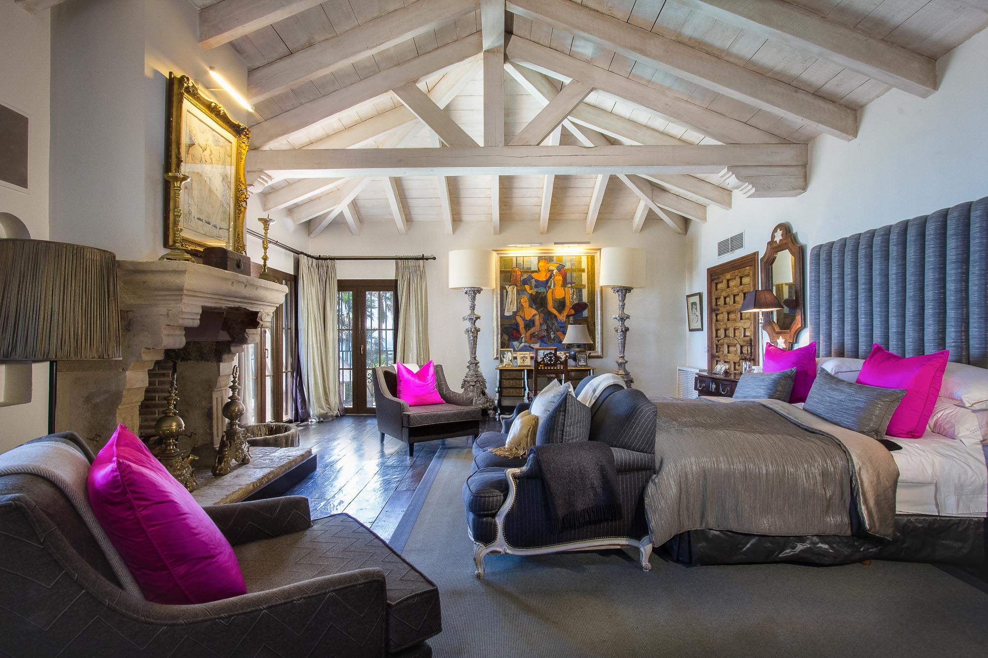 Bedroom 2: Principal suite offers a separate lounge area, complete with a magnificent vaulted ceiling, elegant stone fireplace, and Tartan-covered sofas. A small courtesy nook houses a fridge and coffeemaker. An art-lined passageway leads to the grey-and-fuschia master bedroom, which offers an enormous master bed and silk-cord headboard. An antique grille, once housed in a Granada convent, leads to the en-suite bath with a large spa bath with sweeping Mediterranean views, a French-style vanity with marble surround, and a separate area with professional backwash sinks.