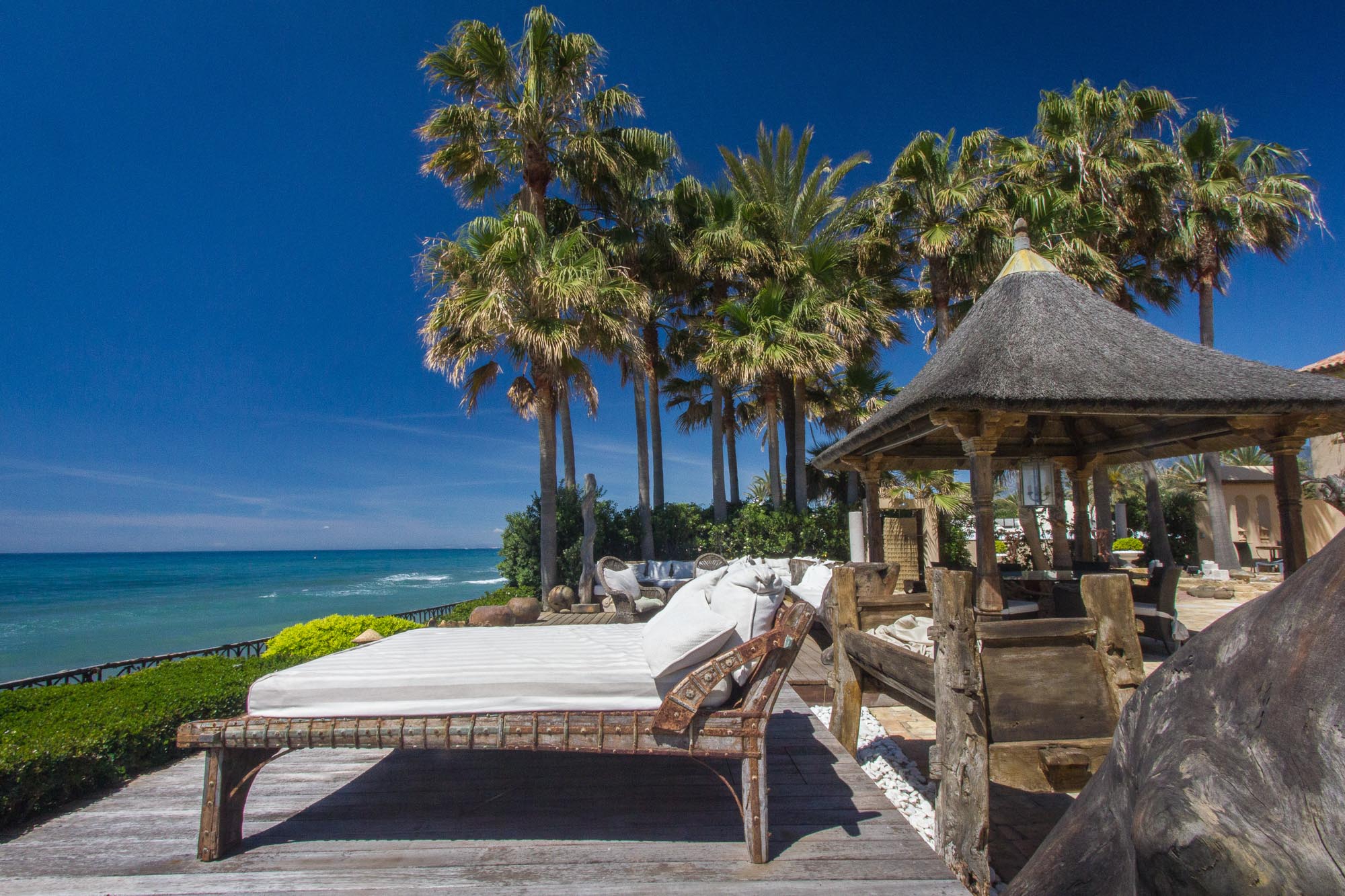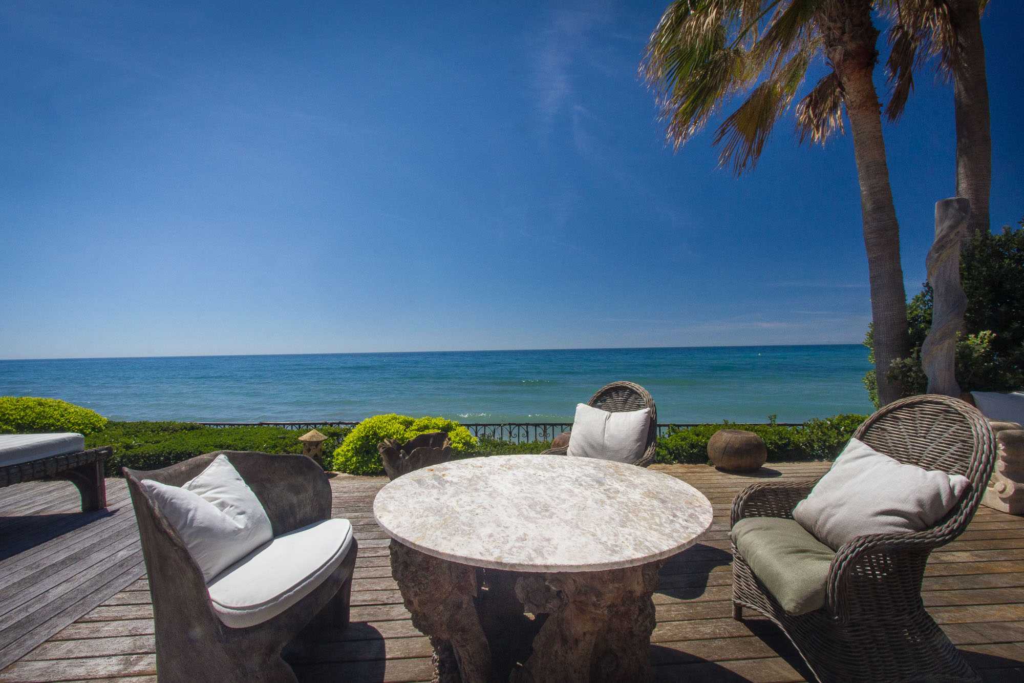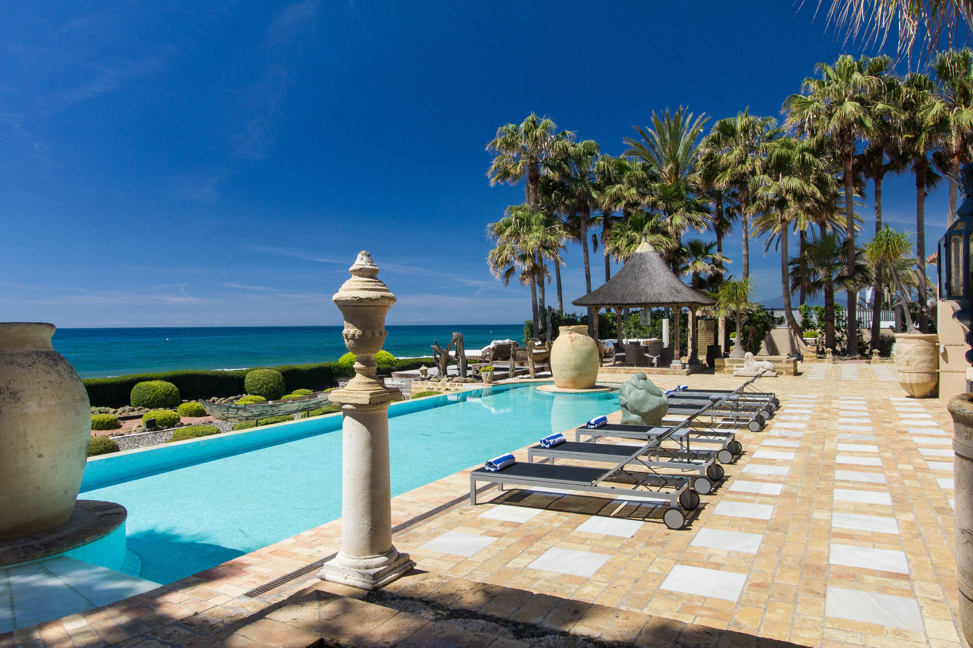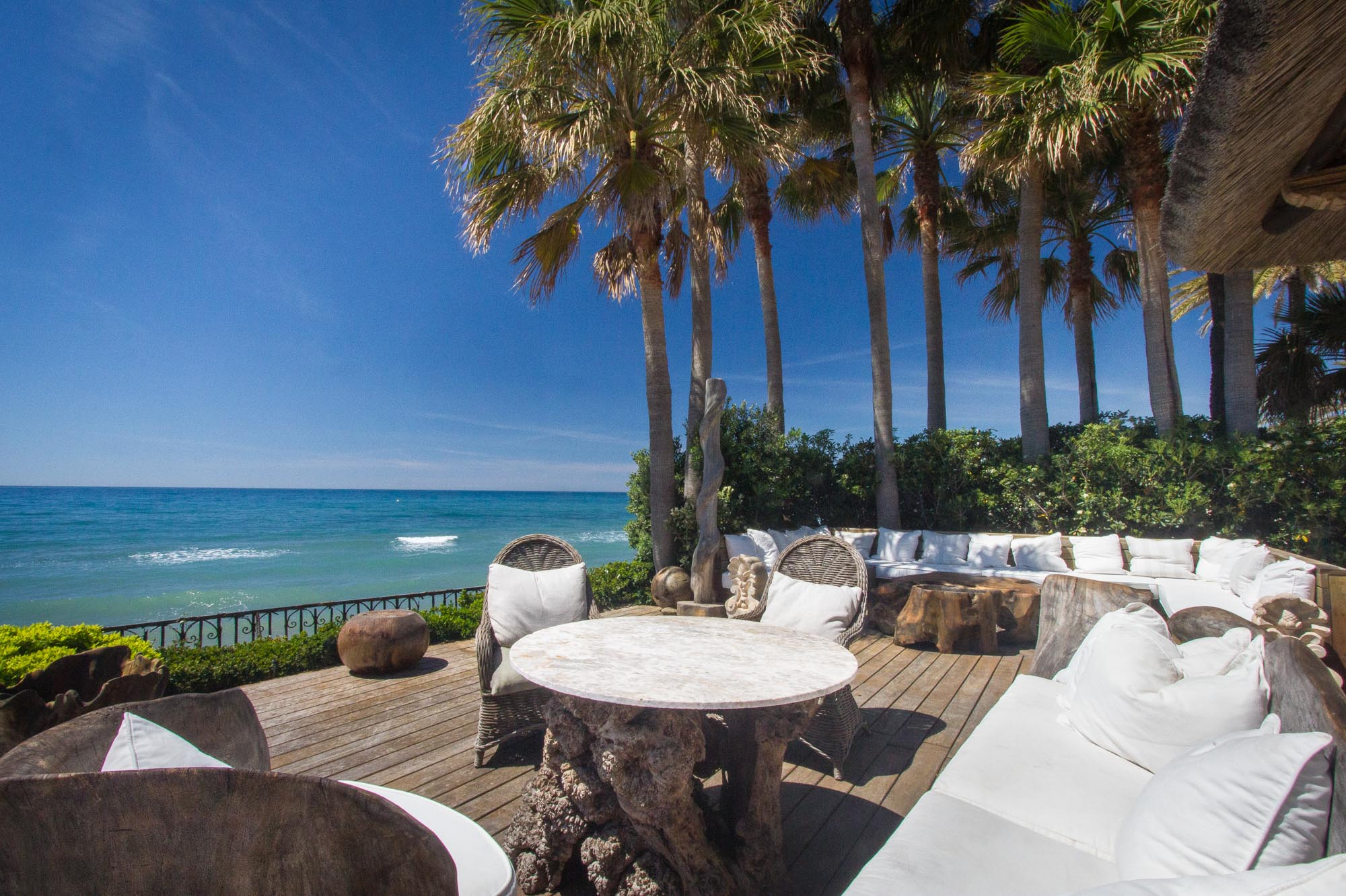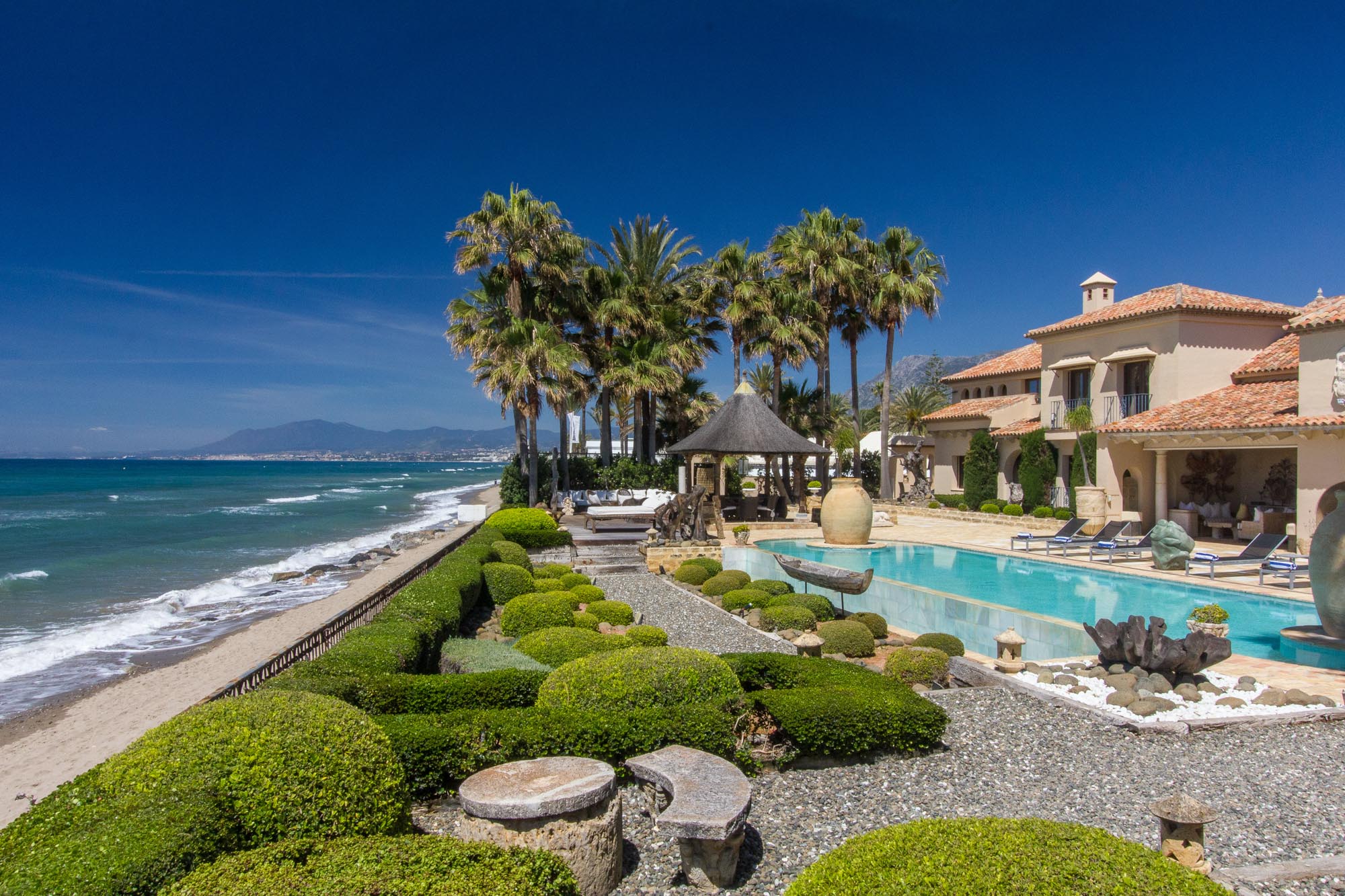 The owner transformed this beachside mansion into an exquisite Mediterranean villa of five-star Spanish style, with grand cathedral ceilings, stately stone fireplaces, and treasured art and antiques around every corner. This is a private luxury beachfront villa in Marbella that’s fit for royalty.