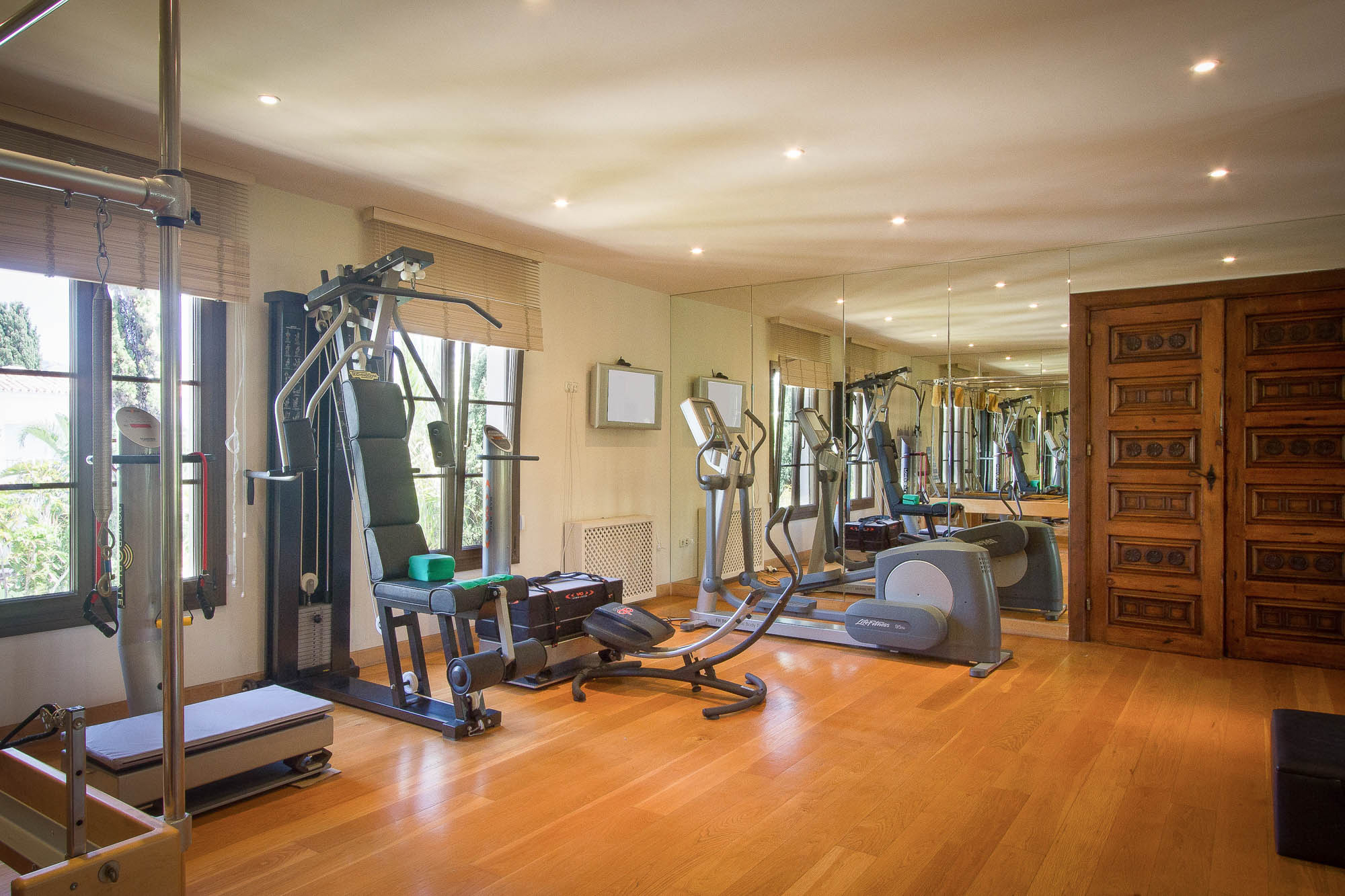 The home spa offers a gym, treatment room, sauna, and Turkish bath, adjacent to the indoor pool with a jet stream for a swim workout.