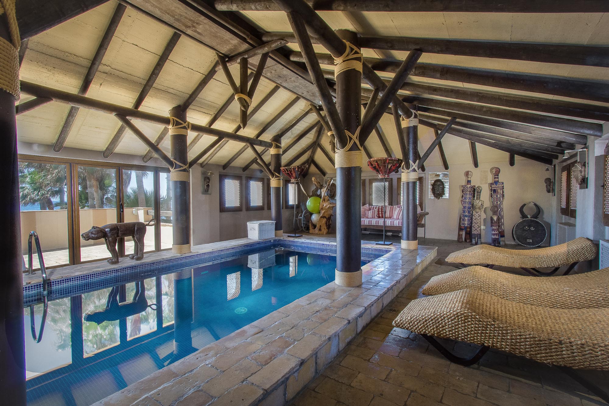 The outdoor, 15-metre saltwater infinity pool offers an uninterrupted view of the Mediterranean Sea, while the indoor pool was also cleverly installed on the top floor to take in the magnificent sea views. Sea-grass sunbeds surround the indoor pool, and a large daybed is perfect for lounging with a good book and a cup of tea. The adjacent sun terrace overlooks the beach and palms below.