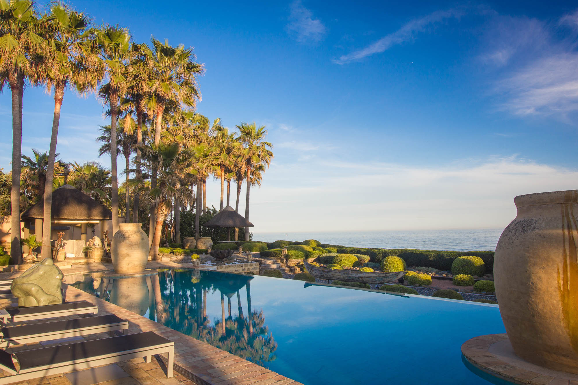 And yet, when you step outside the villa your eyes are immediately drawn to one thing: the view. Every angle, every cushy seat, every lavish space opens onto the sparkling expanse of your private front garden: the vast Mediterranean Sea, recessed below the villa’s bluff-top location, its white-capped waves pointing the way to a distant Morocco.