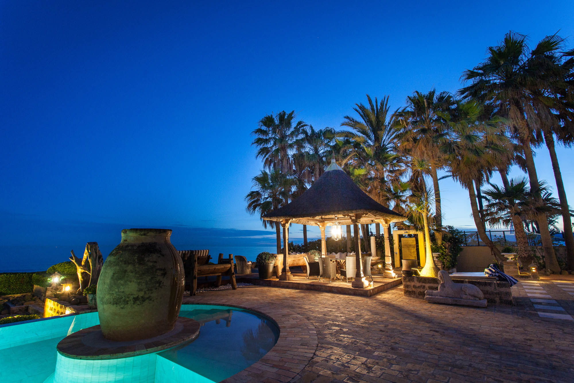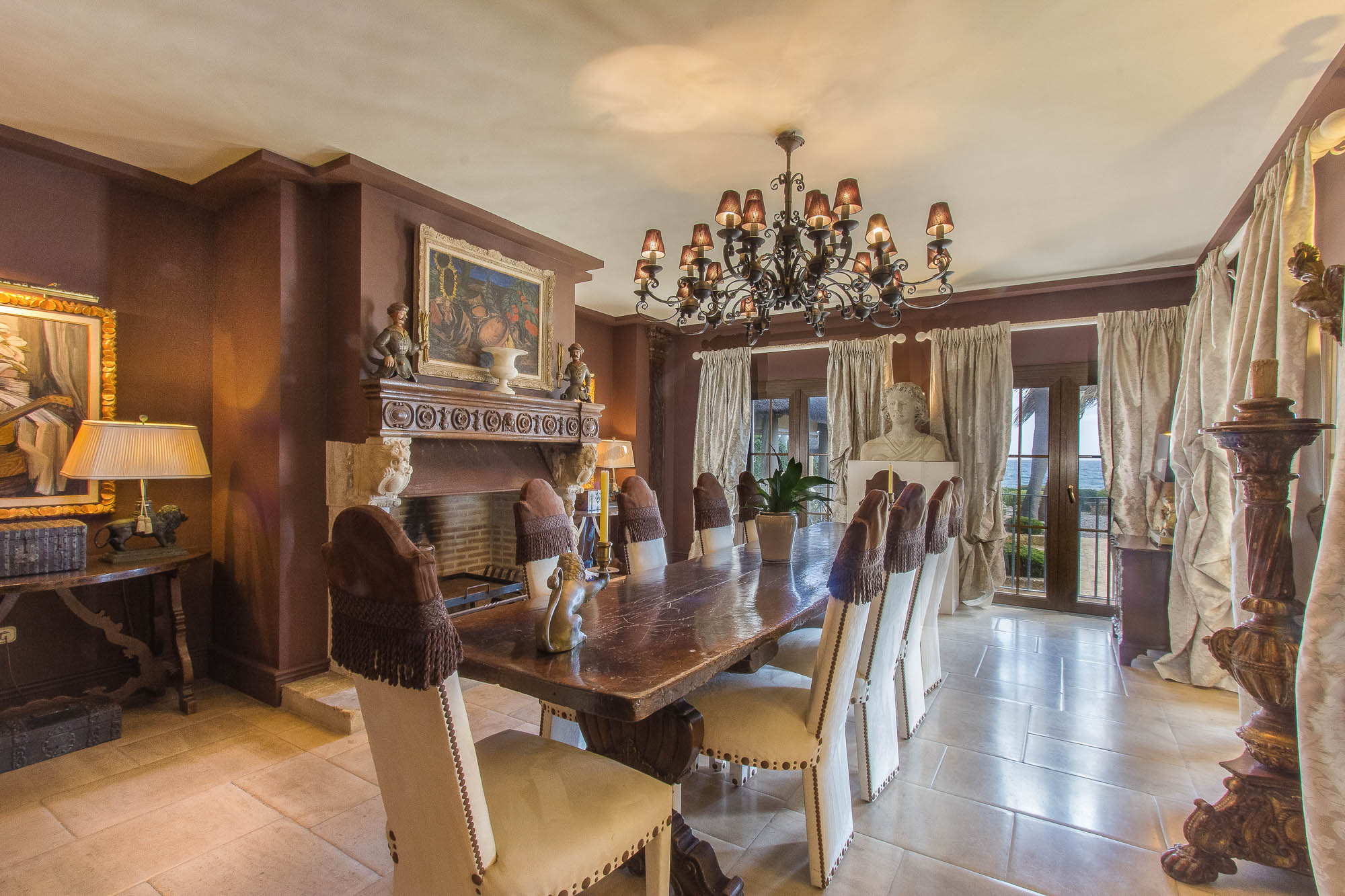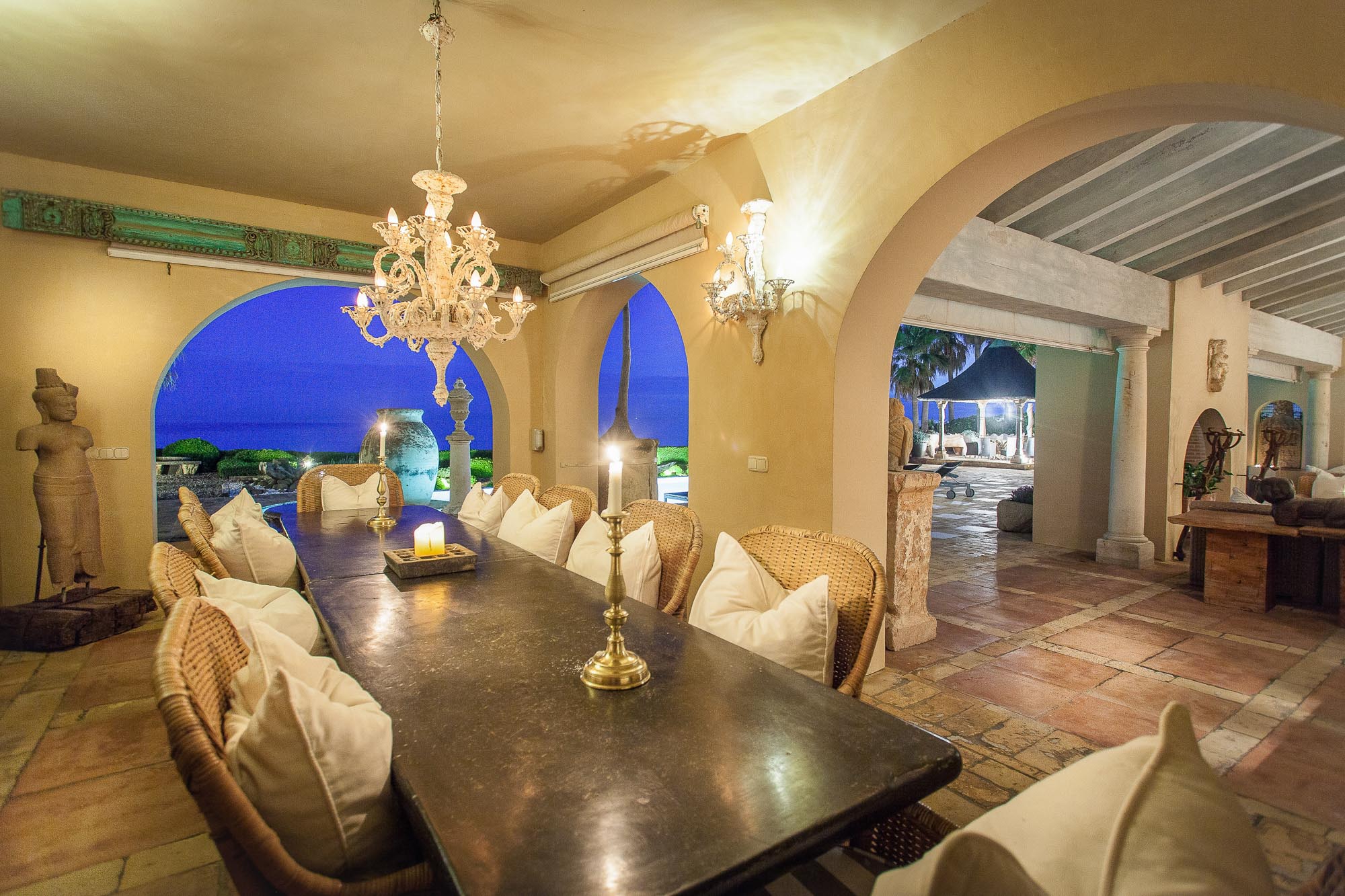 Villa Las Artes offers as many dining options as it does bedrooms. Overlooking the Mediterranean, the formal winter dining room is an impressive space decorated in a palette of chocolate and cream, with an antique table, impressive hearth and Andalucian candelabra.