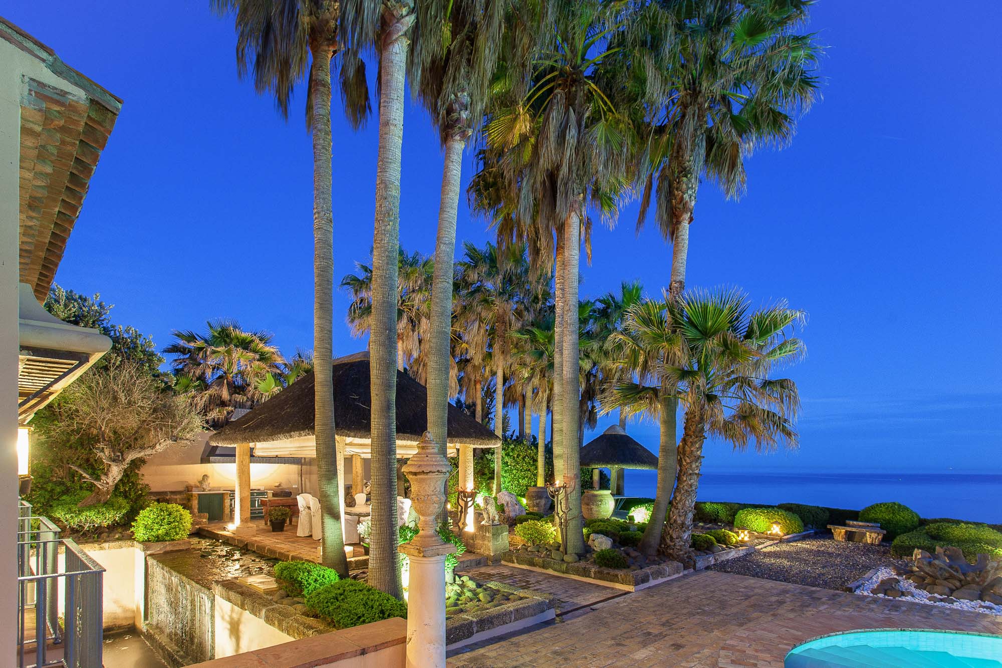 There are dozens of spaces and ways to enjoy this view. Sunbathe in a plush lounger or take cover on the shaded patio; four separate seating and dining areas follow the path of sun and shade throughout the day. Dive into the refreshing depths of your private saltwater pool, its infinity edge seemingly evaporating into the sea below. Stroll through tranquil landscaped gardens, where water features make for a stylish modern nod to ancient Roman aqueducts, their wash-bowl fountains alive with koi and water lilies.