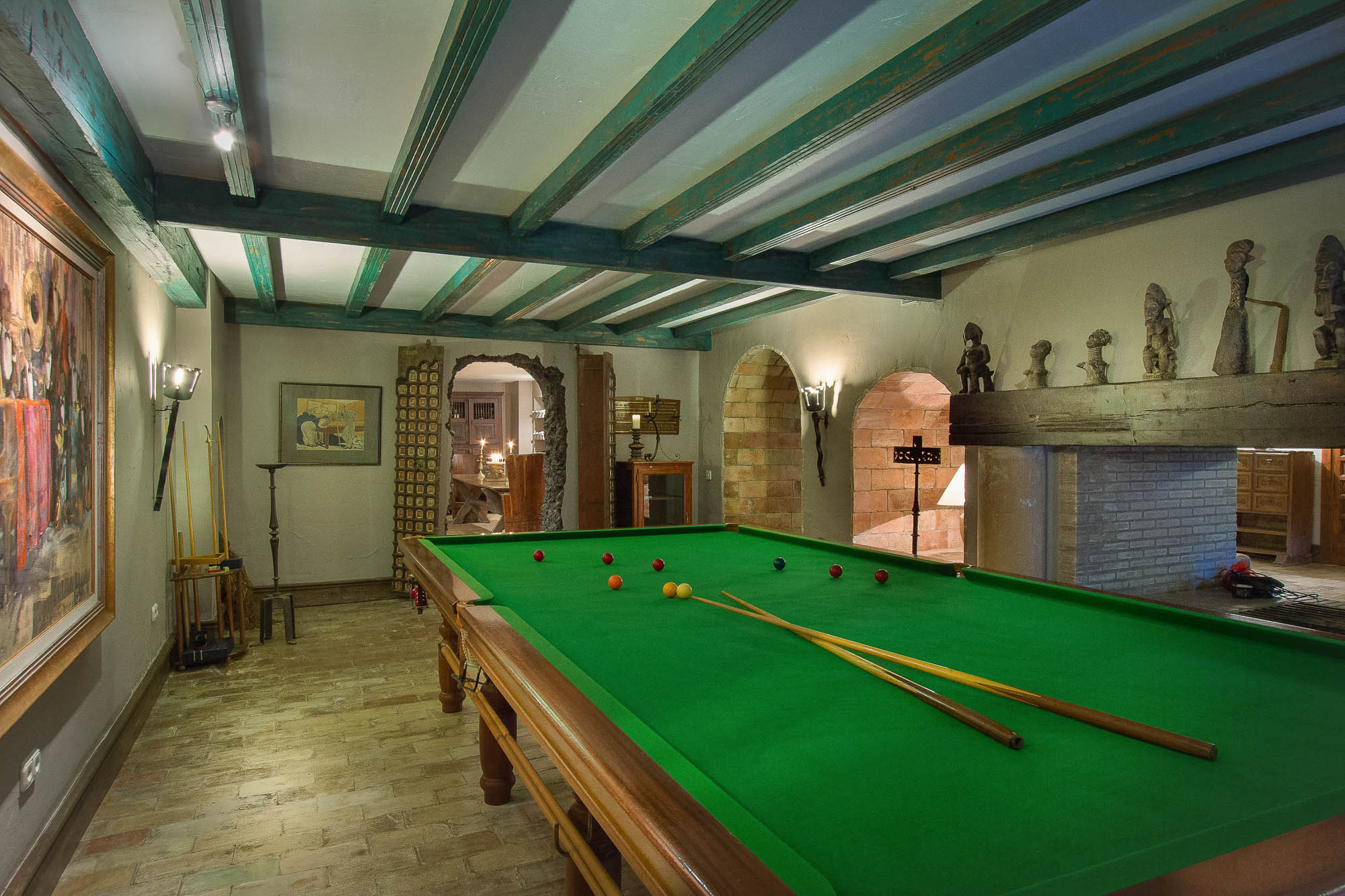 Downstairs, the basement is entertainment central, decorated with 1940s jazz club art and offering a large slate-bed snooker table, cinema lounge, and climate-controlled bodega with bar. Windows reveal Roman water features from the pool just above.