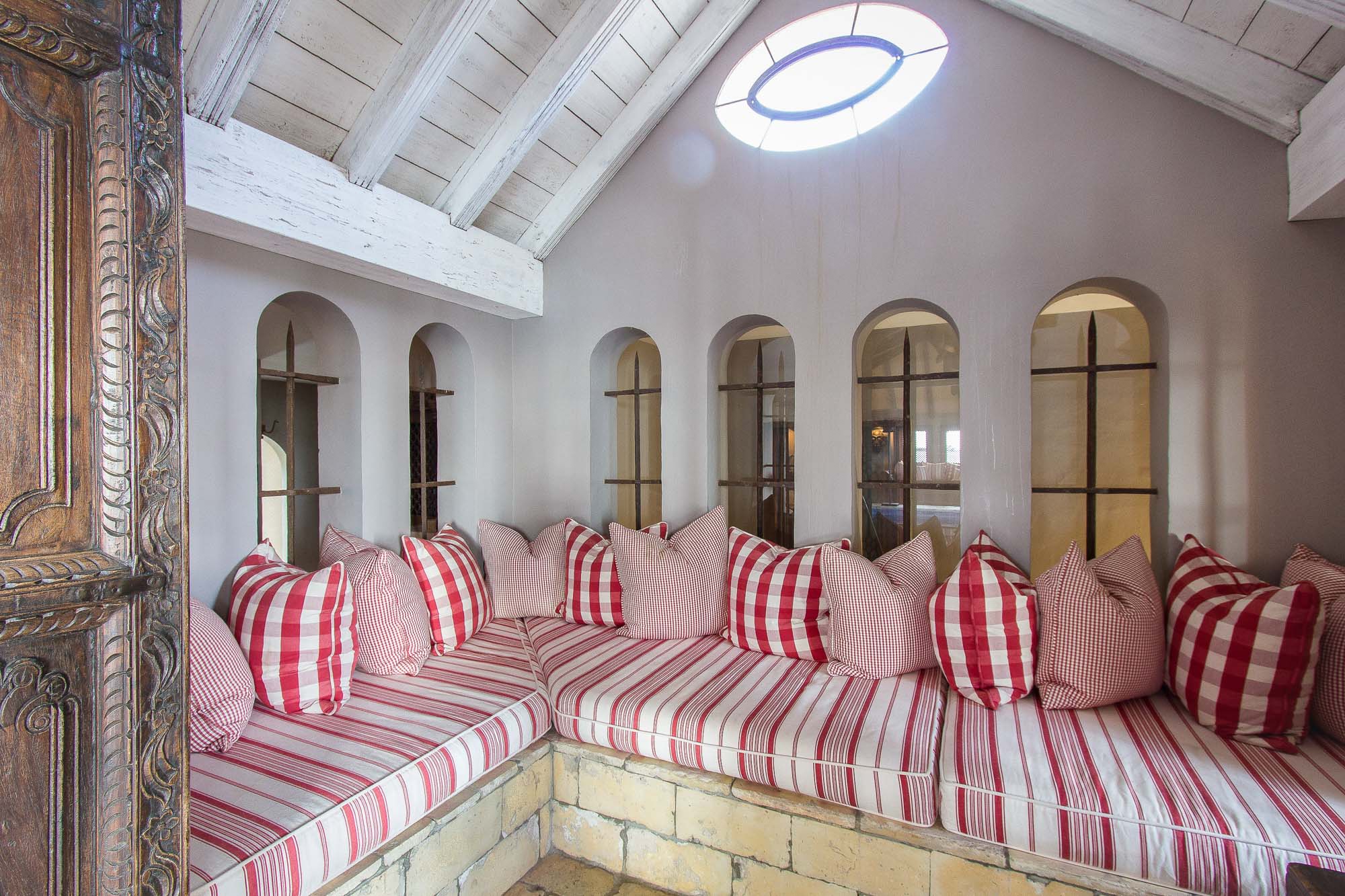 The main living area has a real sense of grandeur, thanks to its cathedral-like, vaulted ceiling, Bechstein piano, masterworks of art and superb décor. Rose-coloured chairs surround an enormous stone fireplace. A secondary living space – the ‘snug’ – is the cosy heart of the home, with soft leather chairs, a second stone fireplace, a large TV and surround sound system.