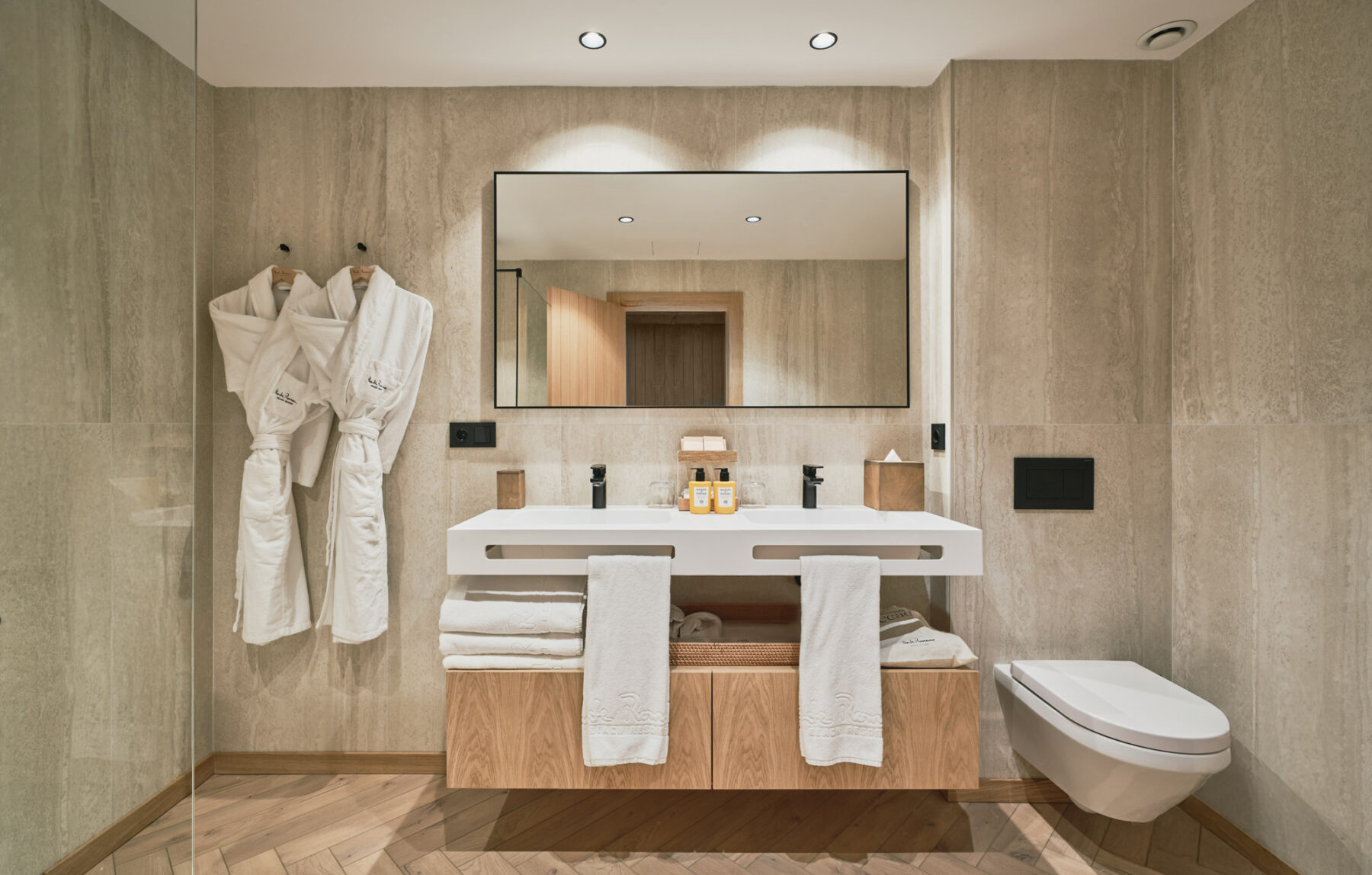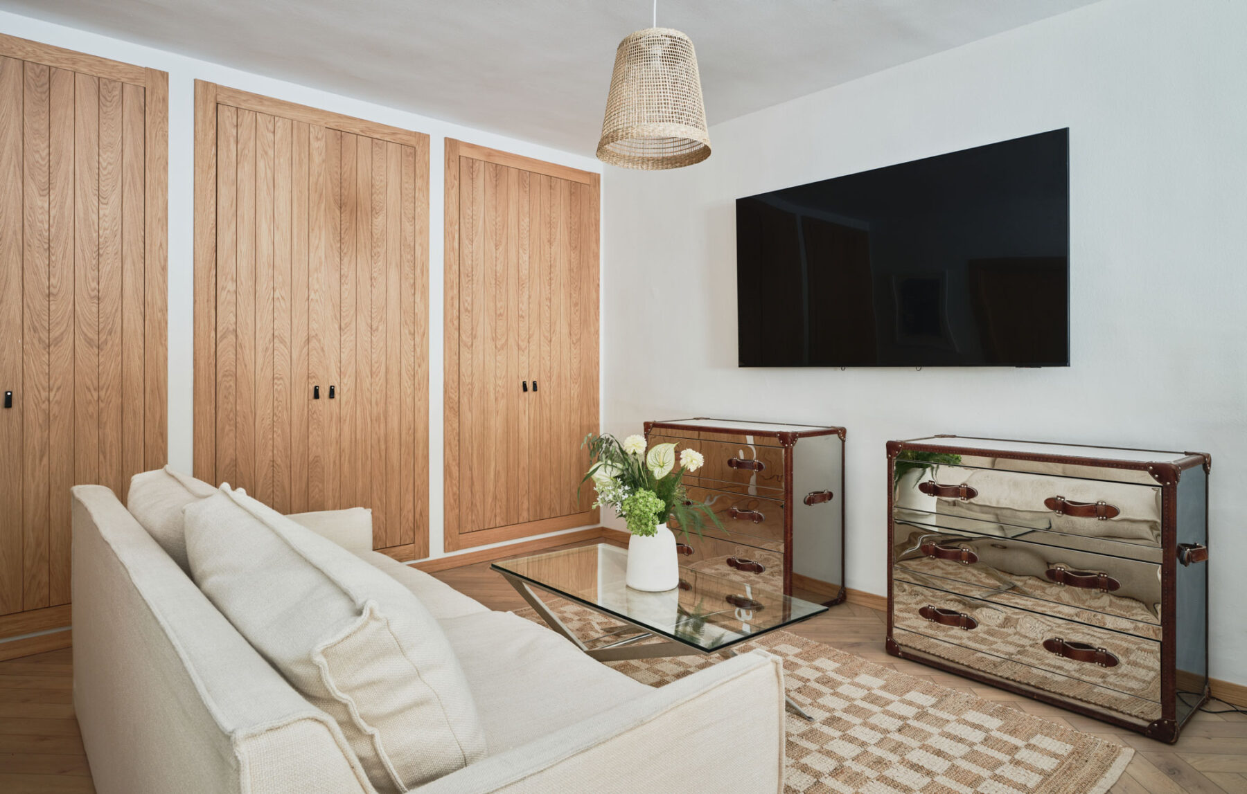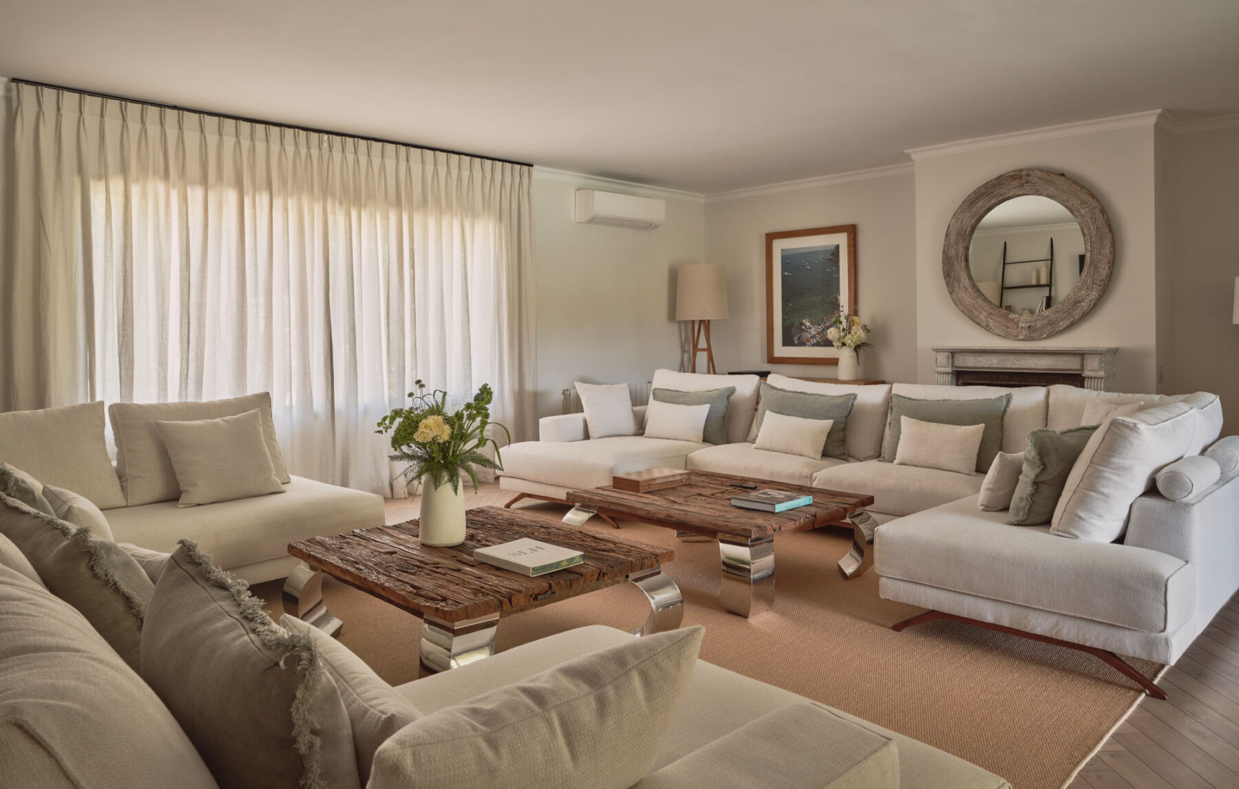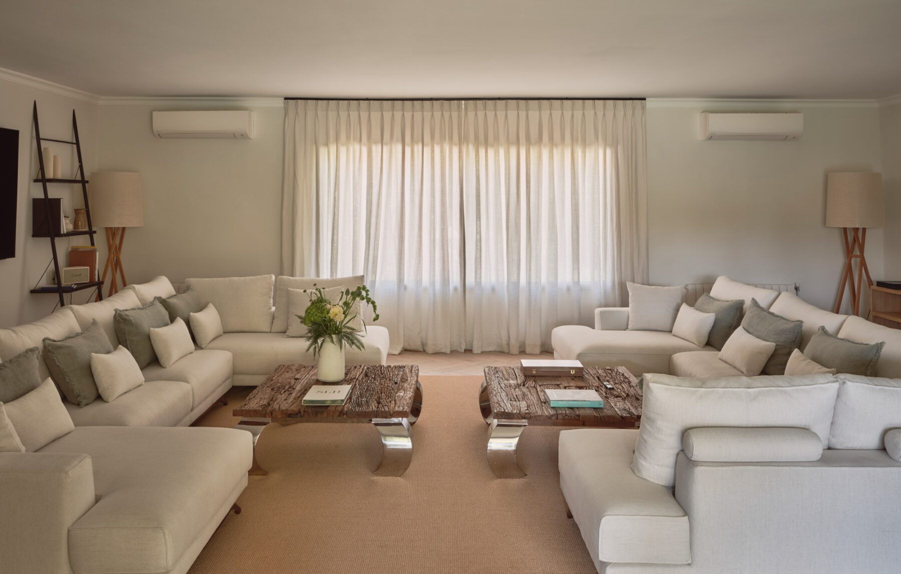 The main living room at Villa Lorenea is a spacious 68m² area with herringbone floors, neutral tones and clean-lined design. Two large L-shaped sofas face each other across a central fireplace with a wall-mounted TV above – perfect for relaxed evenings in.