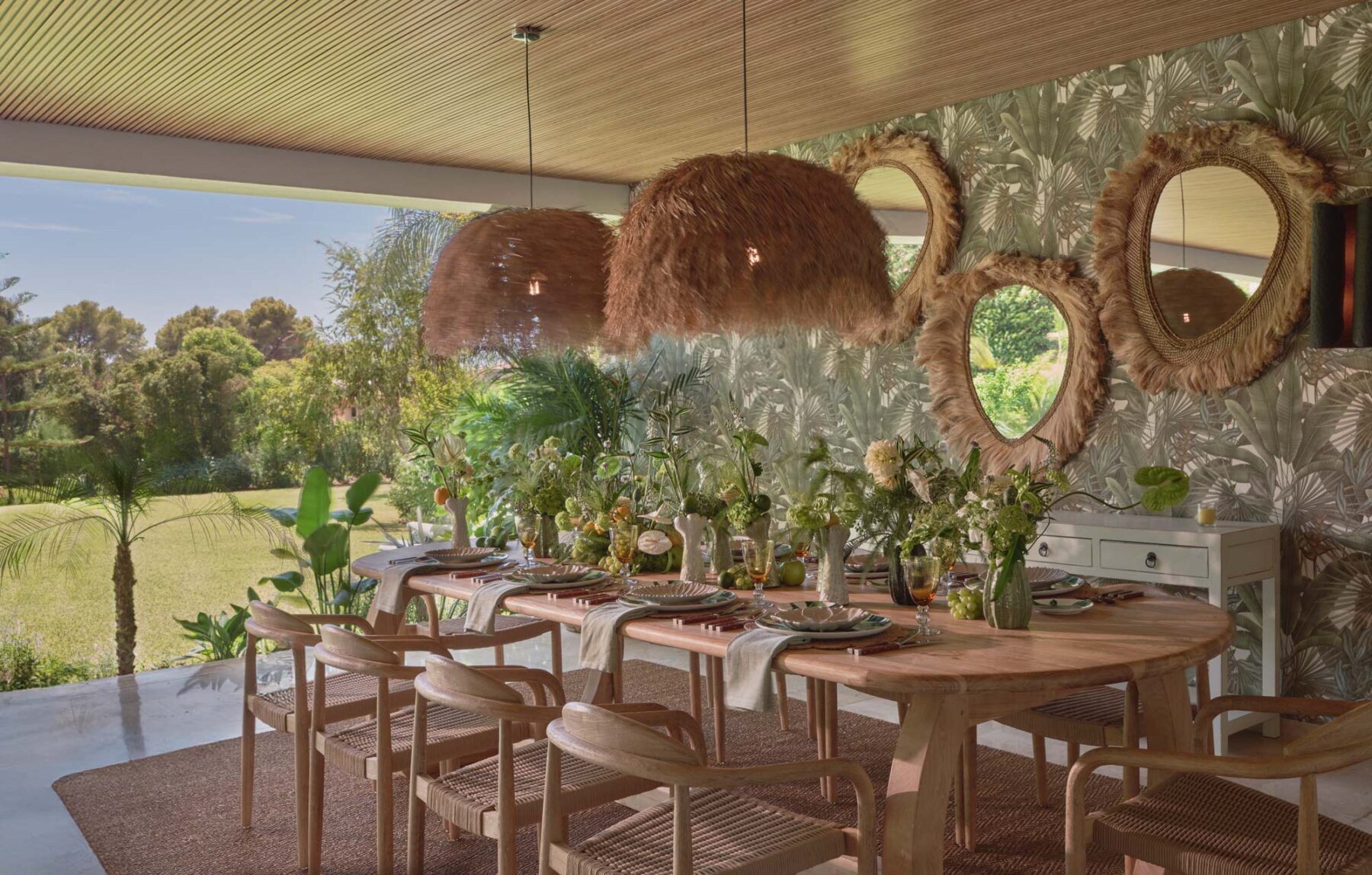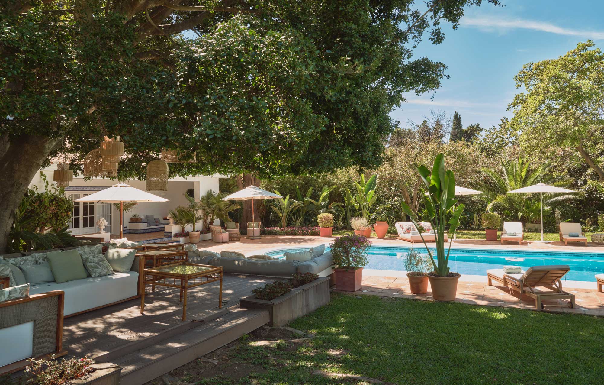 Framed by mature planting and wide lawns, the outdoor spaces at Villa Lorenea offer multiple zones to enjoy throughout the day. A south-facing terrace runs along the back of the house, with shaded areas for dining and relaxing feeding into the main living spaces.