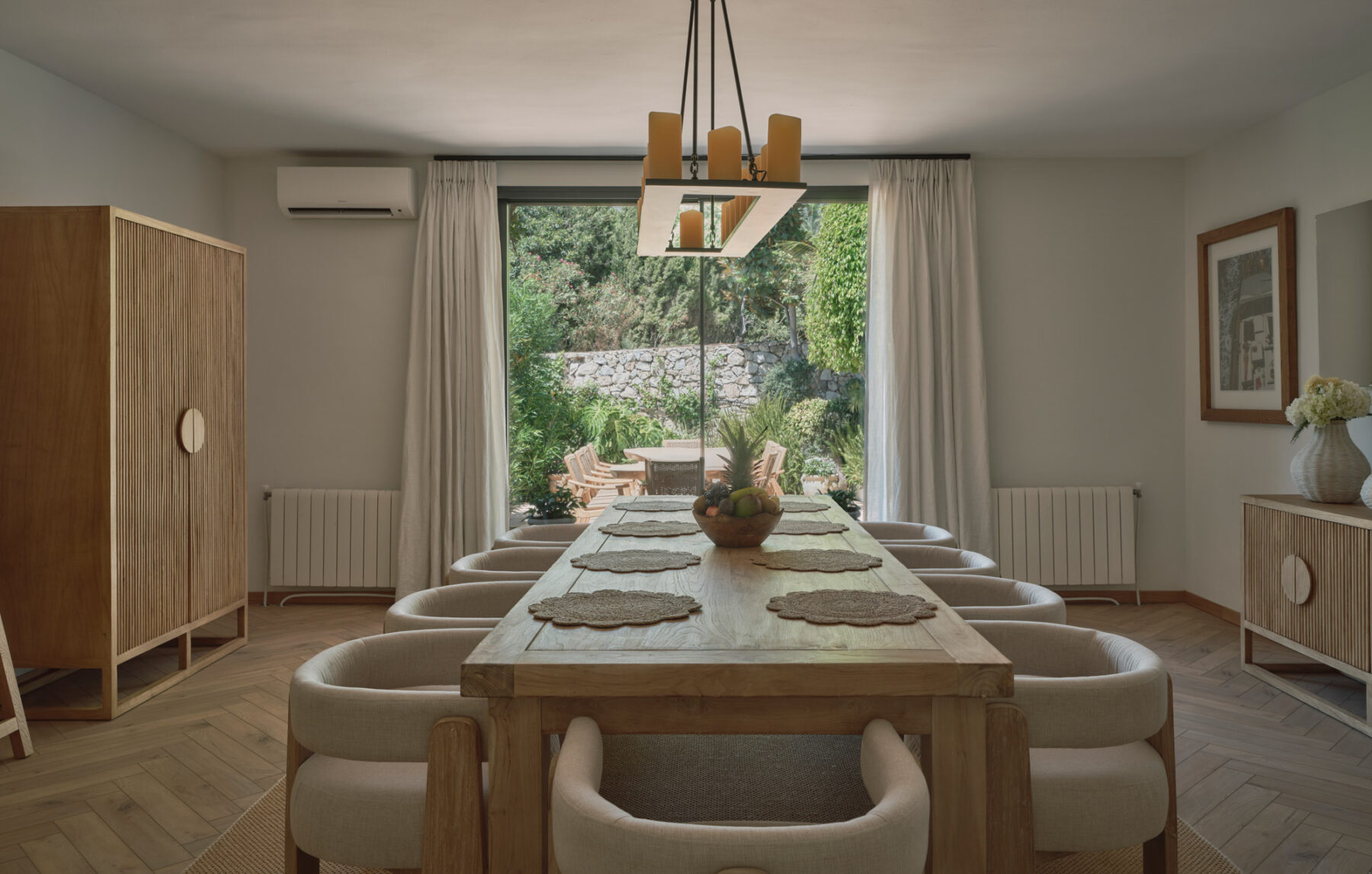 The dining room at Villa Lorenea sits between the kitchen and living area, with a large table positioned beneath a sculptural pendant light. Glazed doors open onto a private outdoor dining terrace, offering an easy switch between indoor and outdoor meals.
