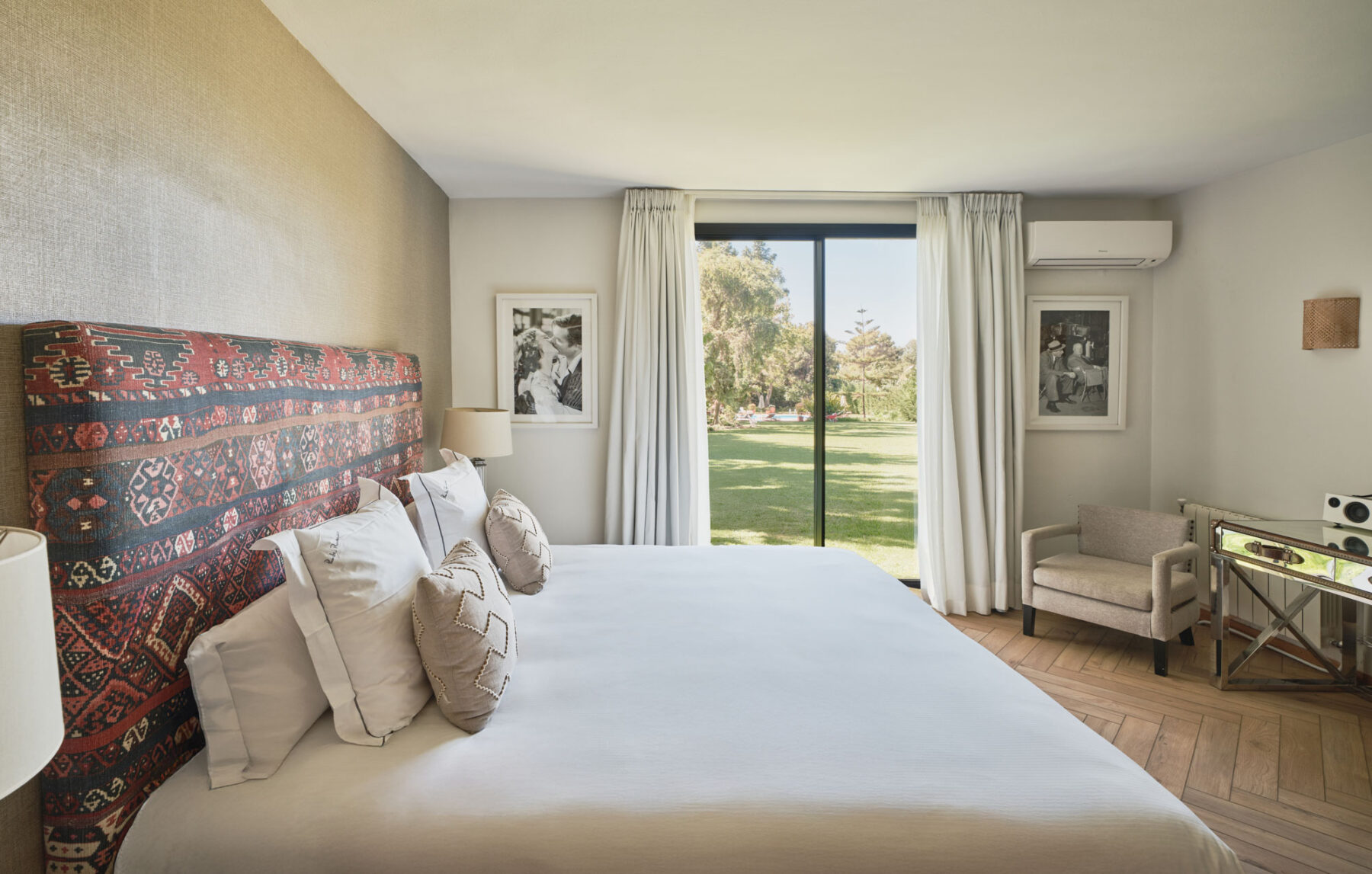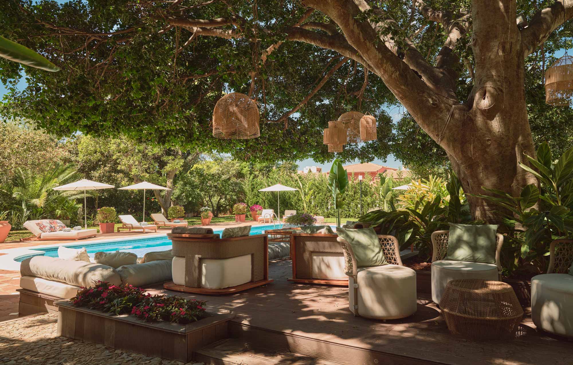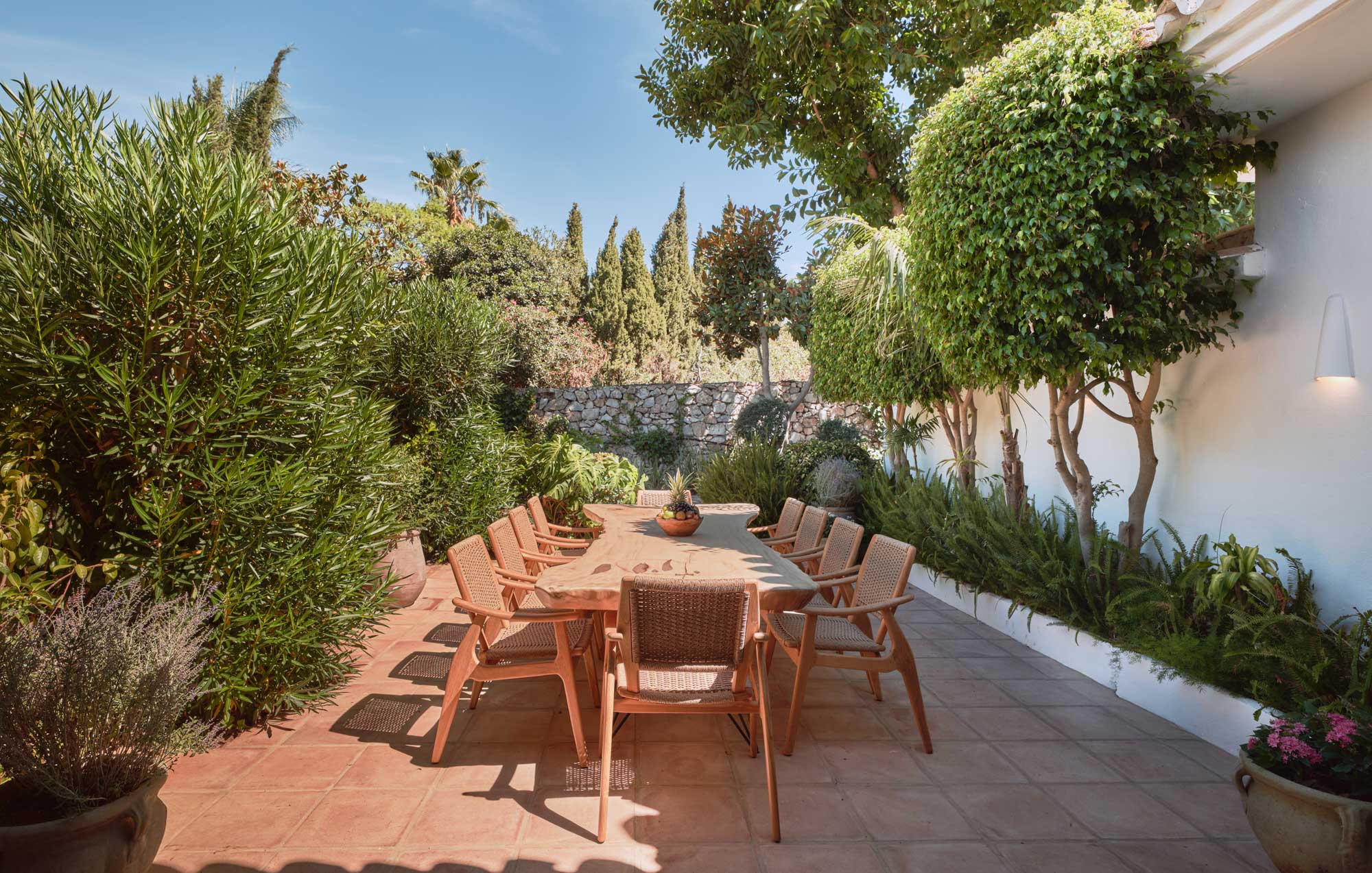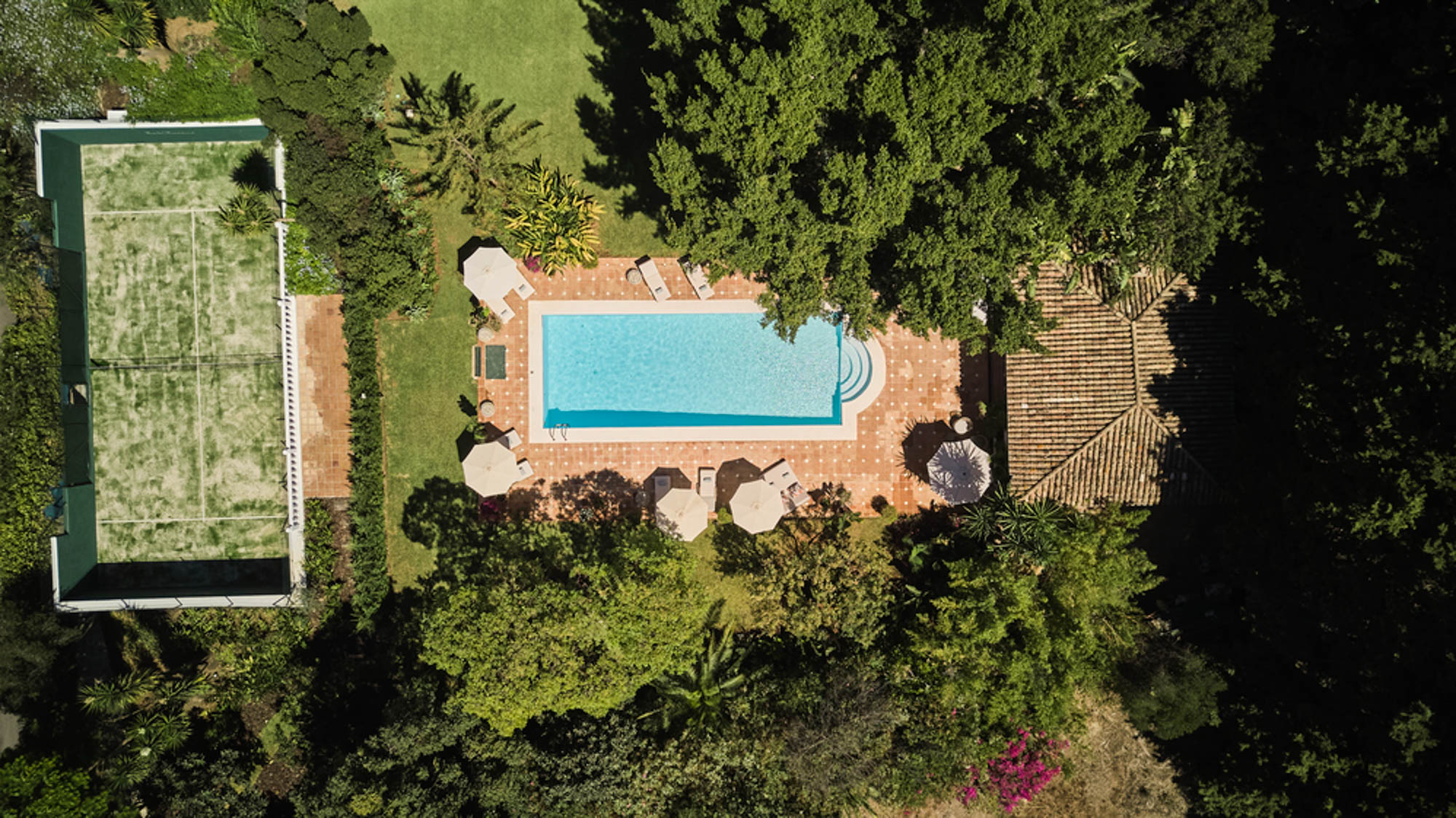 The shaded terraces provide quieter corners to read, work or unwind, while the restored padel court adds a unique focal point for light exercise or casual competition among friends.