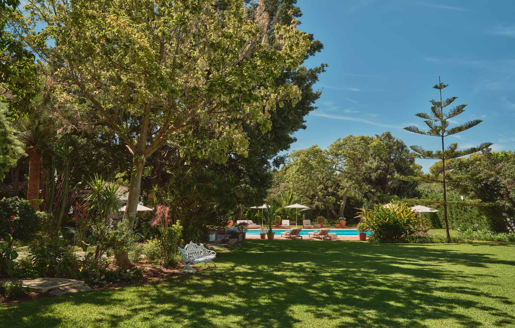 The pool is positioned below the main terrace at the foot of the garden, surrounded by greenery and sun loungers to recline on. A fully restored padel court sits just beyond – a unique facility with heritage value as the first residential court of its kind in Spain.