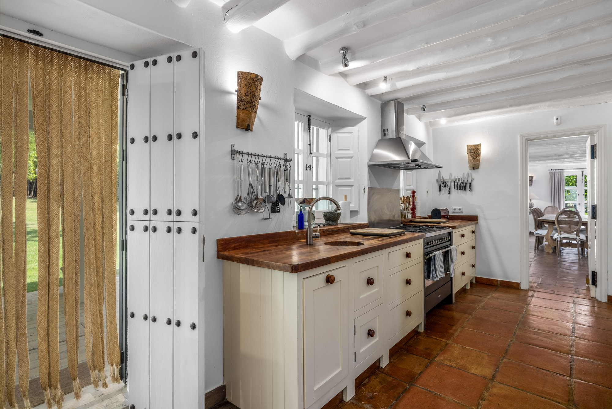 Beautiful interiors with original features: wood ceiling beams felled on the estate, cool terracotta tiles underfoot, and a farmhouse galley kitchen.