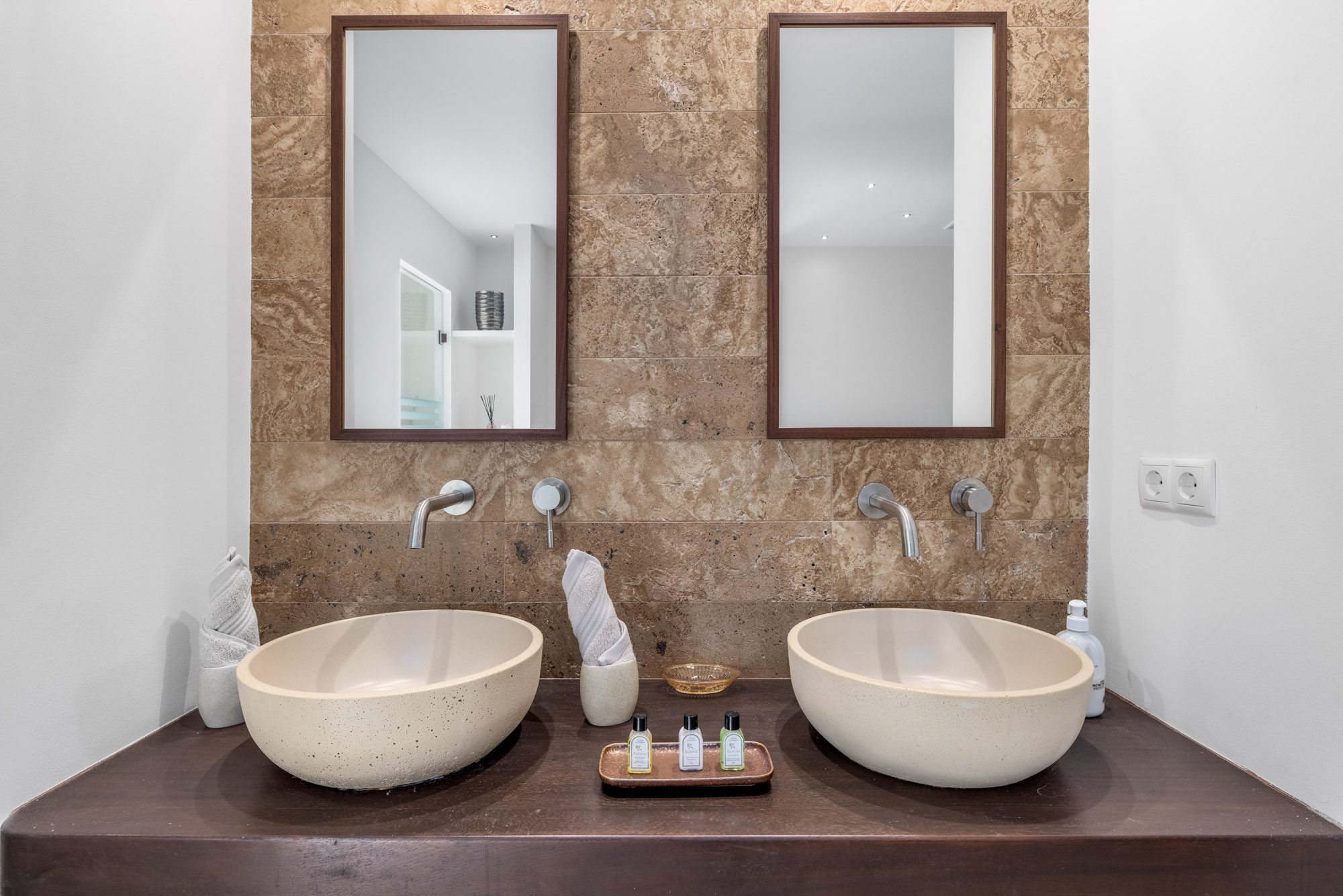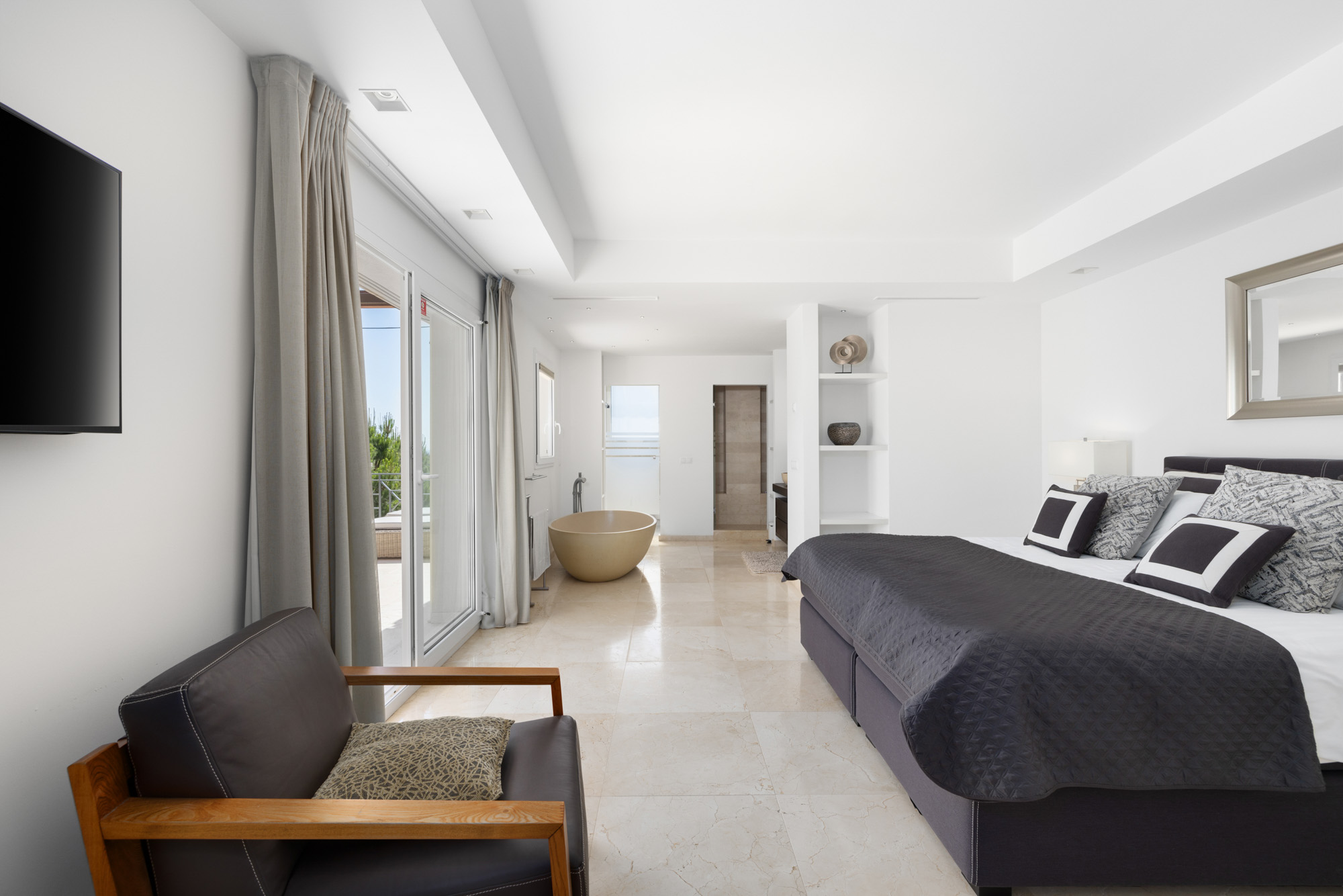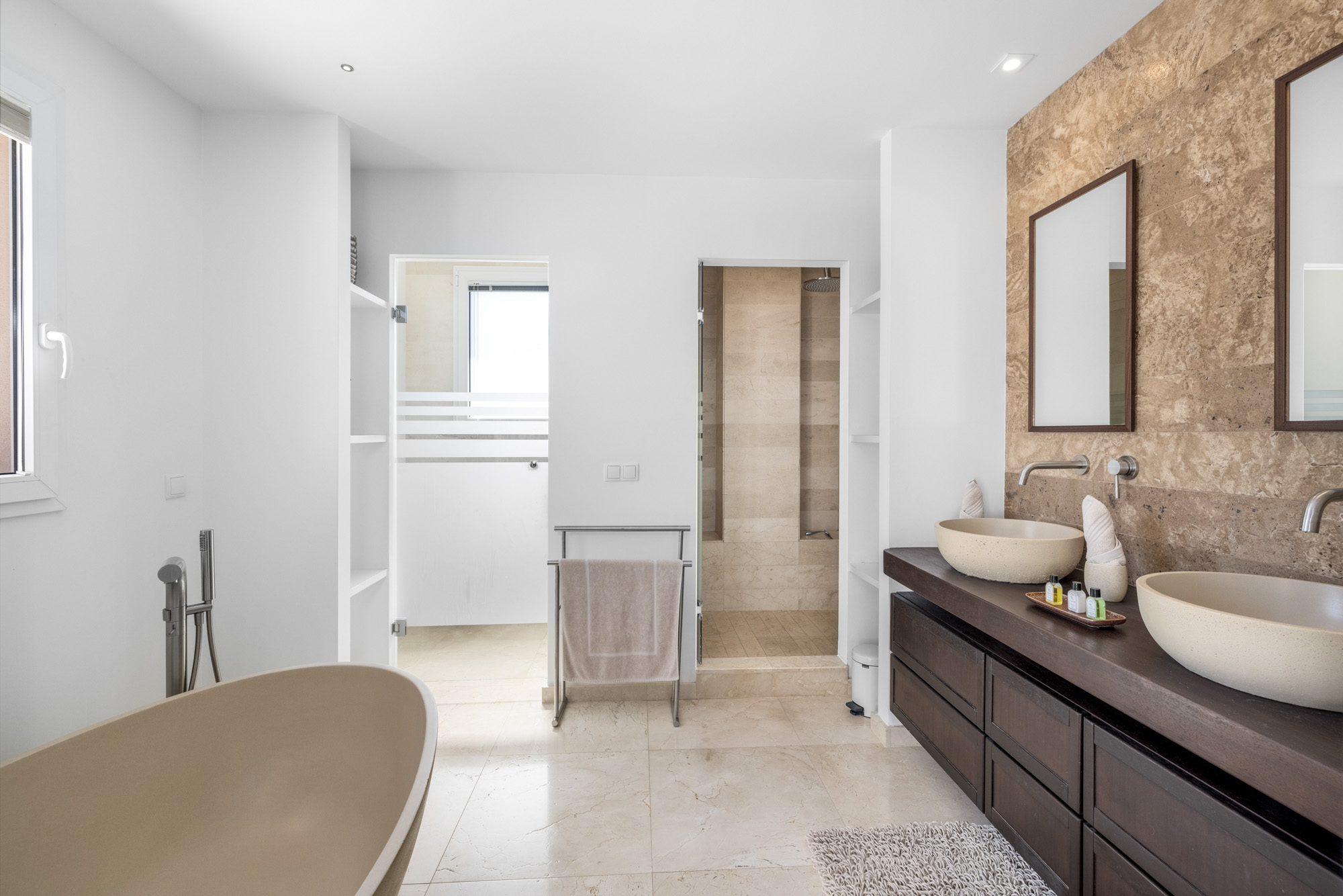 Bedroom 1: The spacious principal suite is located on the top floor of the property and has a private terrace with superb sea views. Comes with a super-king size bed (180x200cm)– which can be split into two twins- and an integrated bathroom with handmade, lava stone bathtub, LED feature lighting, twin basins, walk-in closet, rain shower cubicle and separate loo.