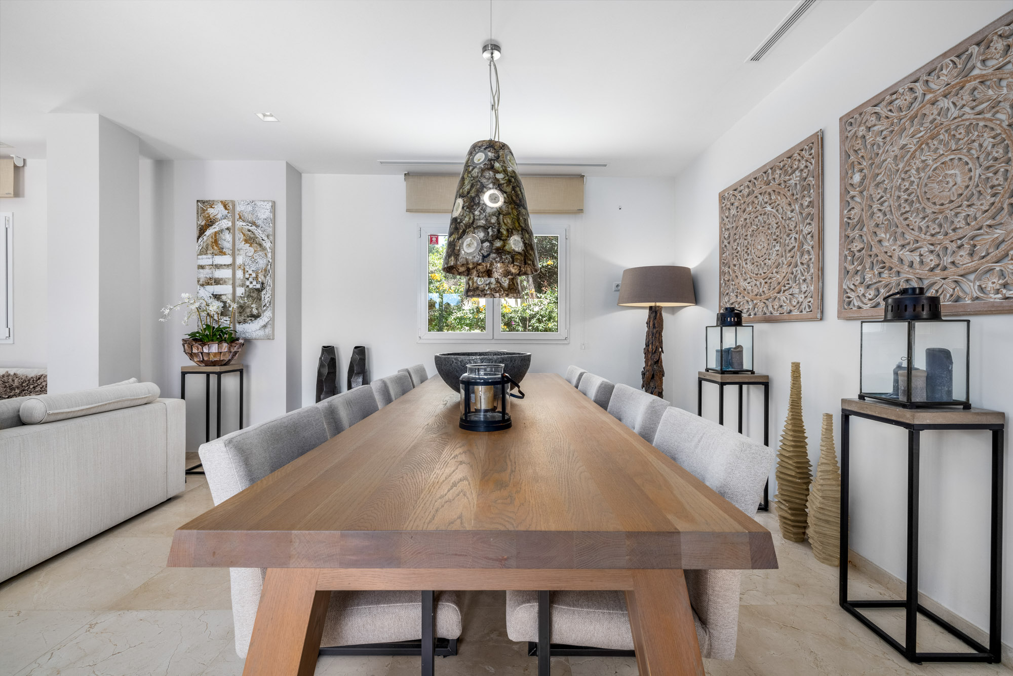 Outside on the pool-facing terrace, additional space for family dining is provided by a long, wooden table with six stylish metal chairs.