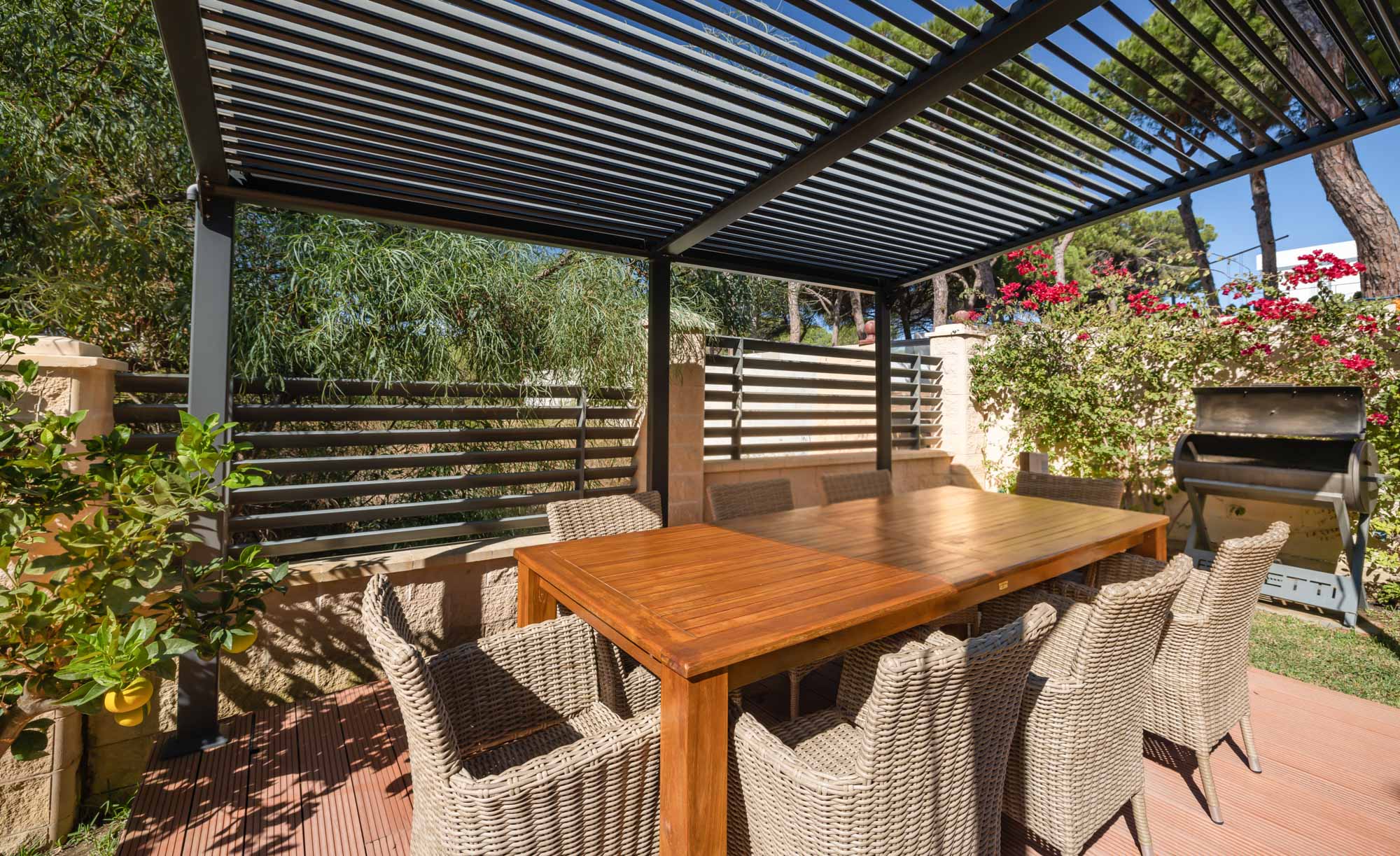 There is also a separate outdoor dining area situated beneath a shaded awning, complete with a large table, eight wicker chairs and a barbeque with ample grill space – ideal for cooking up an al-fresco feast for all the family.