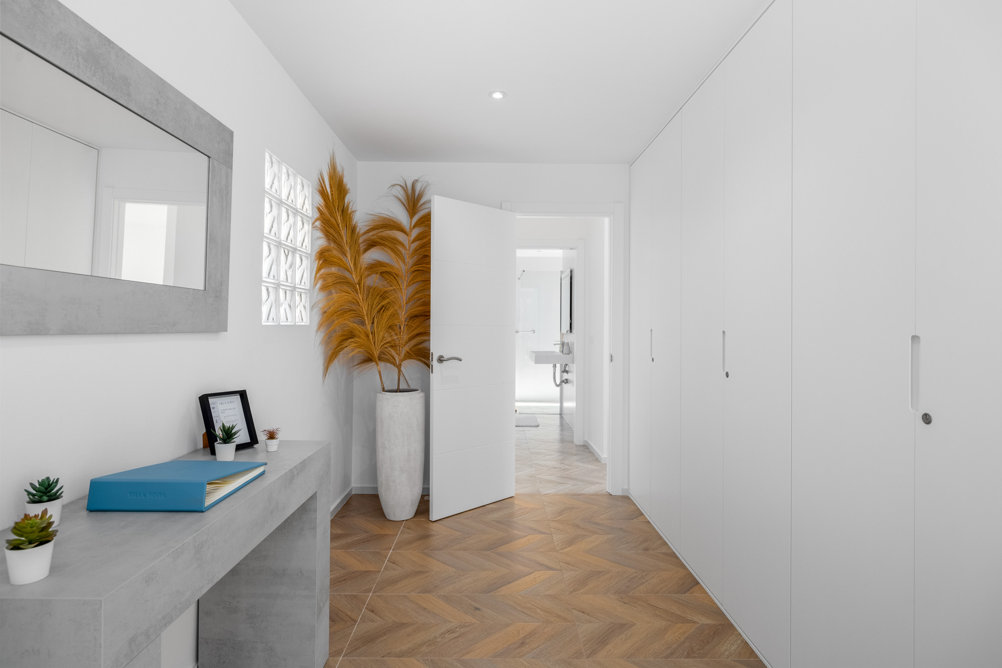 Crisp white lines, nude concrete walls and herringbones-style ceramic flooring set the tone for the villa’s minimalist interiors; warmth enhanced by bold splashes of colourful furnishings, Jarapa natural rugs from the Alpujarras, and ‘Granadino’ artisan esparto grass sculptures and paintings by local artists.